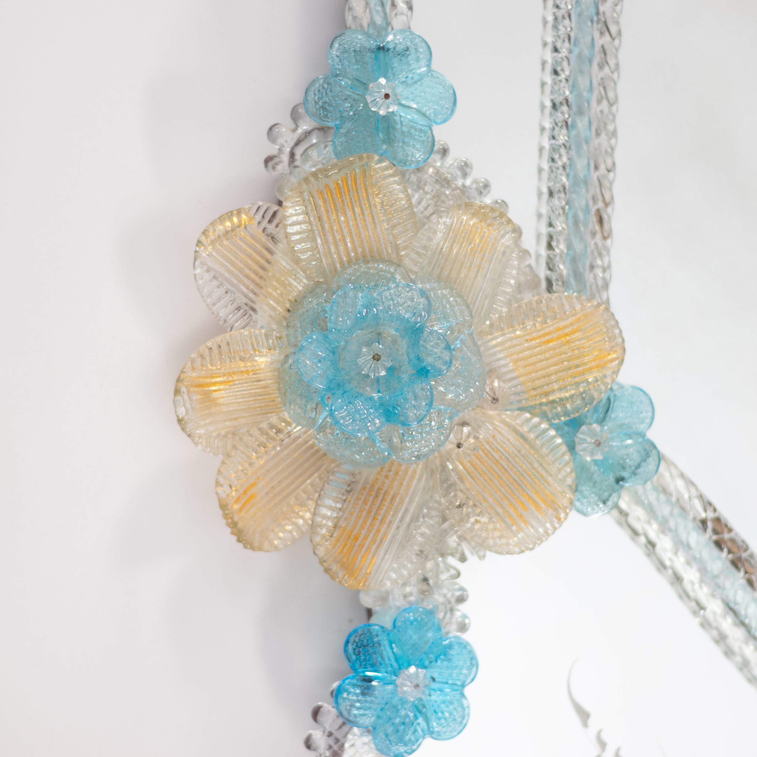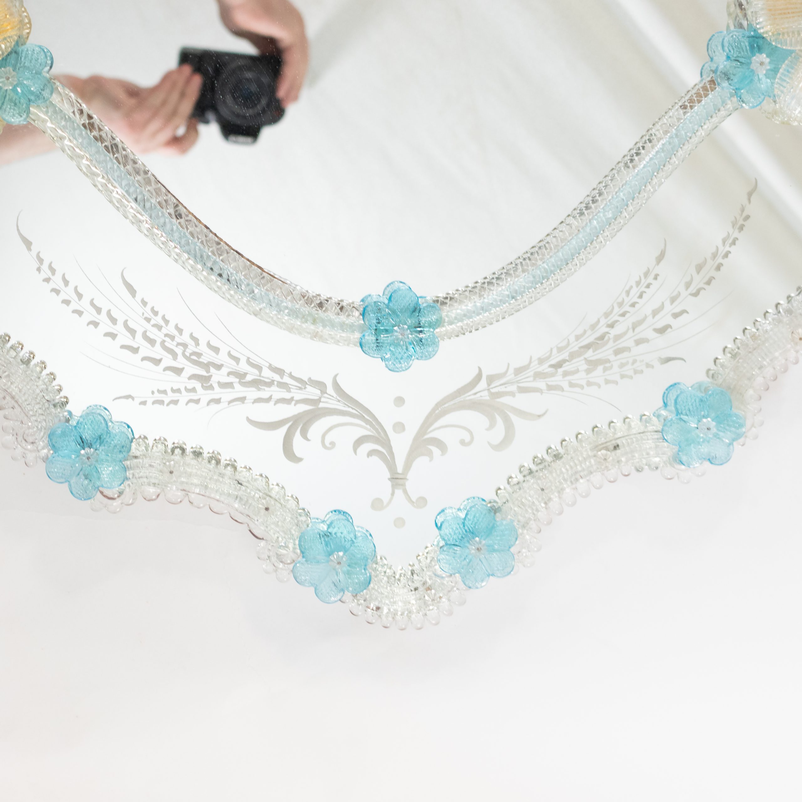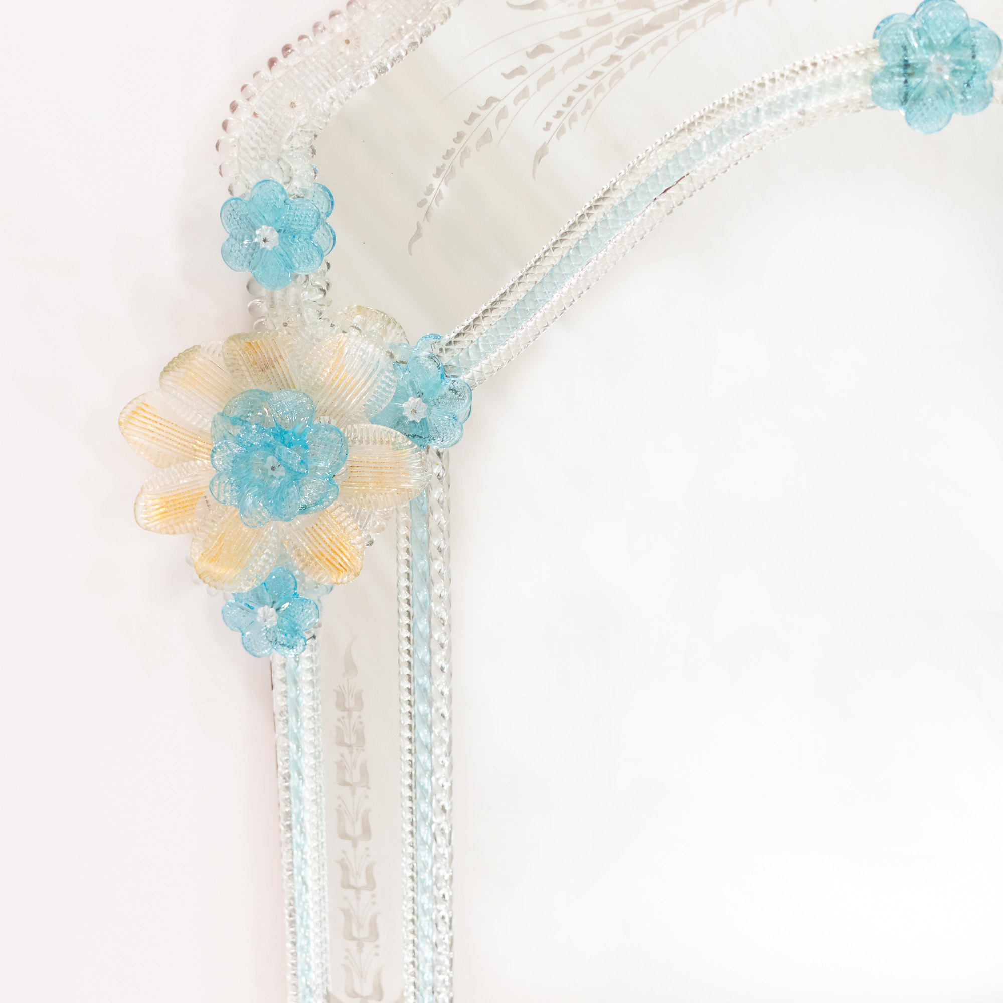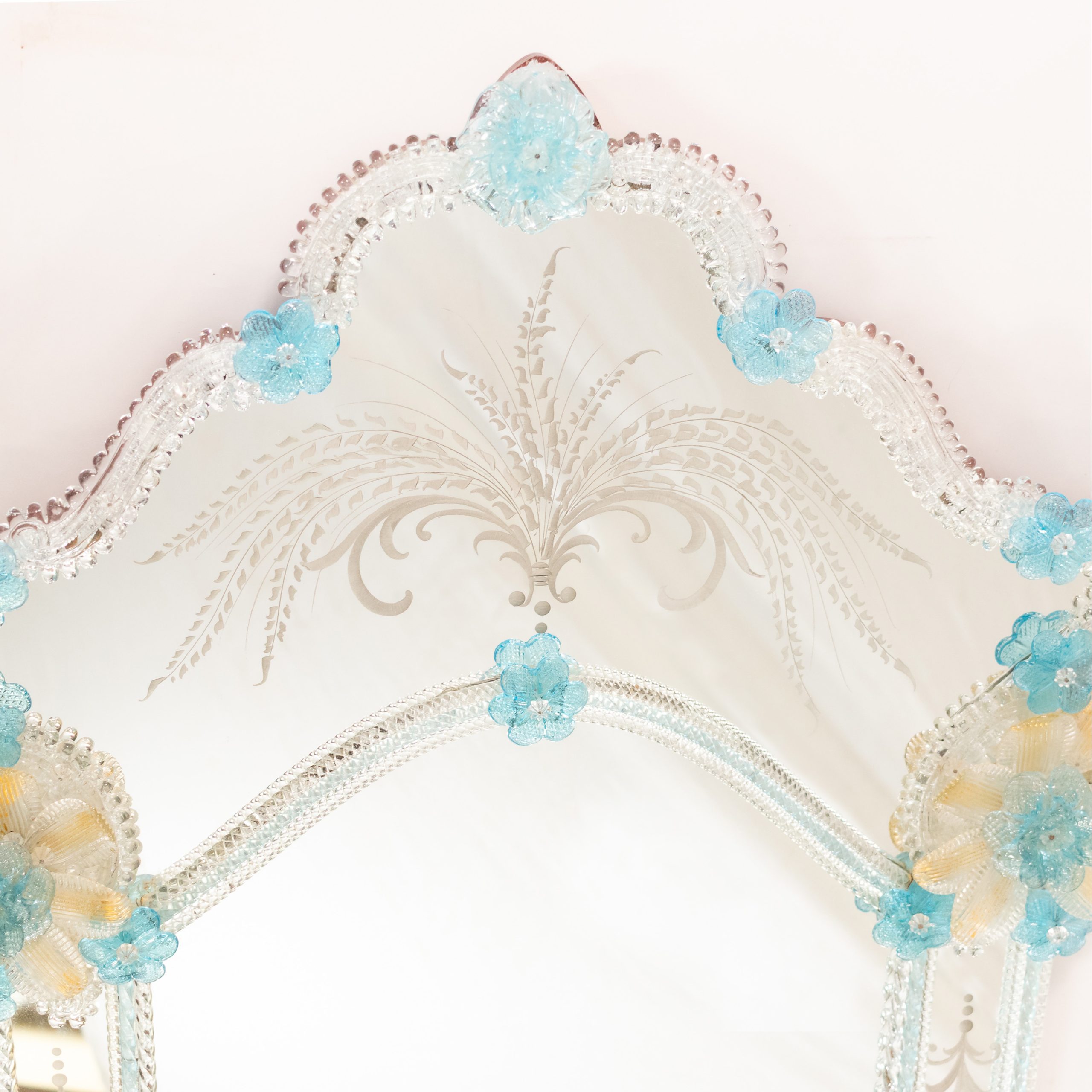 A lovely 49-inch tall mid‑century Venetian Murano glass wall mirror, adorned with hand‑applied aqua glass blossoms with layered, gold‑infused petals that catch and refract the light in a subtle shimmer. The elongated, scalloped silhouette features etched decoration for a romantic Venetian touch, while the light aqua tones sit within rope‑twisted and bead‑textured Murano glass trim. The mirror is mounted on a shaped wooden back with a central sawtooth hanger, ready to install. It works beautifully as a statement piece over a console in an entryway, above a bedroom dresser, or as a jewel‑like focal point in a powder room, dressing room, or vanity area.