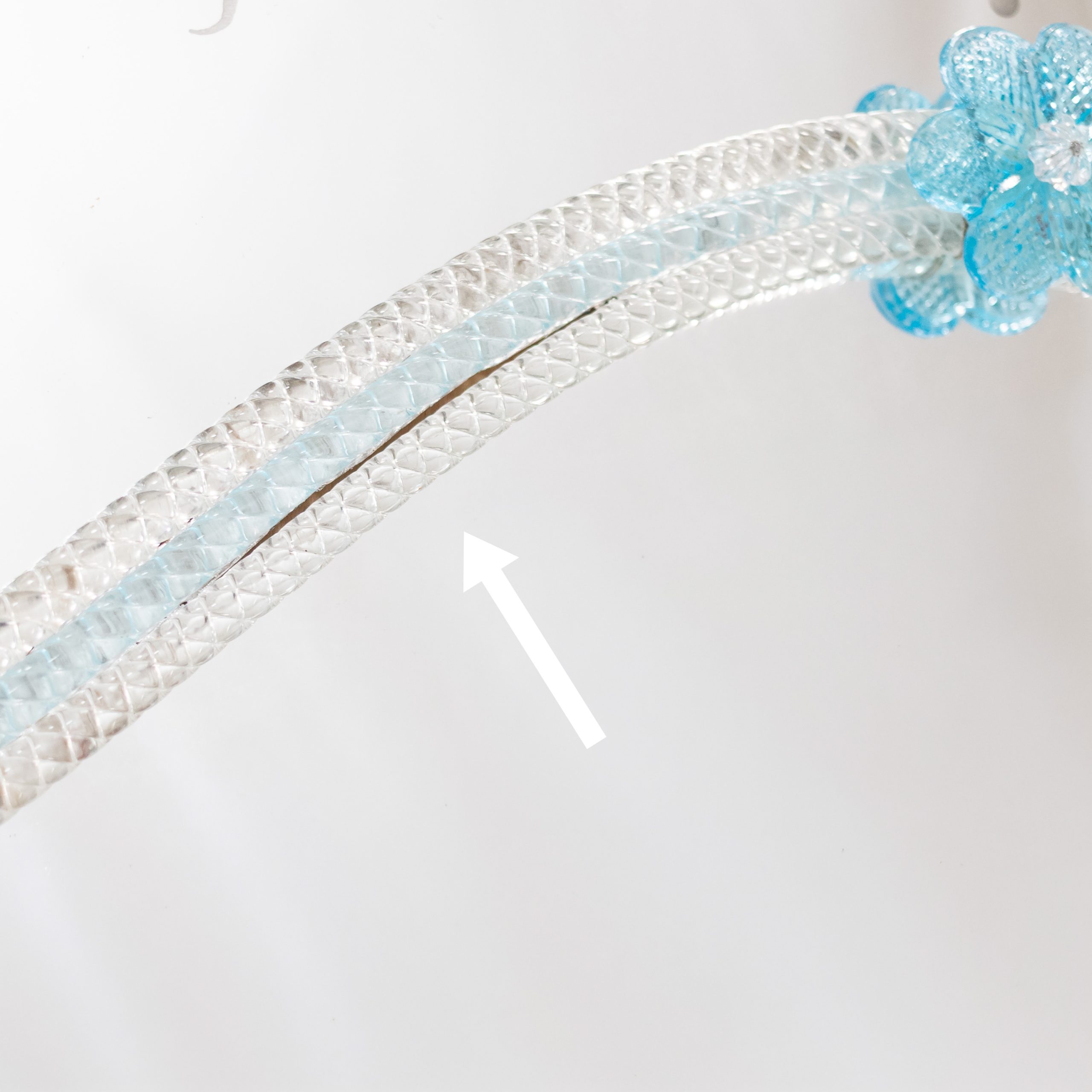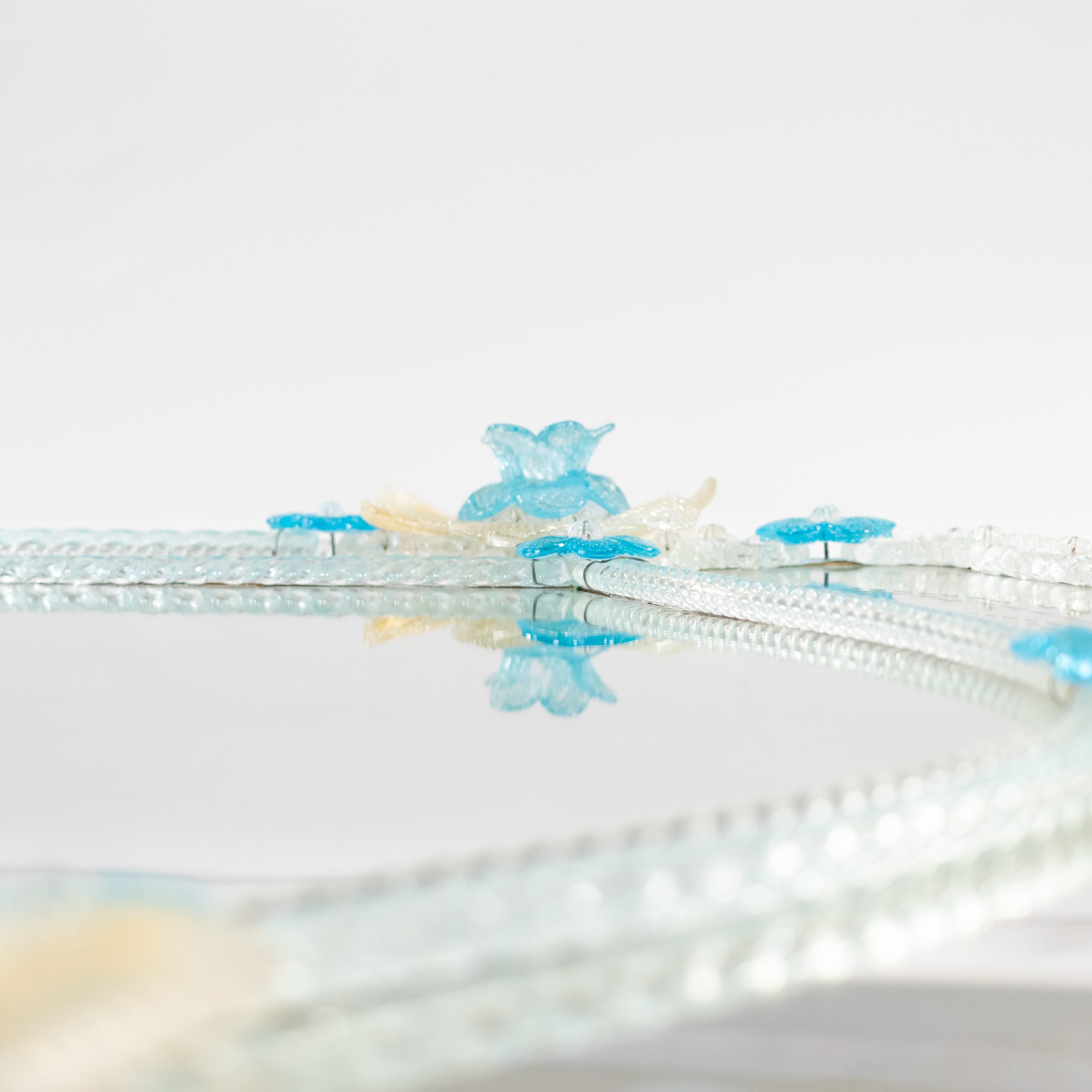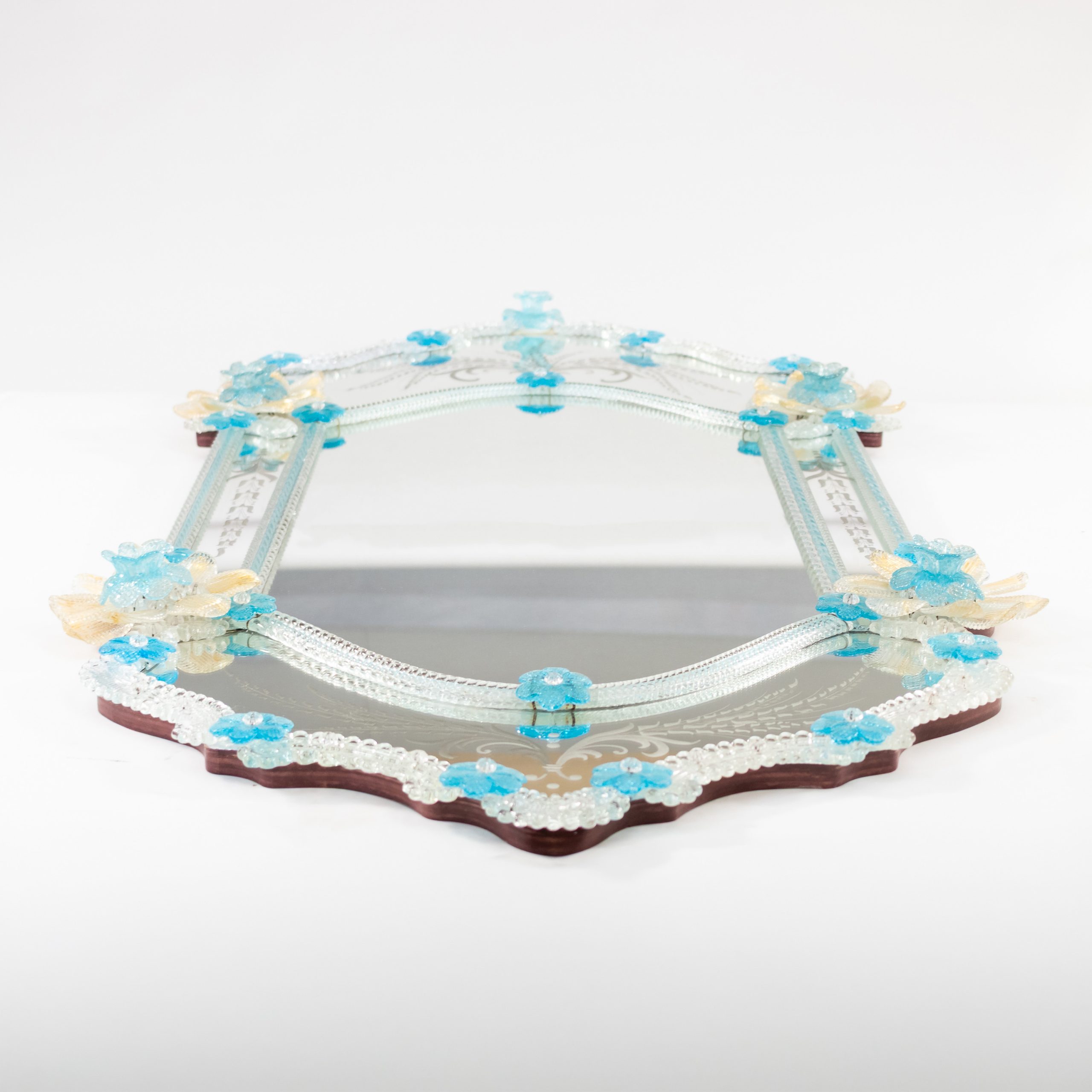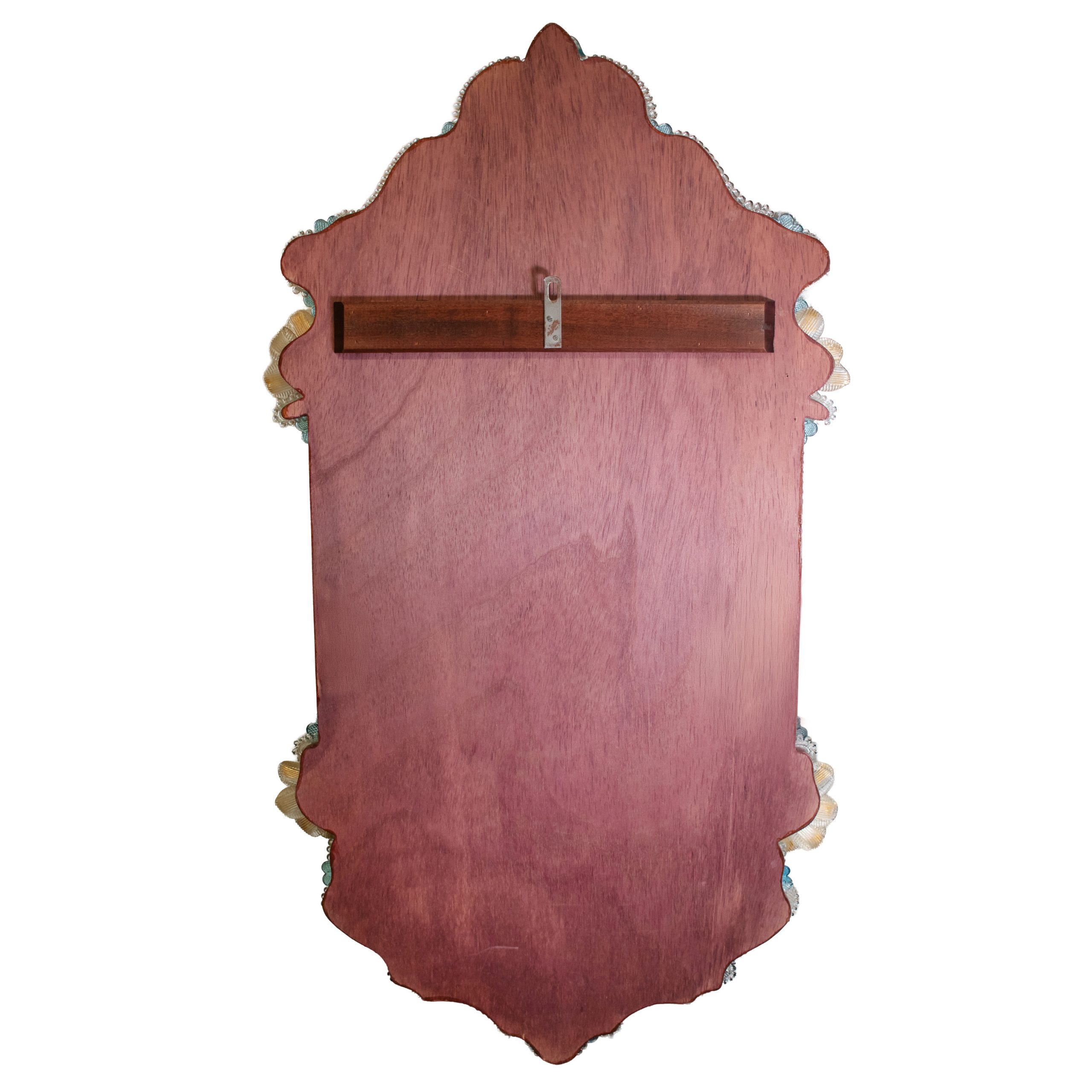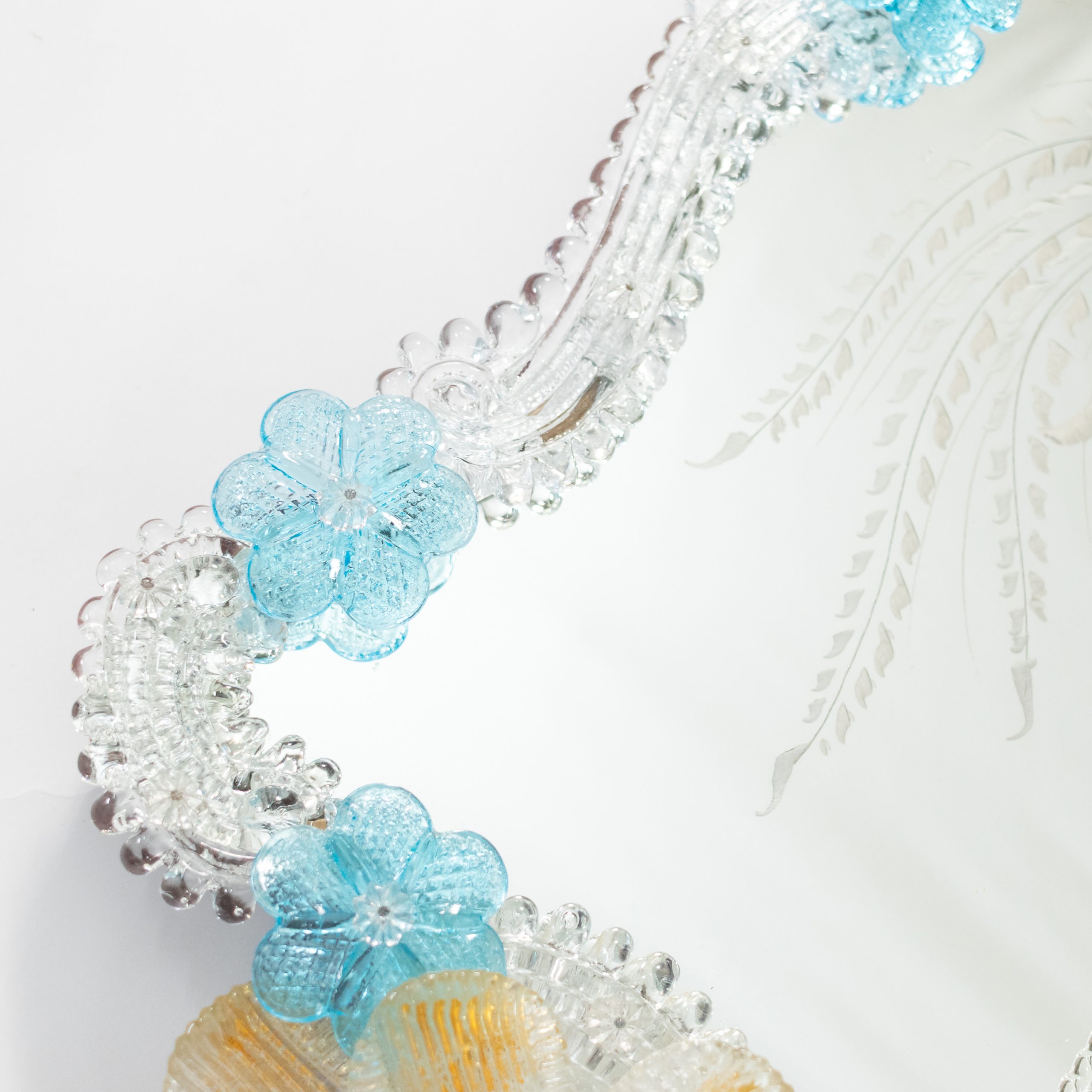 A lovely 49-inch tall mid‑century Venetian Murano glass wall mirror, adorned with hand‑applied aqua glass blossoms with layered, gold‑infused petals that catch and refract the light in a subtle shimmer. The elongated, scalloped silhouette features etched decoration for a romantic Venetian touch, while the light aqua tones sit within rope‑twisted and bead‑textured Murano glass trim. The mirror is mounted on a shaped wooden back with a central sawtooth hanger, ready to install. It works beautifully as a statement piece over a console in an entryway, above a bedroom dresser, or as a jewel‑like focal point in a powder room, dressing room, or vanity area.