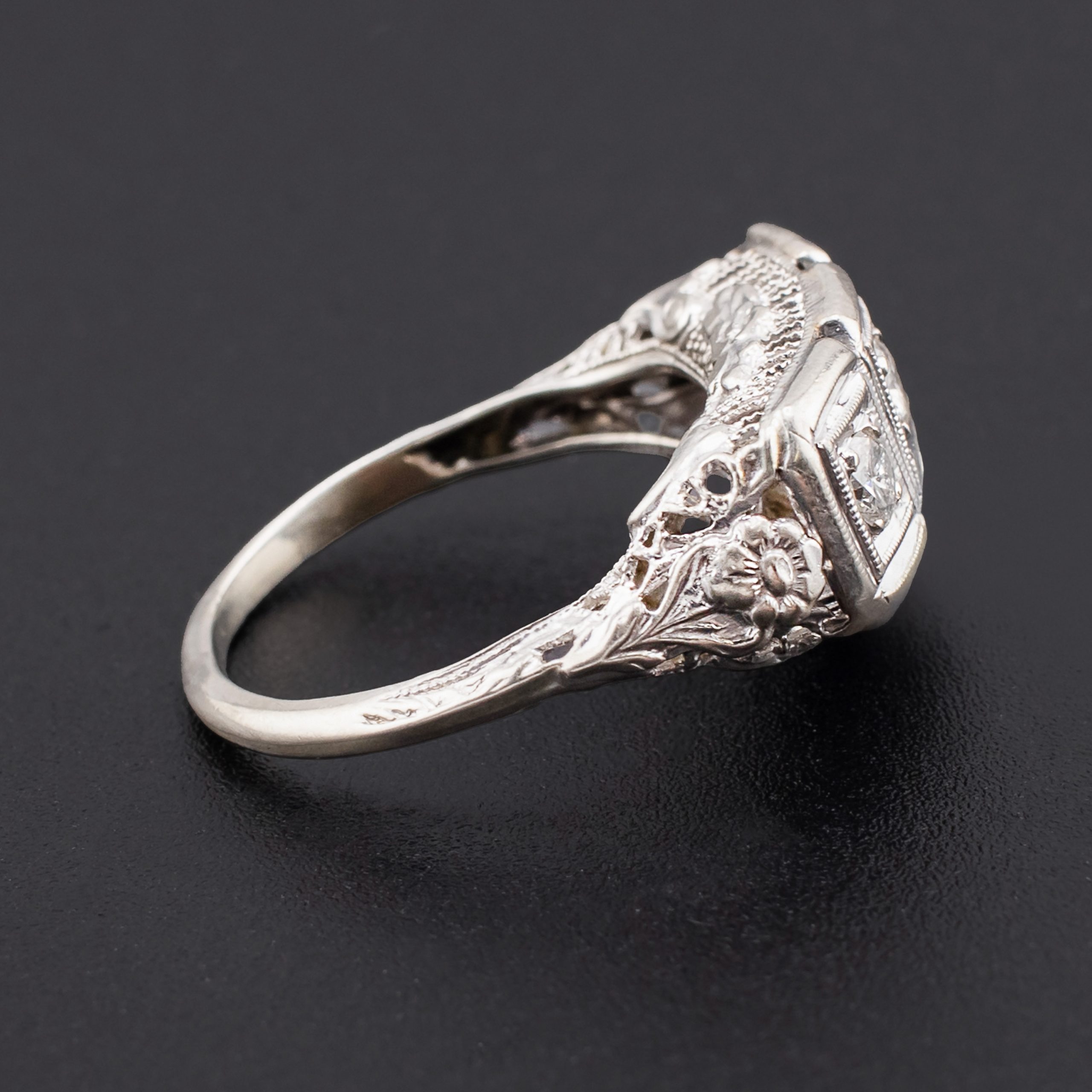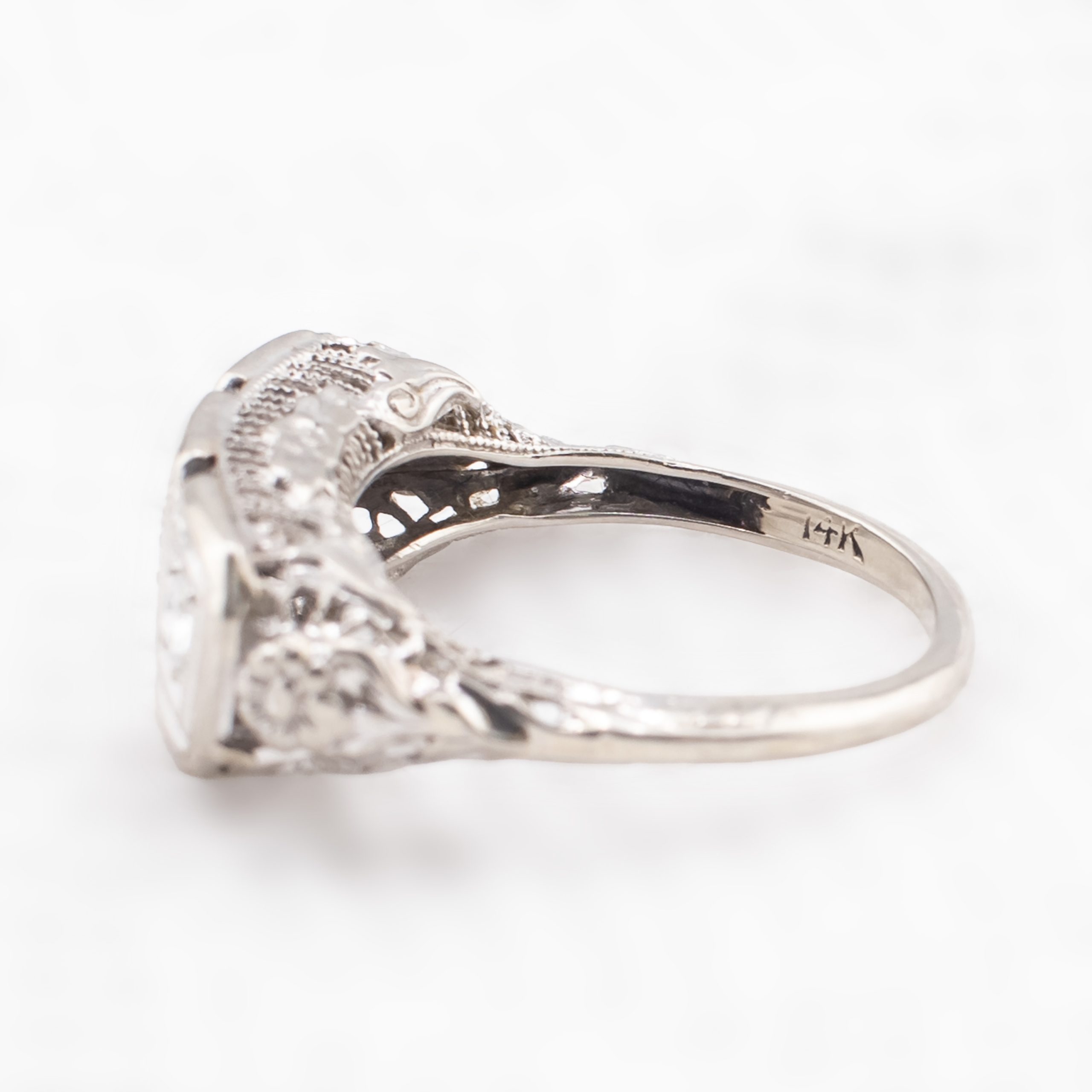 Vintage 14K white gold three-stone diamond ring in an elegant Art Deco–inspired design, featuring a trio of sparkling round brilliant-cut diamonds set within rectangular, milgrain-edged panels and framed by delicate pierced filigree shoulders. The combination of crisp geometric lines and soft filigree gives this ring a romantic, 1920s-style look while remaining easy to wear every day.