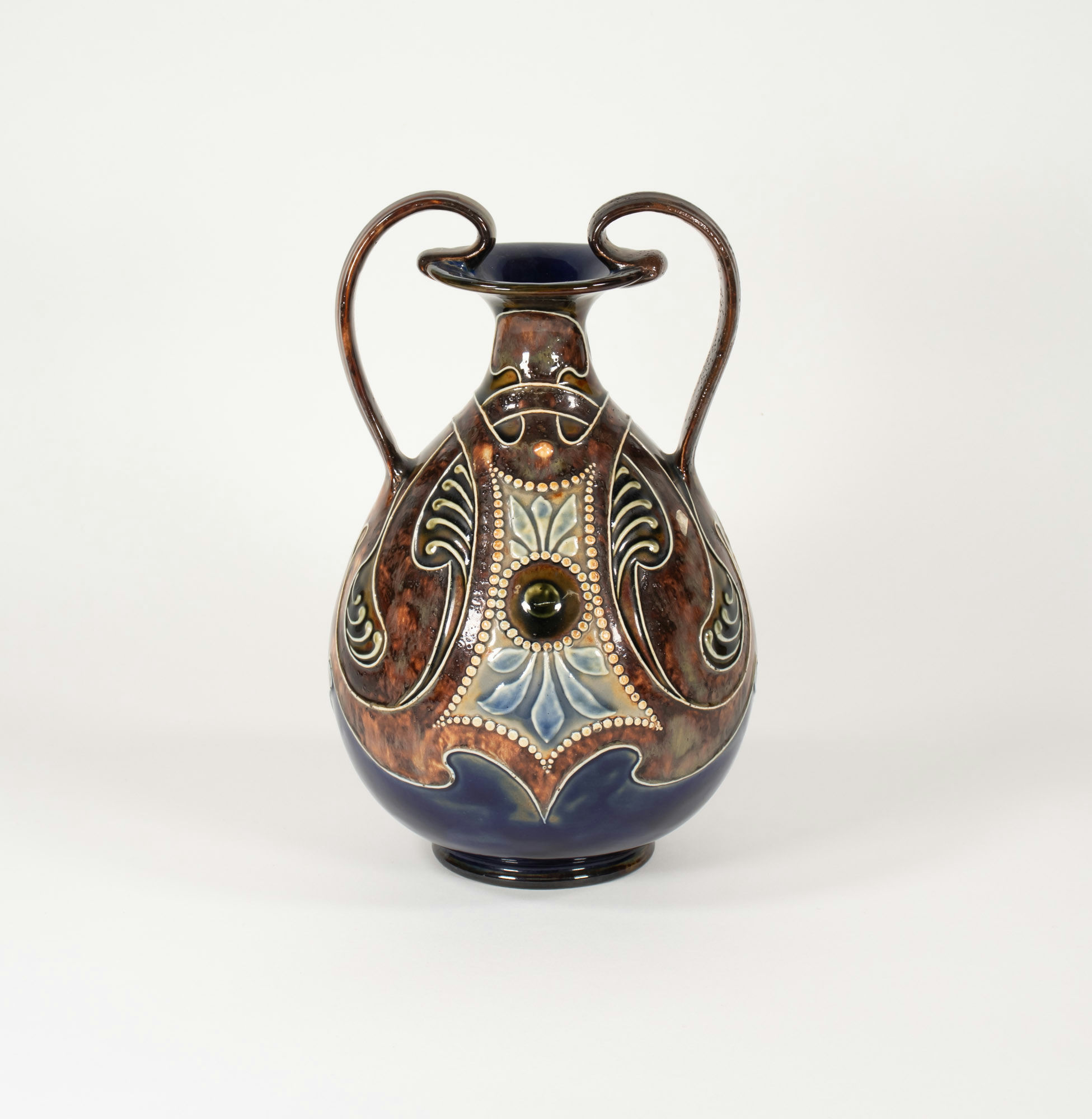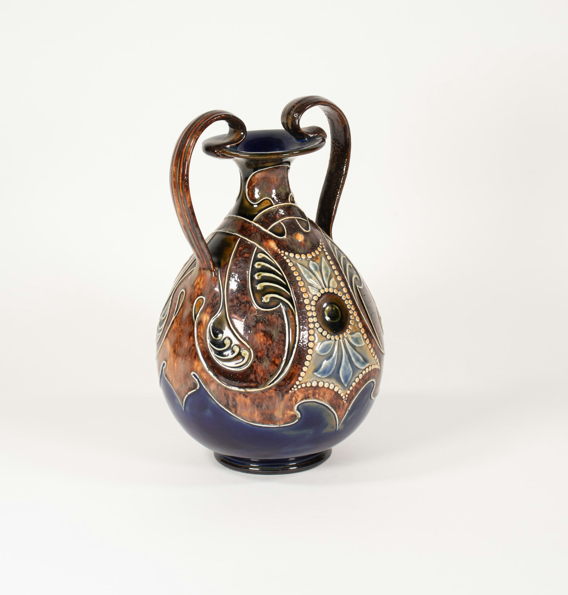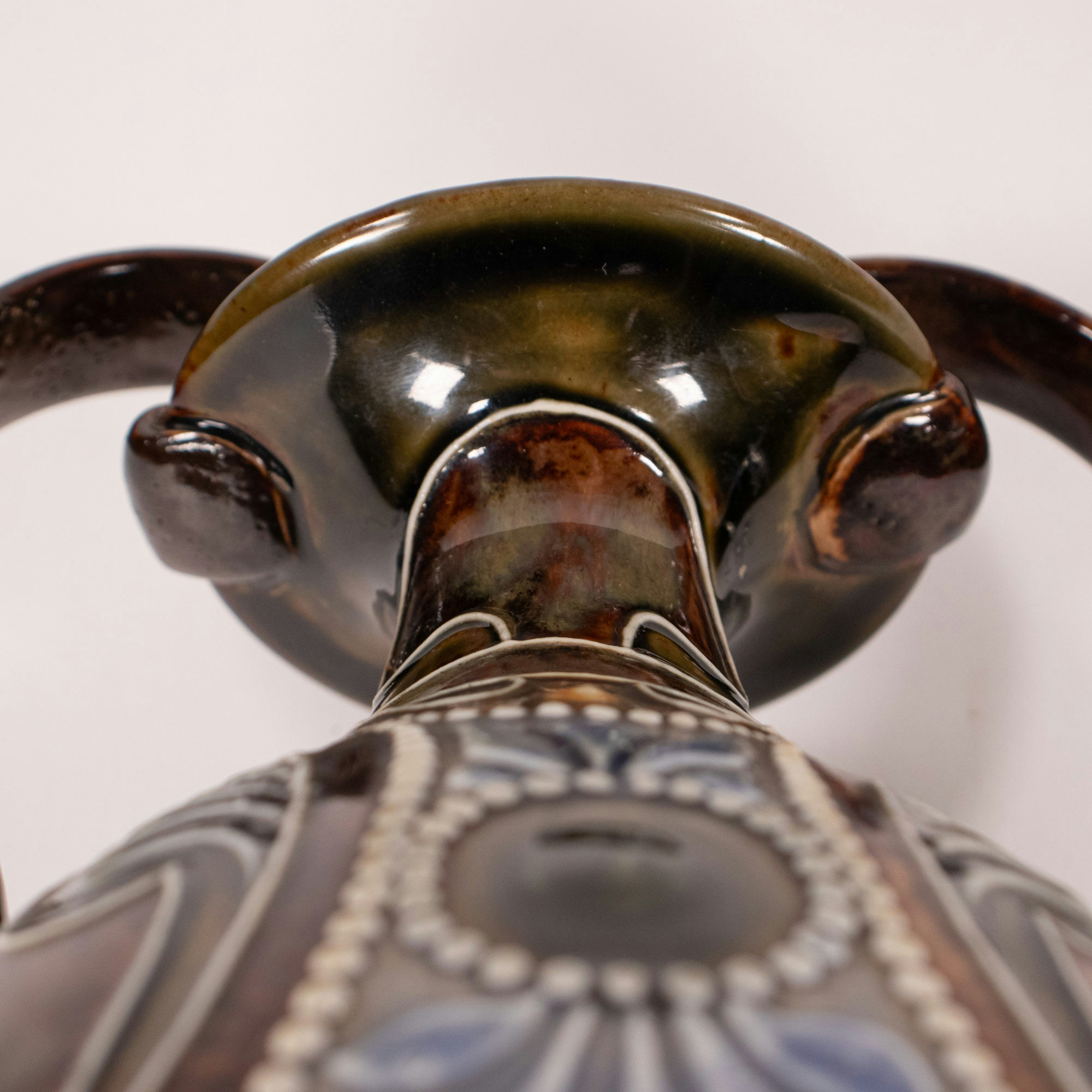 This Late Victorian English Arts & Crafts Royal Doulton Lambeth stoneware amphora by Frank A. Butler was done in Pattern no. 960. This twin-handled vessel is decorated with a mottled burnt umber glaze and other lighter elements. The intricate designs are outlined in relief, displaying the natural color of the pale stoneware. This jug is further decorated with applied beading and botanical motifs. The body of this vase is short and round, similar to the shape of a teardrop, with a slightly elongated neck and wide mouth. The highly arched handles merge with the lip of the mouth, rather than the neck like a traditional amphora-style vase, creating a dynamic shape that mimics the details in the surface design. Every piece of Doulton stoneware was unique, as decorators were given creative freedom, making this piece a one-of-a-kind work of art with impeccable craftsmanship and design.