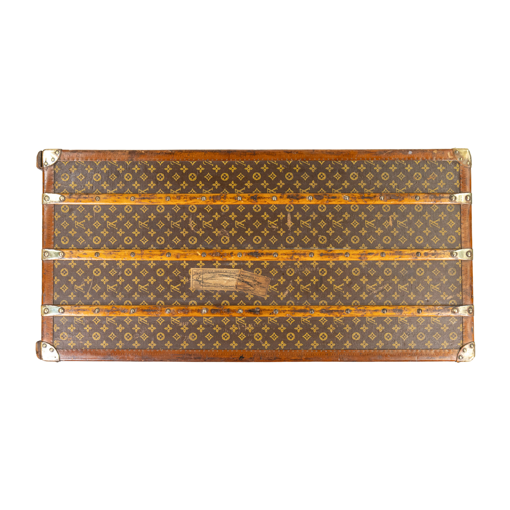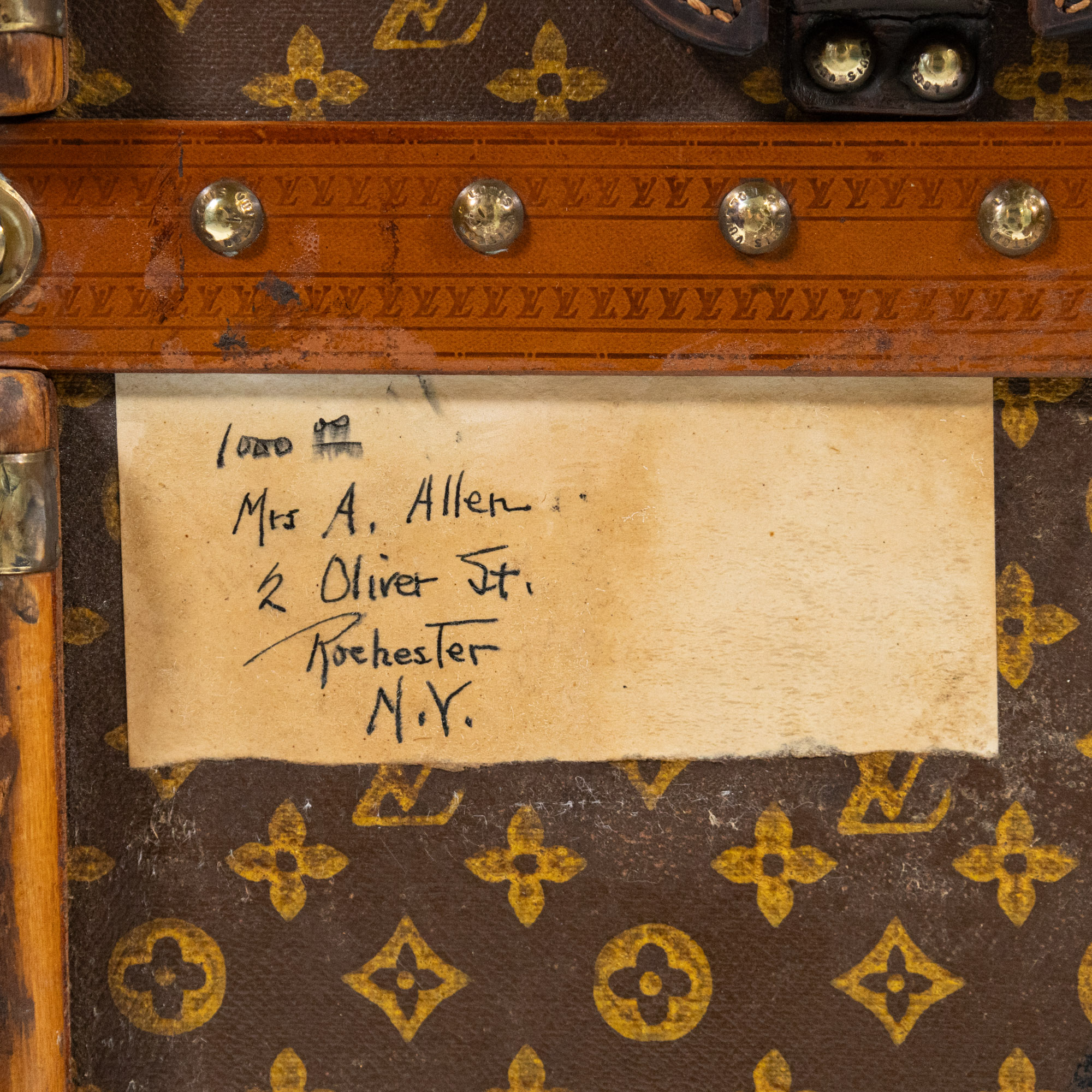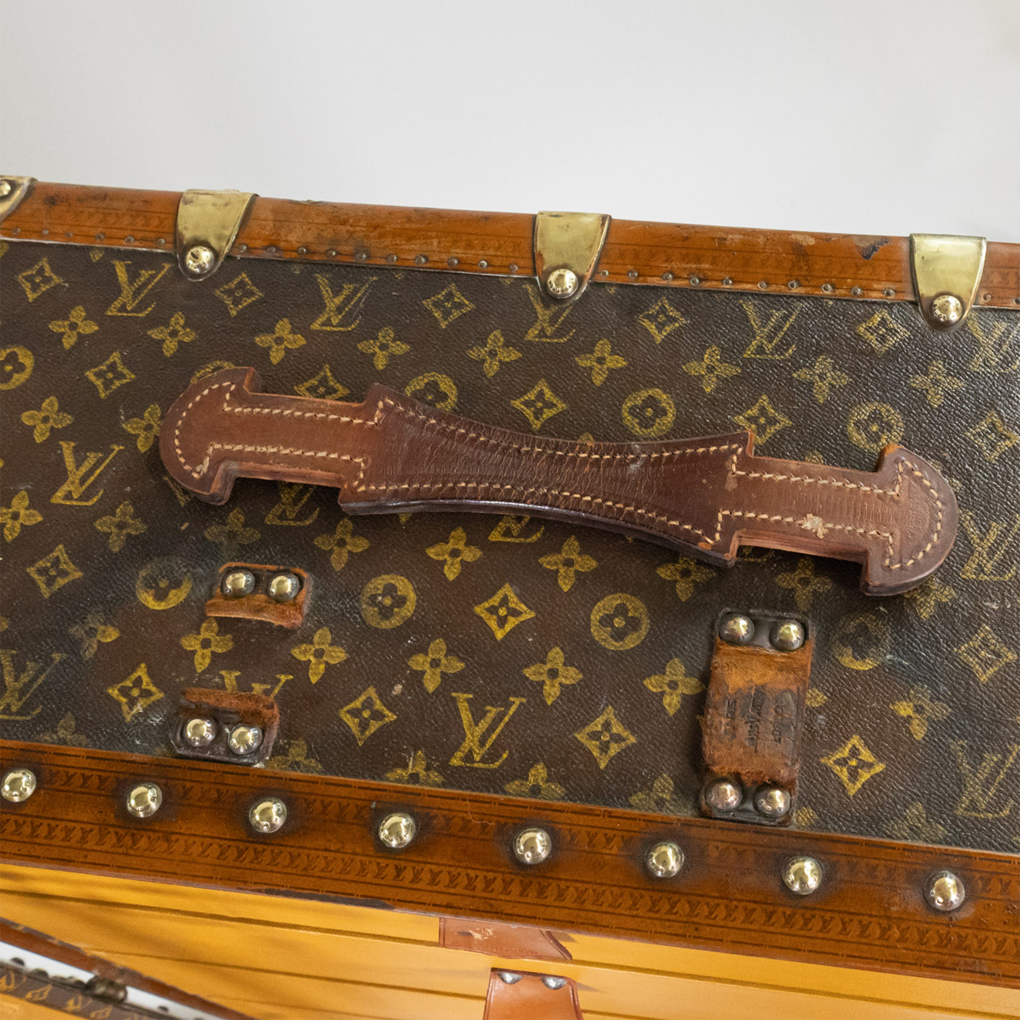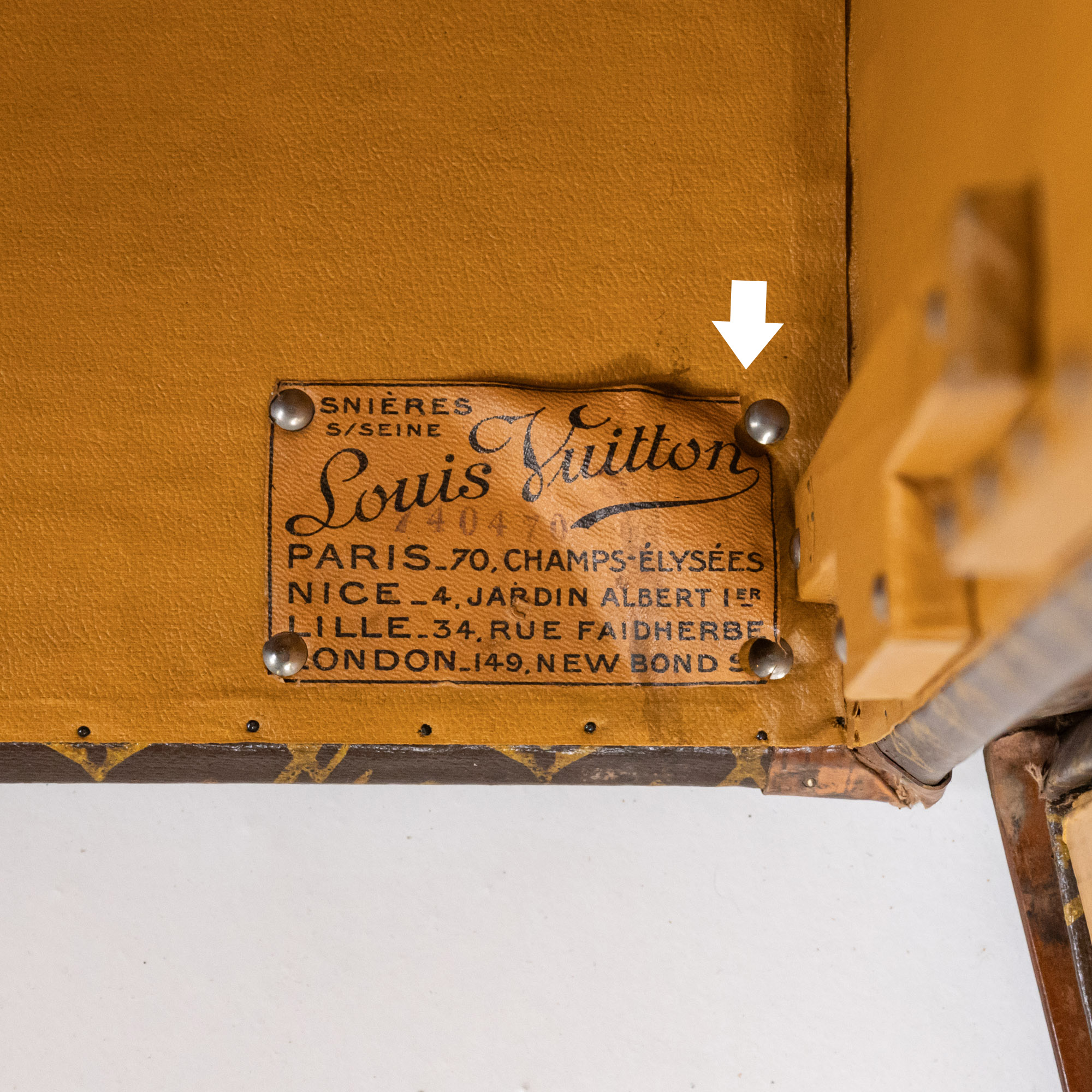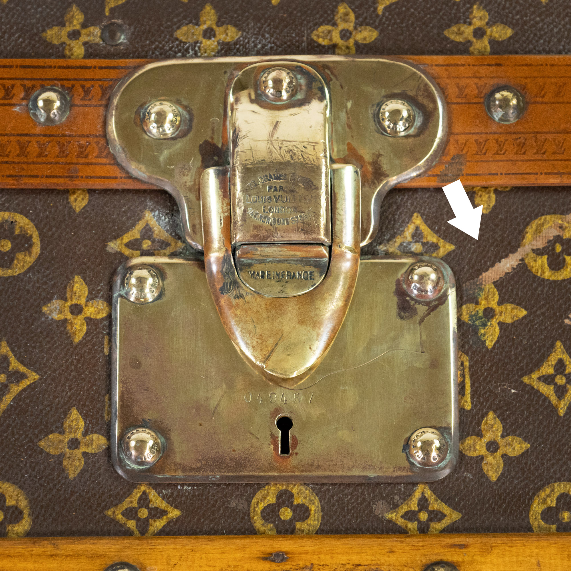 Externally, the trunk has a hand-painted monogram canvas, wooden slat reinforcements, solid brass hardware, and leather handles, with reinforced corners embossed with the LV initials. The iconic monogram design features interlocking L and V letters. The center clasp utilizes a v-lock design with a serial number for authenticity, and inside, the authentic Louis Vuitton plate provides identification and date details that can be verified with the brand.