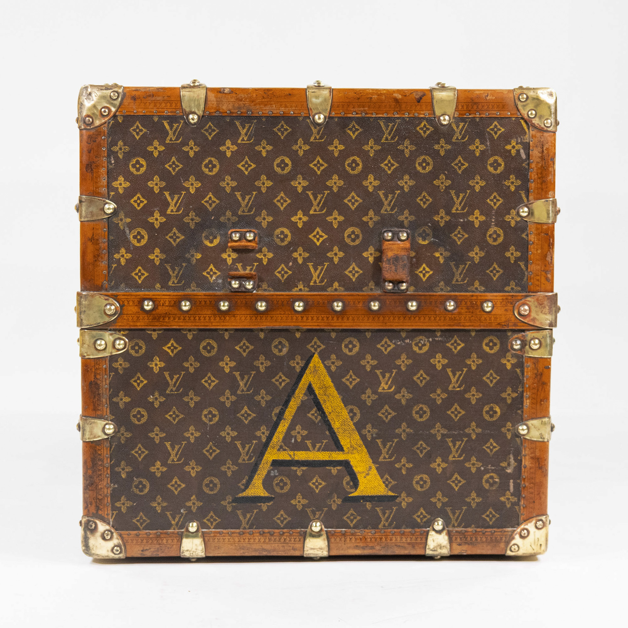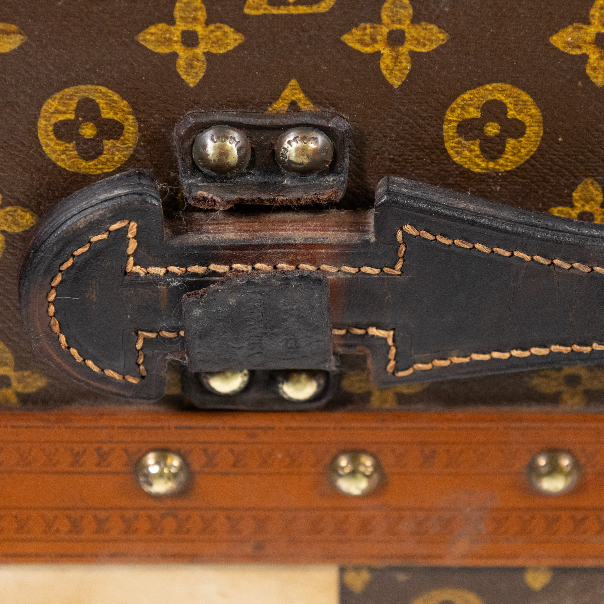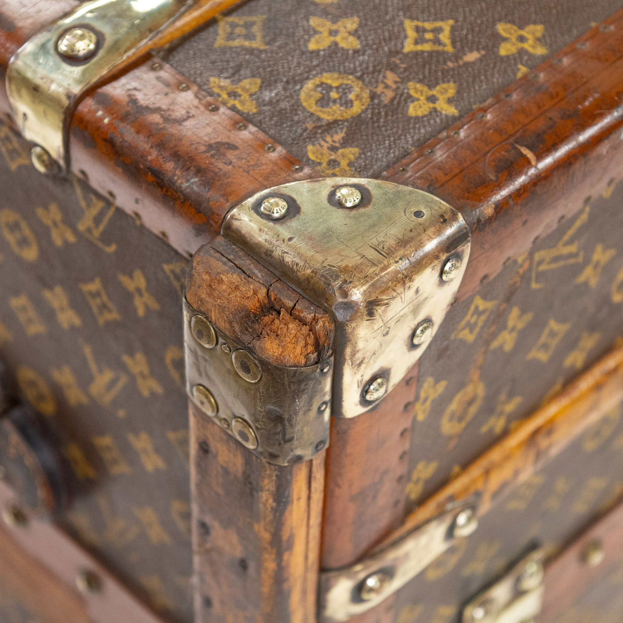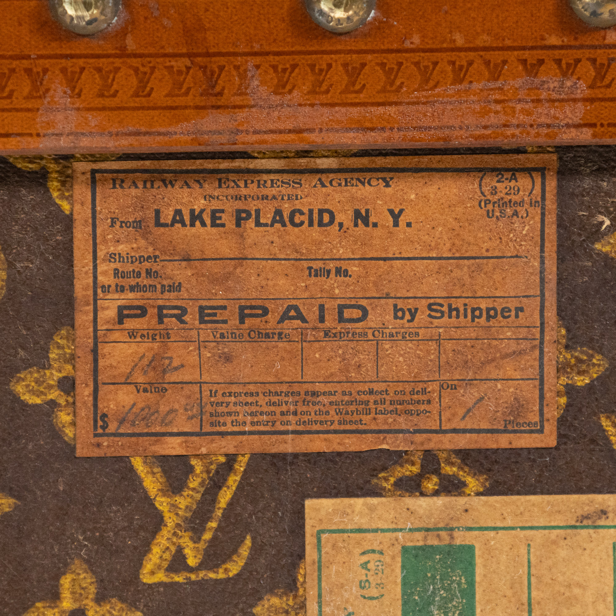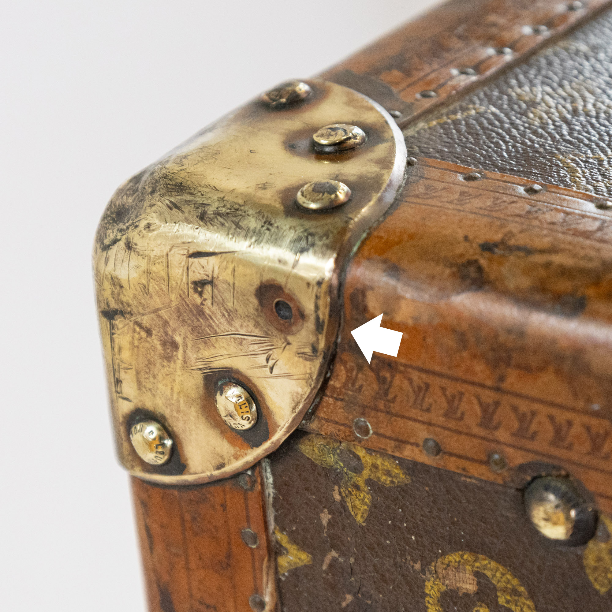 Externally, the trunk has a hand-painted monogram canvas, wooden slat reinforcements, solid brass hardware, and leather handles, with reinforced corners embossed with the LV initials. The iconic monogram design features interlocking L and V letters. The center clasp utilizes a v-lock design with a serial number for authenticity, and inside, the authentic Louis Vuitton plate provides identification and date details that can be verified with the brand.