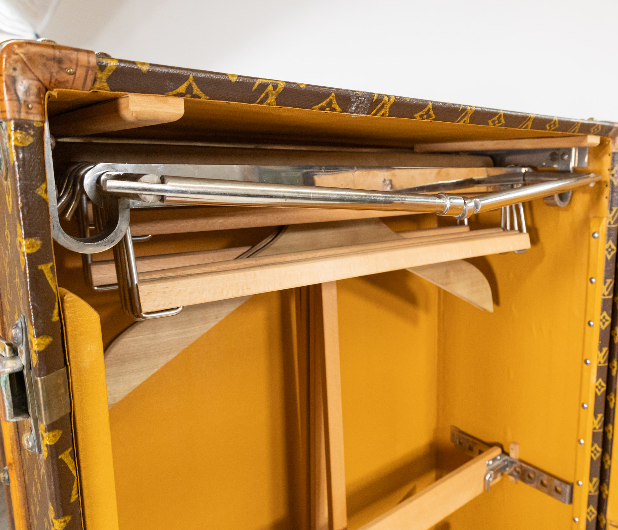 This Louis Vuitton upright wardrobe trunk, dating from 1910 to 1930, exemplifies the elegance of the clear lozine series, known as the 1st series after 1914. Designed for organized packing, this trunk is ideal for suits and soft dresses, ensuring they remain wrinkle-free during travel. The trunk features a vertical opening that reveals six drawers, each having a canvas exterior with a linen interior. It includes a trinket drawer with an organizer, four drawers with fabric covers, and a hat drawer equipped with a ribbon cage. A pullout mechanism holds 14 original hangers, while a leather strap secures additional items in the lower section.