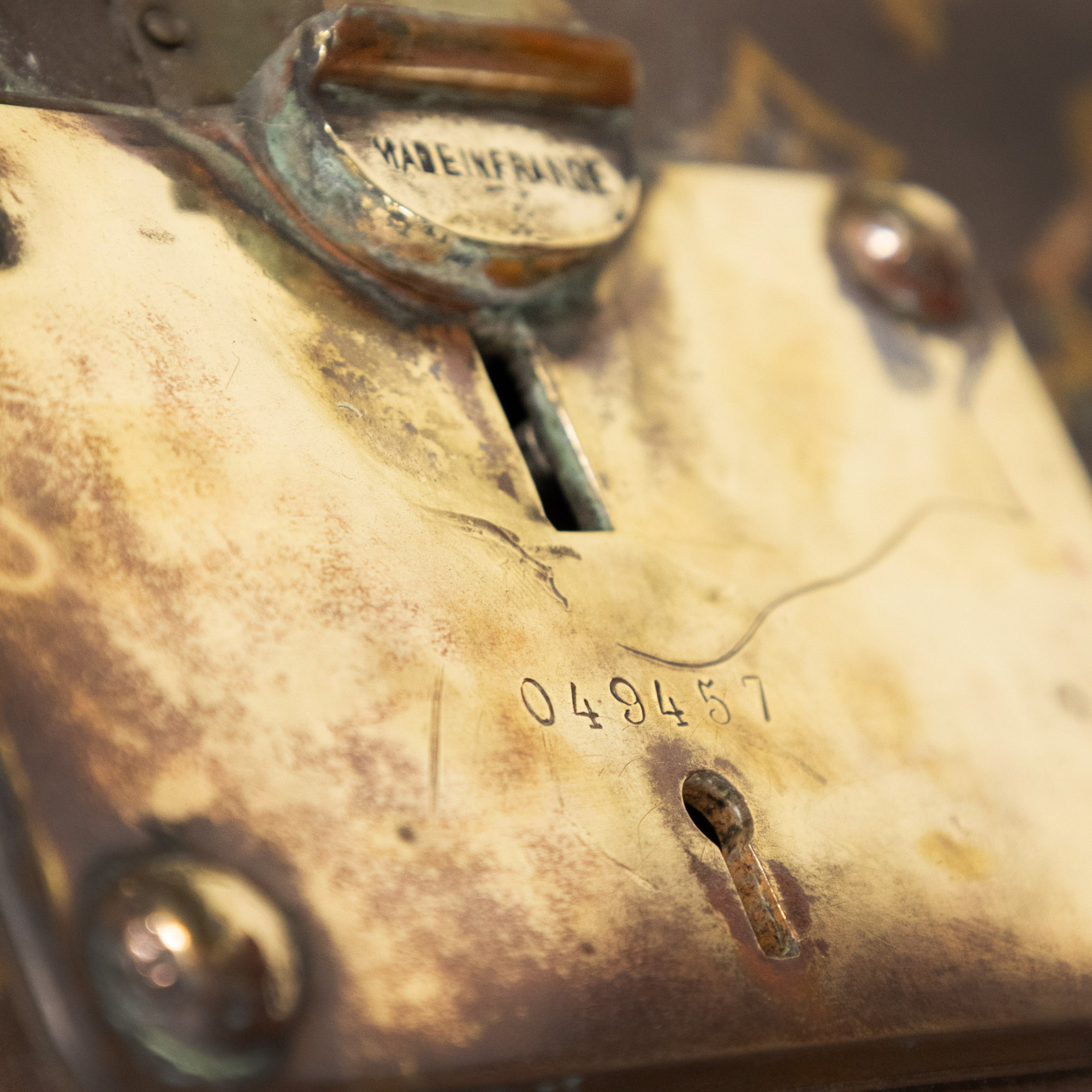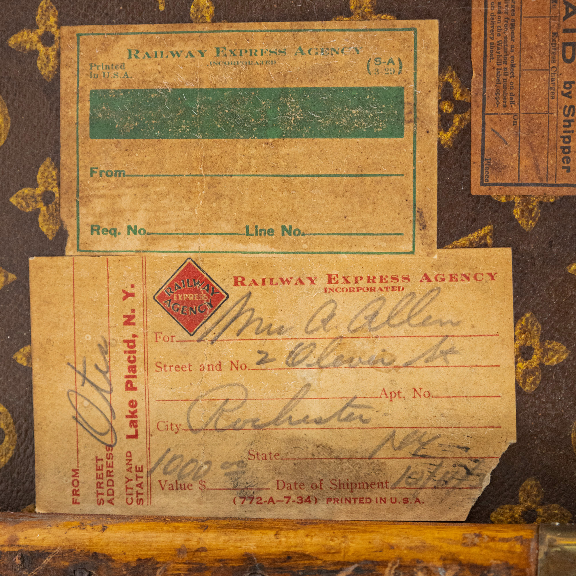 Adding a personalized touch, the trunk has the original owner’s hand-painted initials, along with two stickers stating, “Mrs. A. Allen” and her home address. It belonged to Charlotte Whitney Allen (1891–1978), a notable figure in Rochester, New York’s social and cultural circles. As a supporter of the arts, she eventually donated her home to the Memorial Art Gallery of Rochester, reflecting her commitment to enriching the community’s cultural landscape.