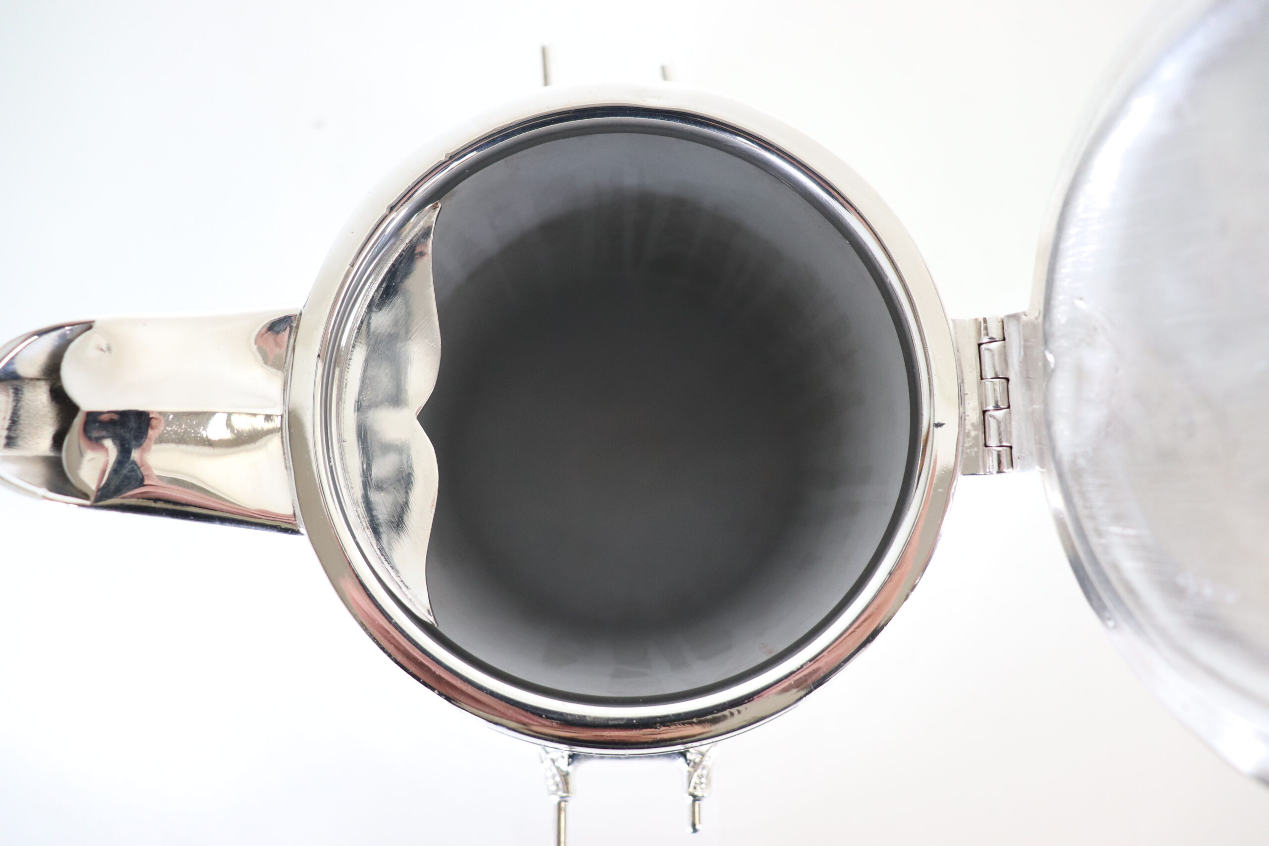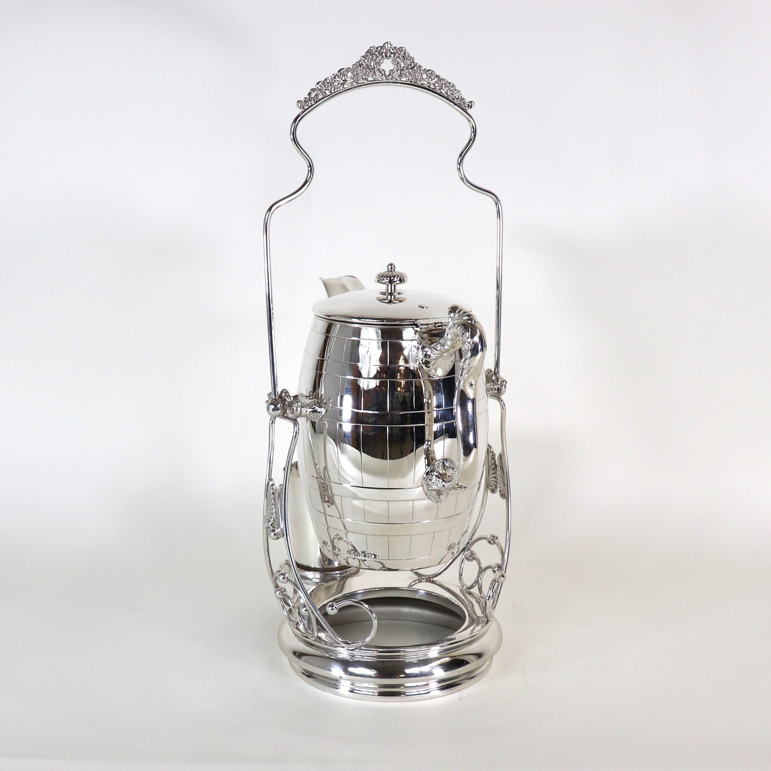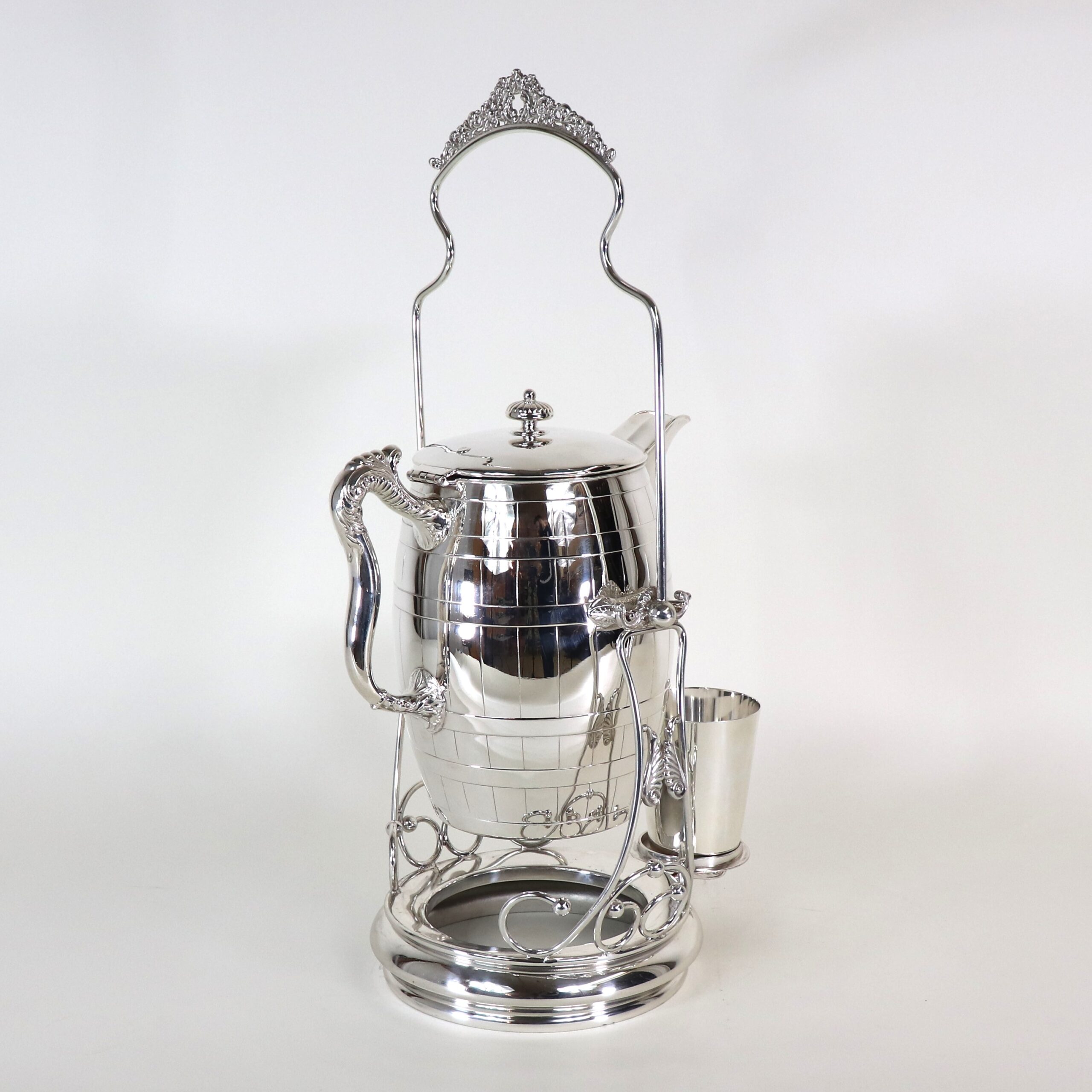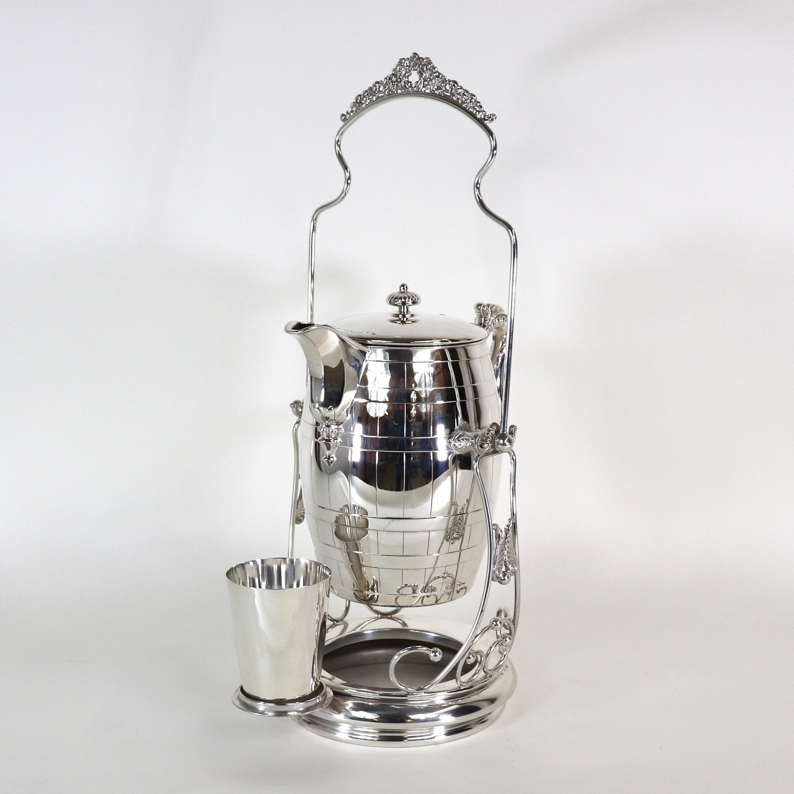 The slop cup for spills and leavings is from Wallace Silversmith from Wallington, CT, USA, successors to Wallace and Sons also in Wallington, CT. It is not original to the set but fits the stand well. It is stamped ” Wallace 992″ indicating it is after 1956. The pitcher is designed to simulate a barrel. The rococo trim on the stands and handle adds traditional old-world elegance and the craftsmanship is apparent. This exquisite beverage pitcher set will elevate any table setting, while elegantly servicing hot or cold drinks. Afterward, it makes a decorative accent wherever it is stored.