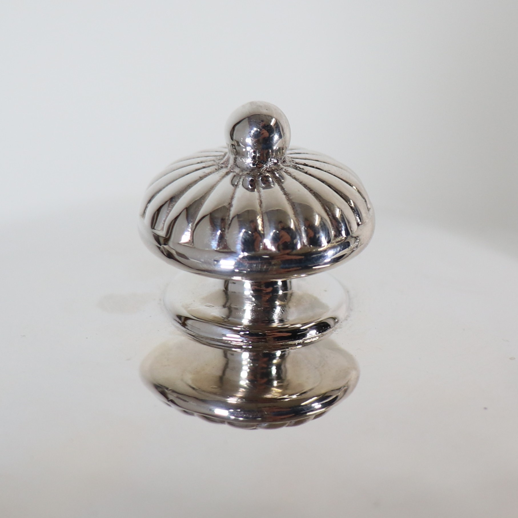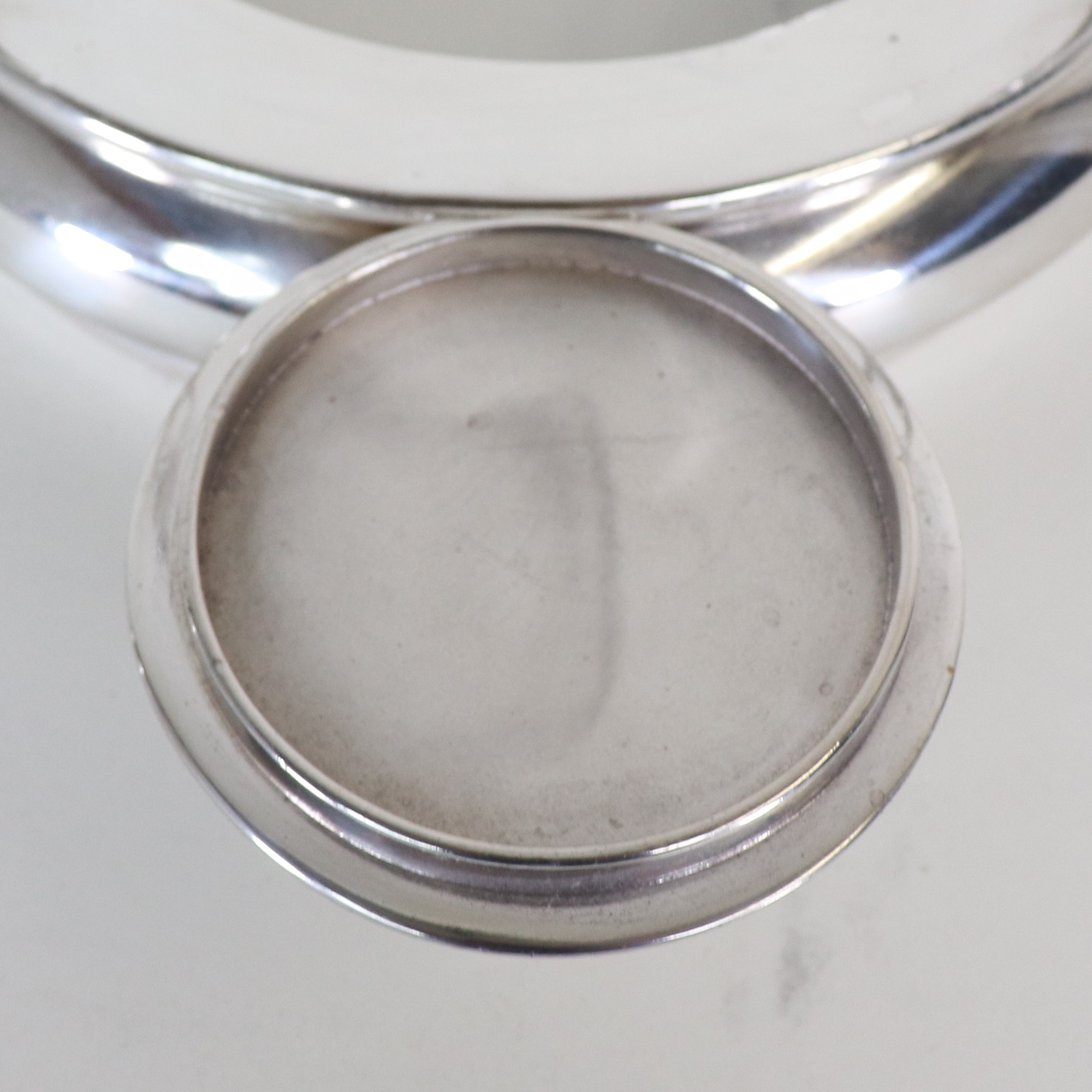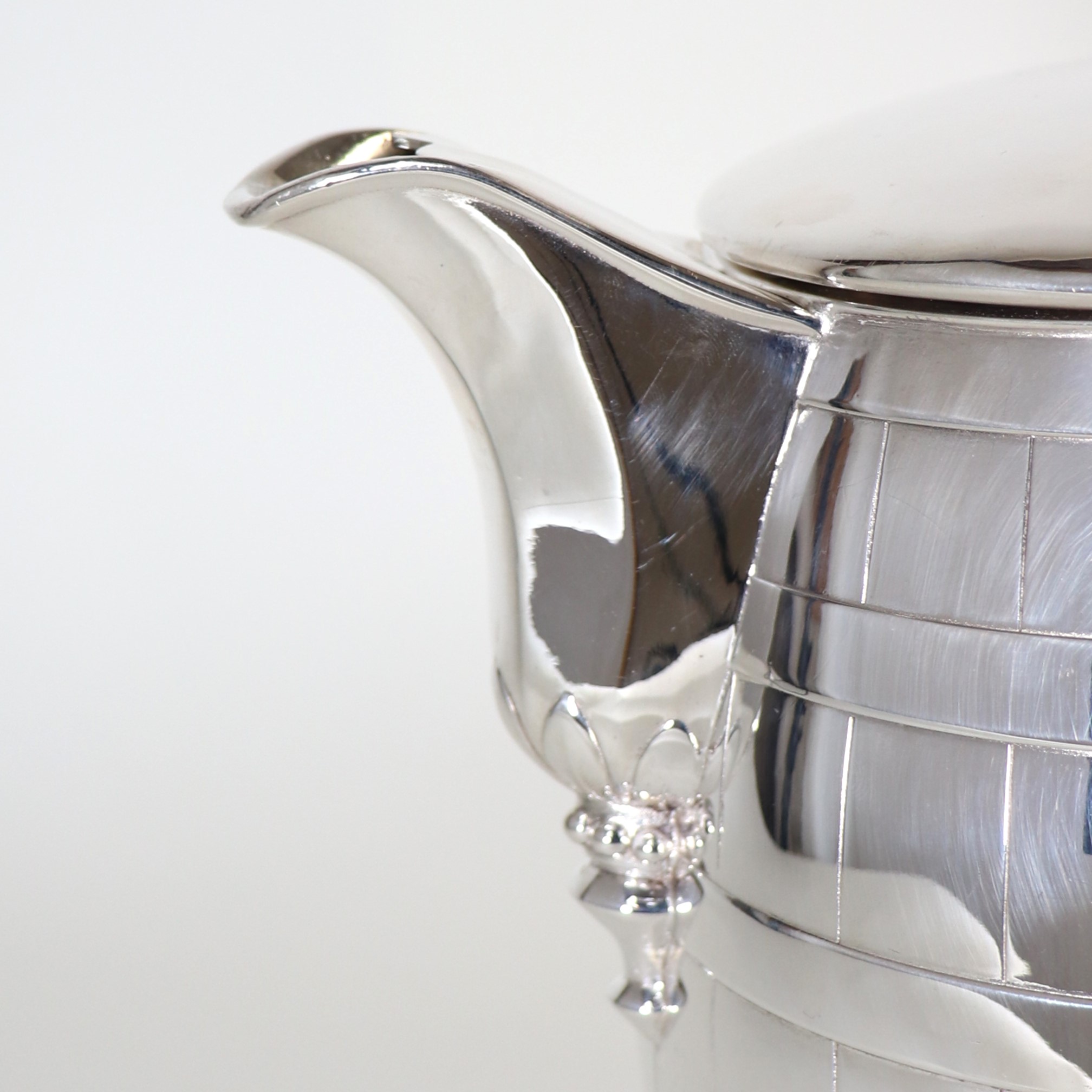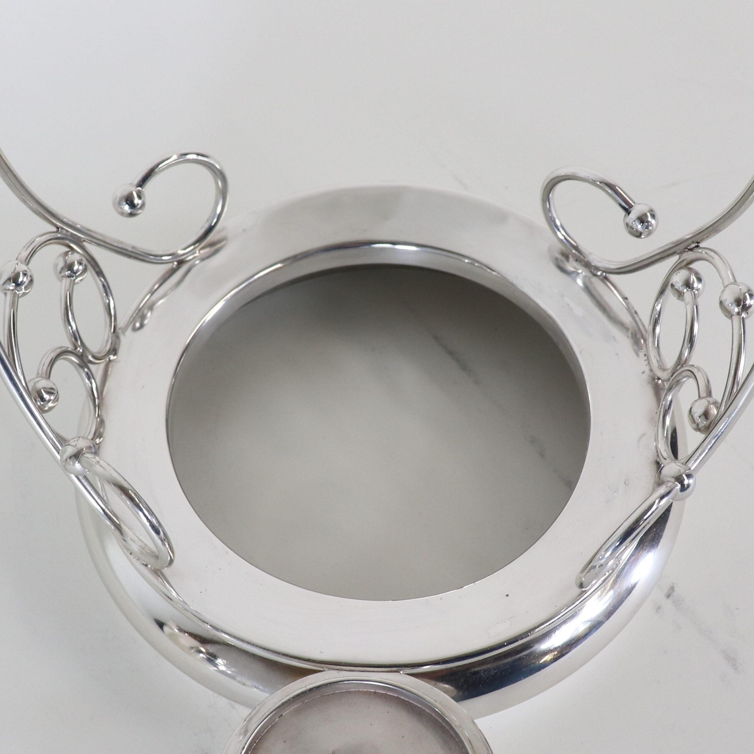 The slop cup for spills and leavings is from Wallace Silversmith from Wallington, CT, USA, successors to Wallace and Sons also in Wallington, CT. It is not original to the set but fits the stand well. It is stamped ” Wallace 992″ indicating it is after 1956. The pitcher is designed to simulate a barrel. The rococo trim on the stands and handle adds traditional old-world elegance and the craftsmanship is apparent. This exquisite beverage pitcher set will elevate any table setting, while elegantly servicing hot or cold drinks. Afterward, it makes a decorative accent wherever it is stored.