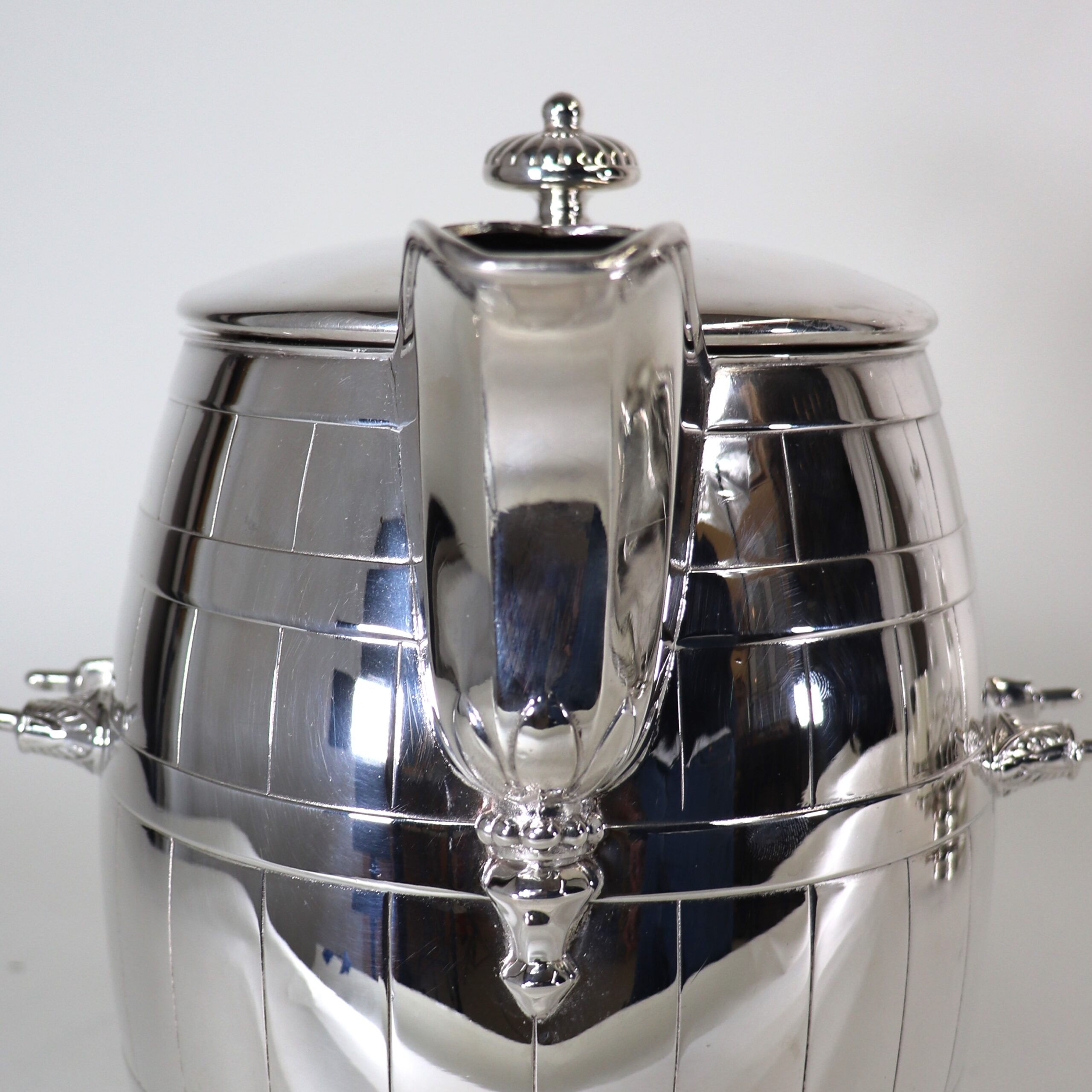 Serve any beverage of your choice with elegance with this silver-plated decanter beverage pitcher jug drink cask by the Standard Silver Company of Toronto Canada. The ten-cup set comes with a stand, pitcher, and slop cup. The inside has a porcelain lining for hot or cold beverages.