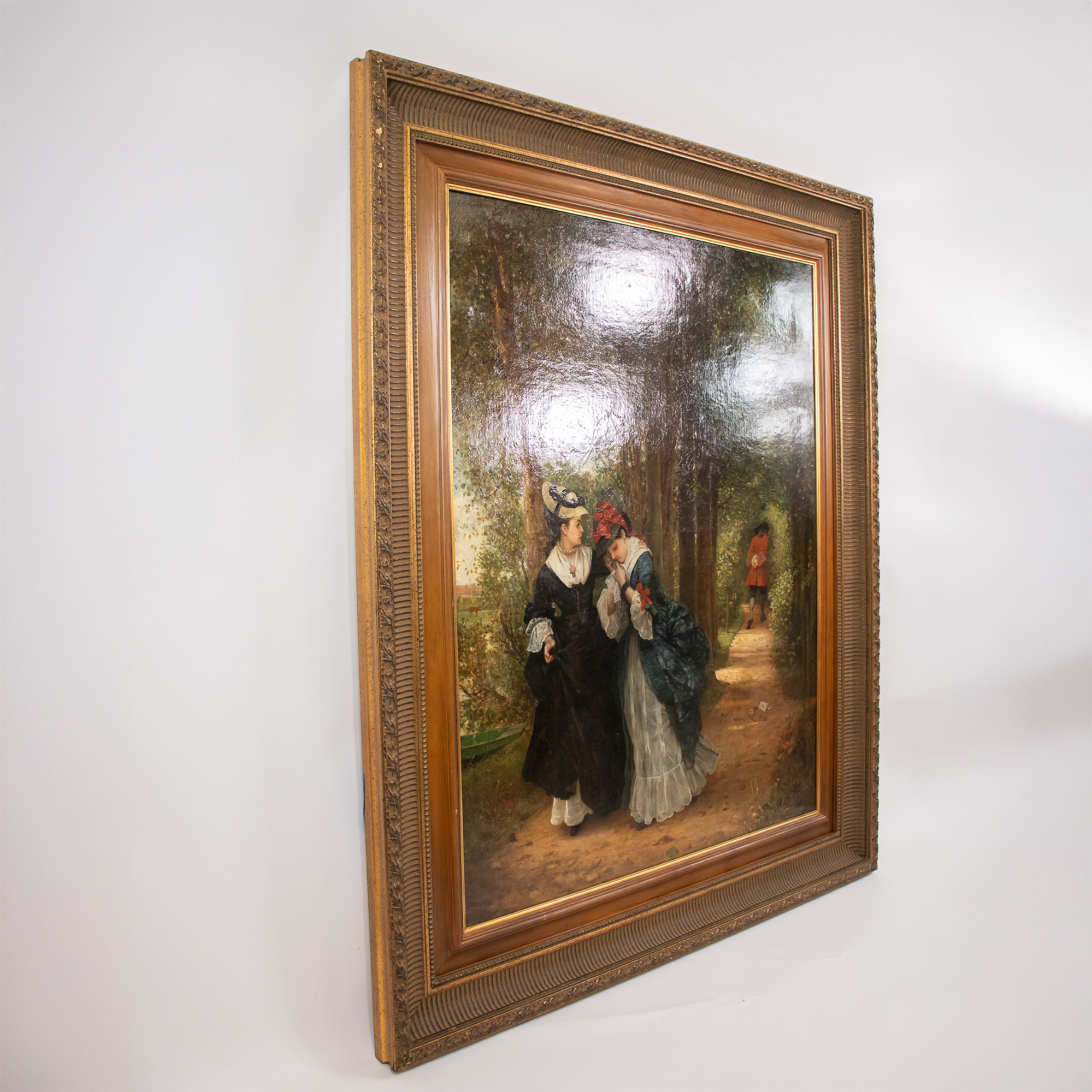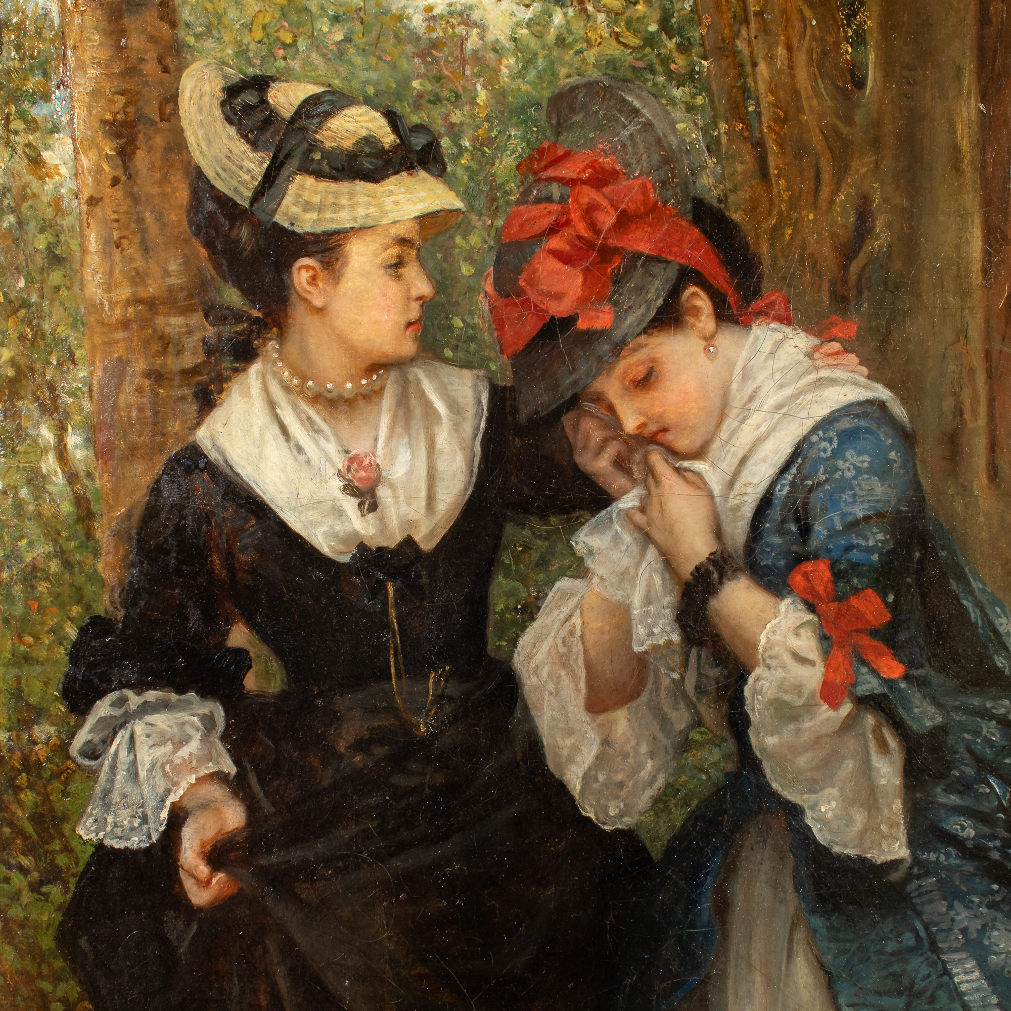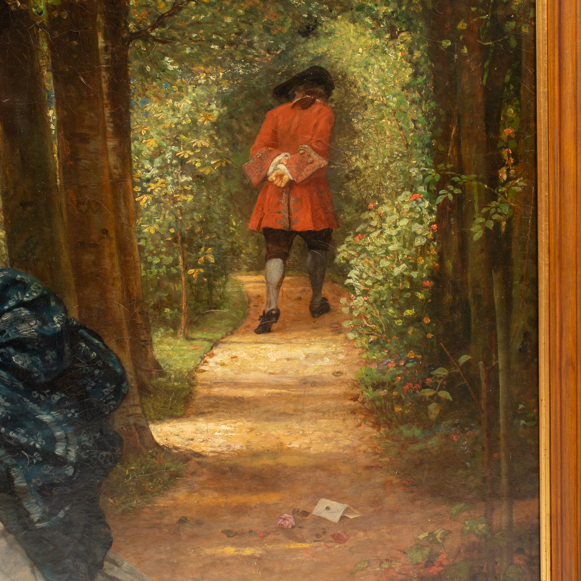 This evocative Victorian genre scene, attributed to George Adolphus Storey, R.A., captures the moment immediately after a letter has been delivered. In a leafy walk, a Georgian household footman in red livery recedes into the distance, his hands clasped behind his back. In the foreground, two women linger together. One presses a handkerchief to her face in distress while the other steadies and consoles her, glancing toward the opened letter lying on the path with its red wax seal still visible. The composition focuses the eye on this small but decisive object, inviting the viewer to imagine the contents and the drama it has set in motion. A near‑hidden hint electrifies the scene: two hearts carved into the tree trunk, marking this walk as a lovers’ rendezvous.