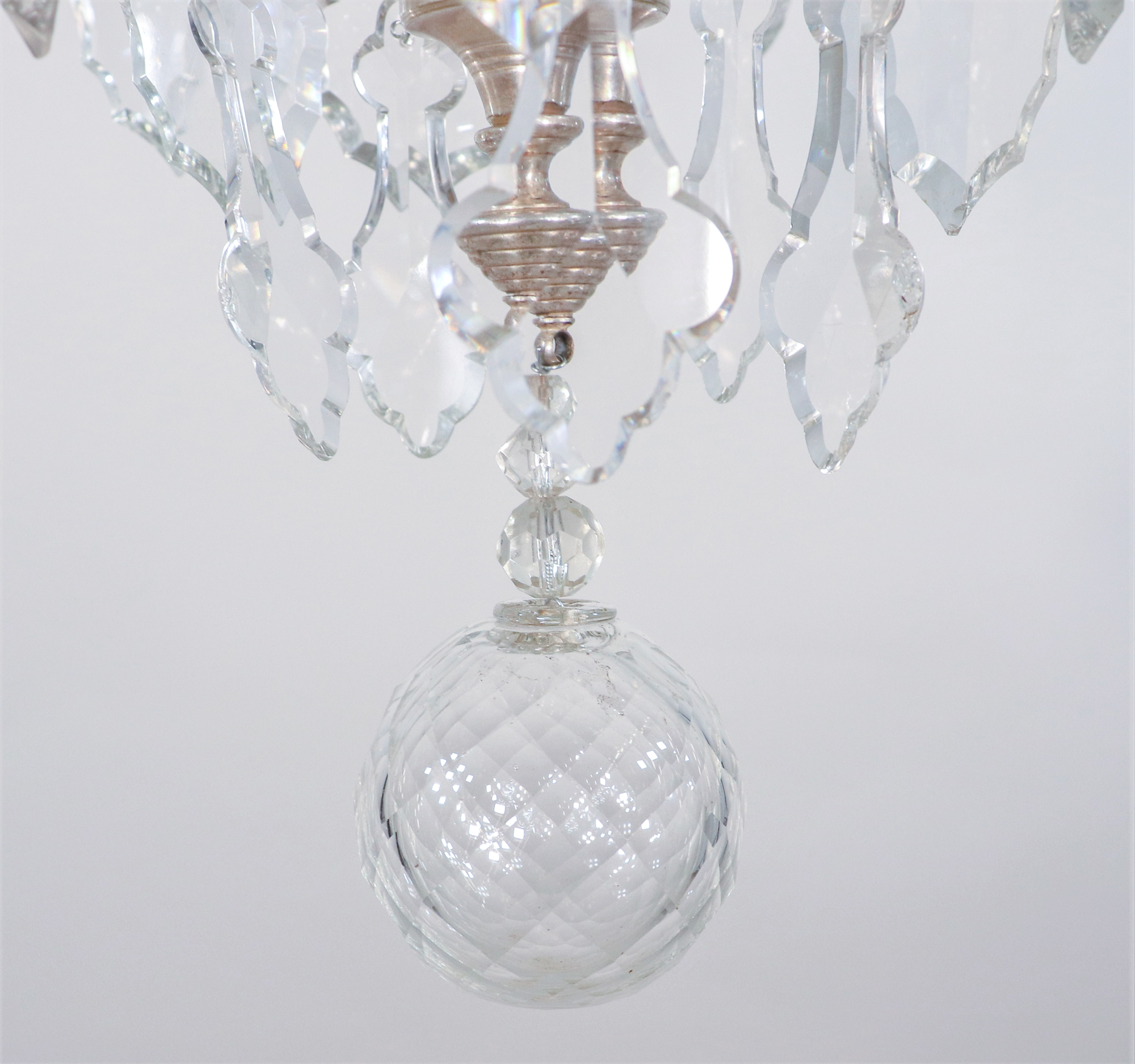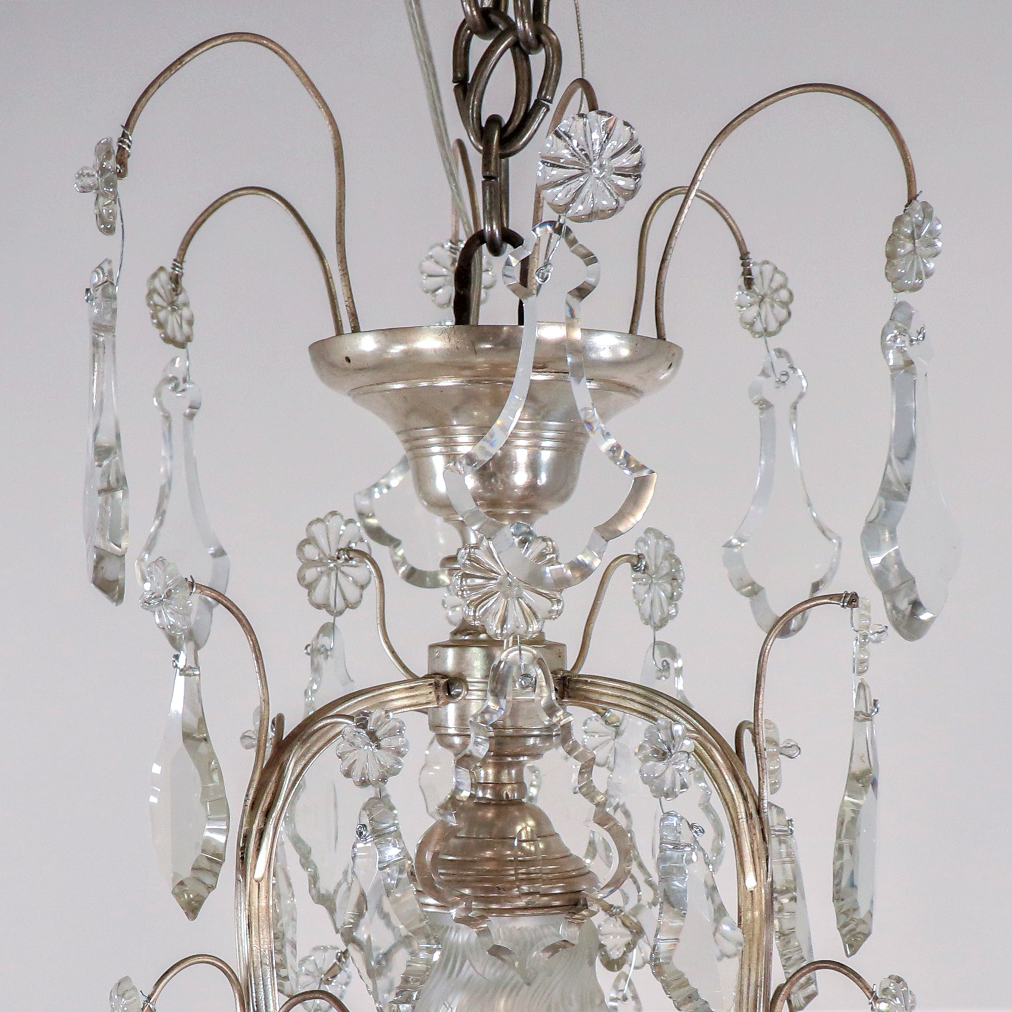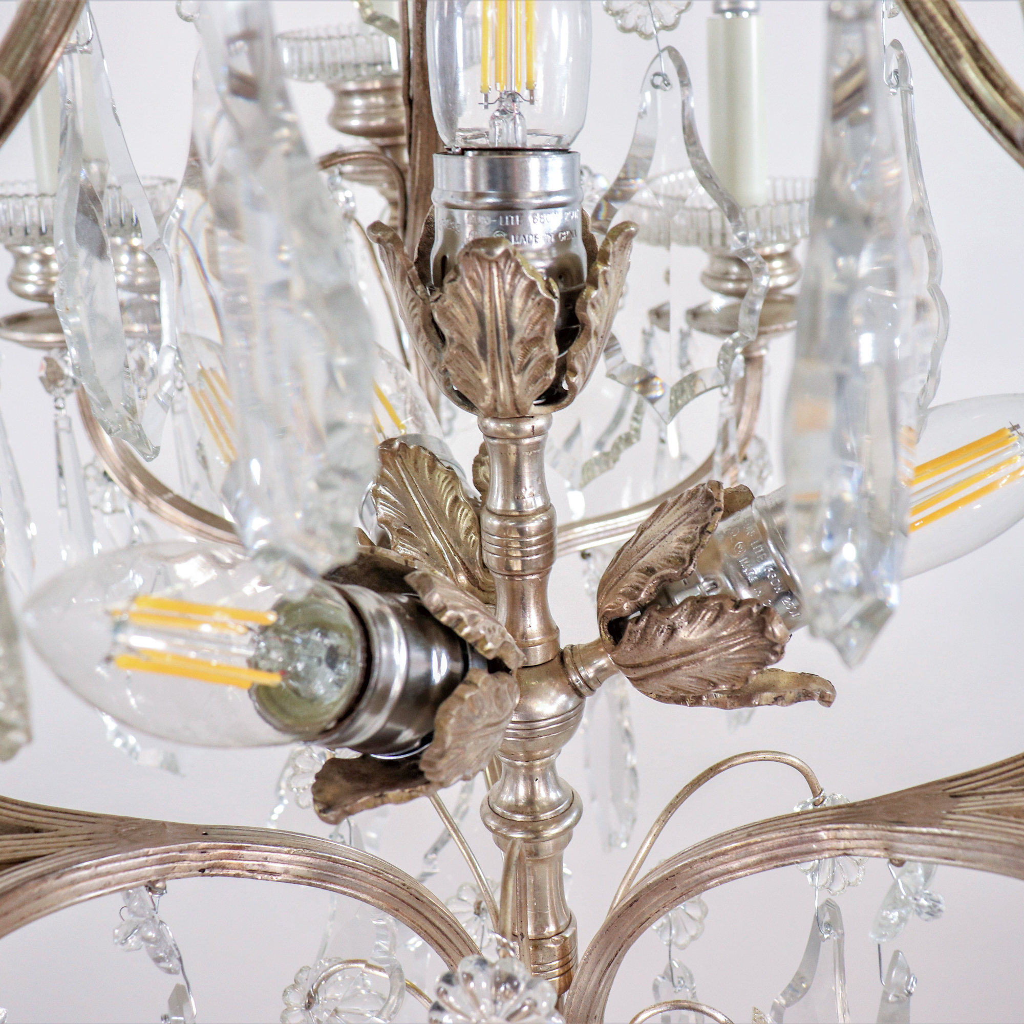 A refined late 19th-century French Louis XVI Revival chandelier in nickel-plated brass and hand-cut crystal. This elegant fixture exemplifies the neoclassical aesthetic of the Louis XVI style — graceful symmetry, refined ornament, and luminous clarity — interpreted with the sophisticated techniques and materials of the Belle Époque period.