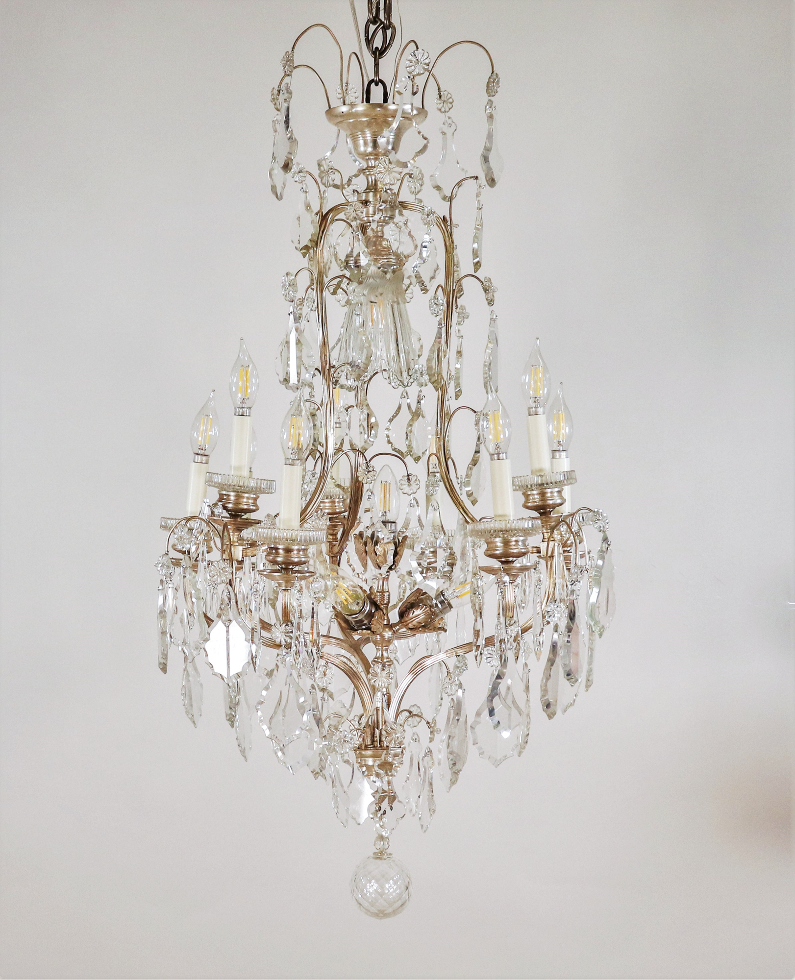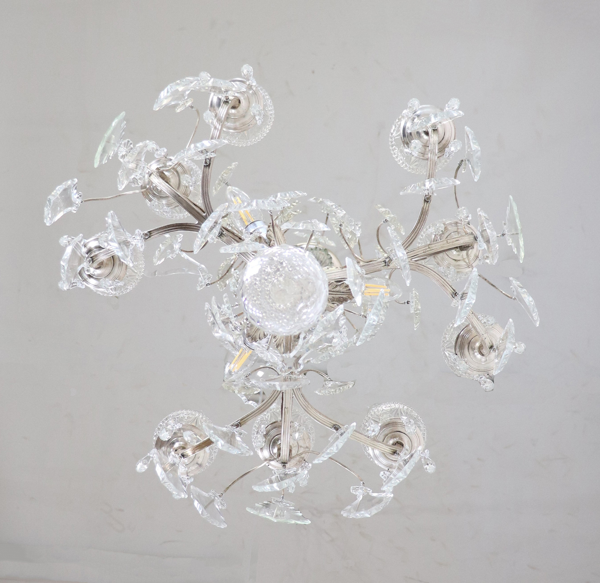 The chandelier features a delicate birdcage form with nine candle-form lights, each resting on ribbed crystal bobèches and surrounded by finely faceted crystal prisms. The frame’s gentle scrolling arms and architectural detailing in nickel-plated brass create a subtle contrast between brilliance and restraint, while a cut-glass baluster stem and diamond-patterned crystal ball complete the composition.