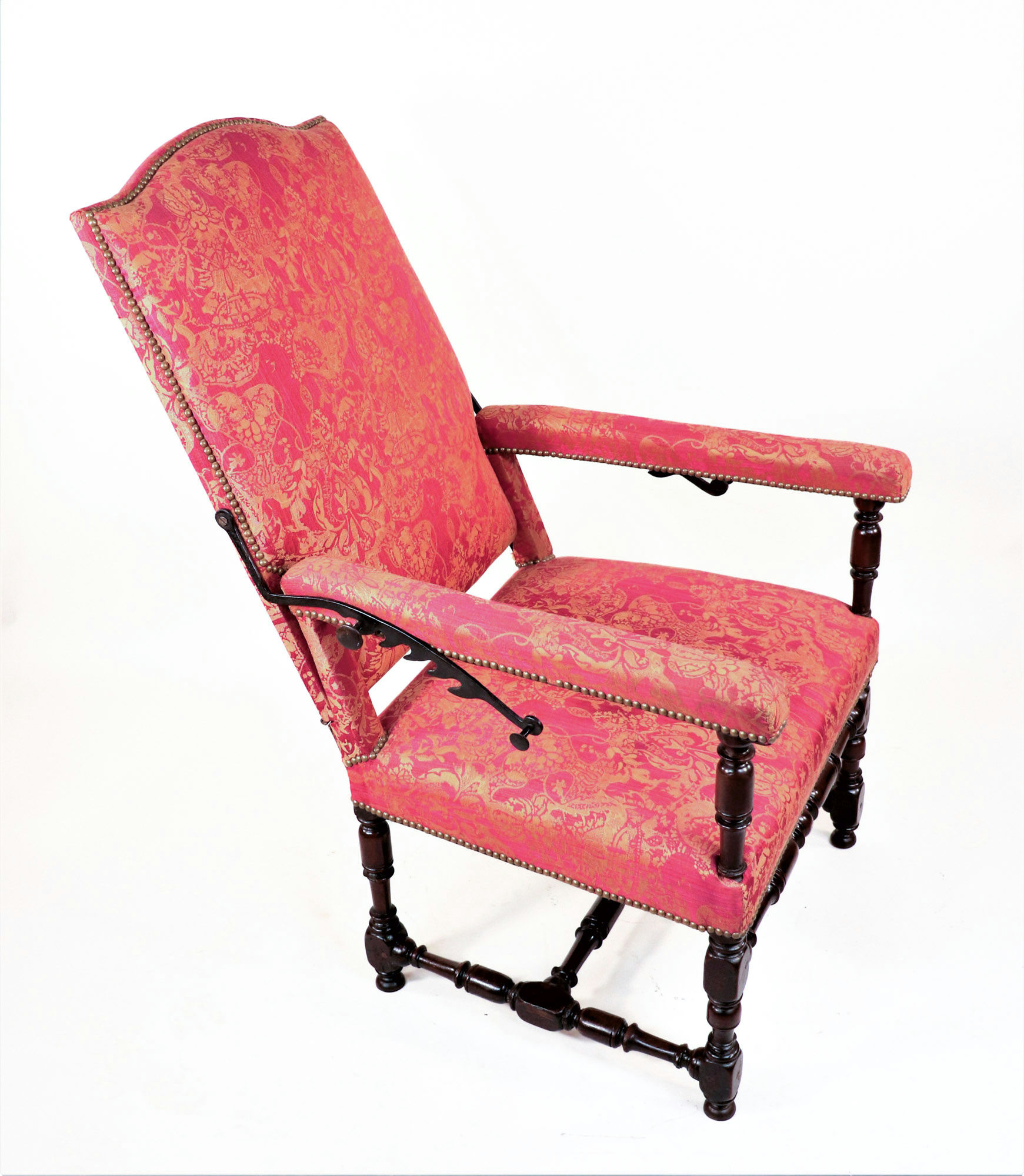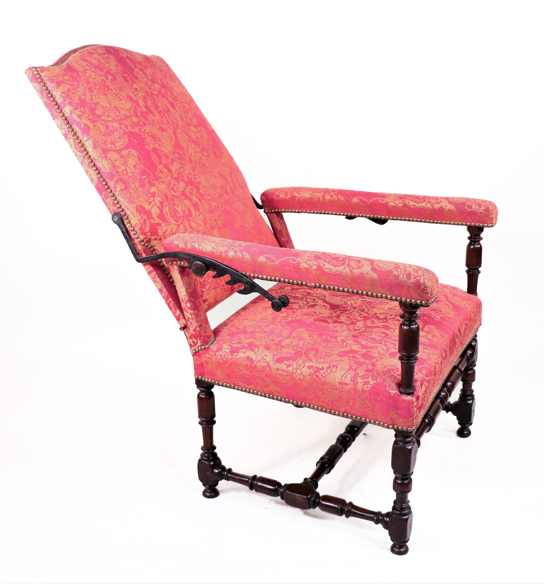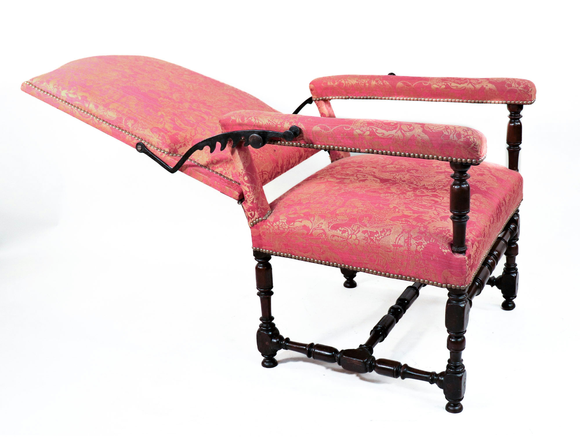 This model, constructed in neighboring England during the same era, may even resemble the French monarch’s reclinable chair. Intended for an English drawing room or parlor, this beautiful piece features elegant jacquard upholstery and turned legs. The backrest can extend almost one-hundred-eight degrees from an upright position, facilitated by a graceful manual mechanism similar to the ratcheting recline features found in modern armchairs. By lifting the supple lengths of walnut flanking either armrest, you can fit the angled teeth around the corresponding knobs to set the chair’s incline.