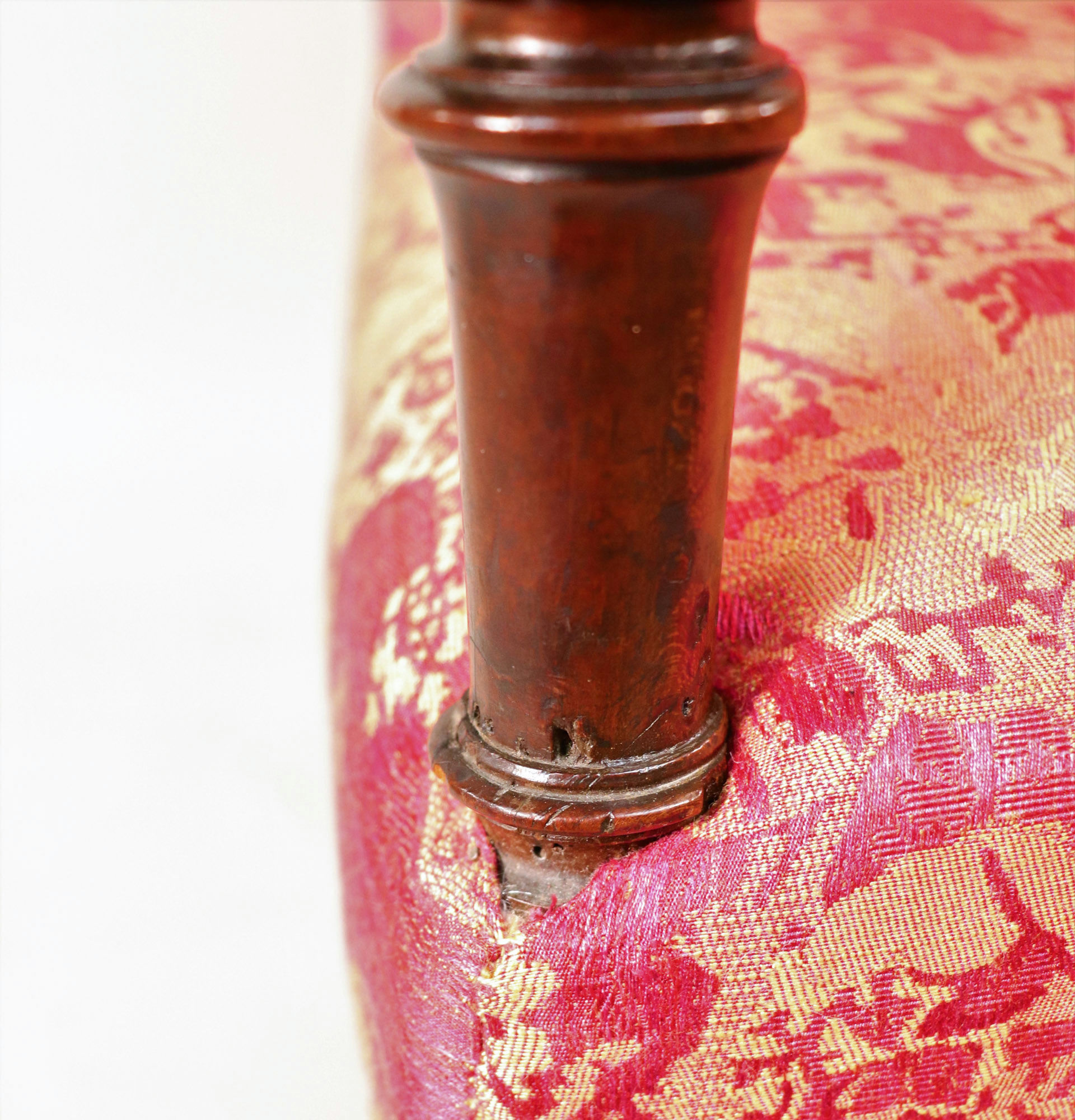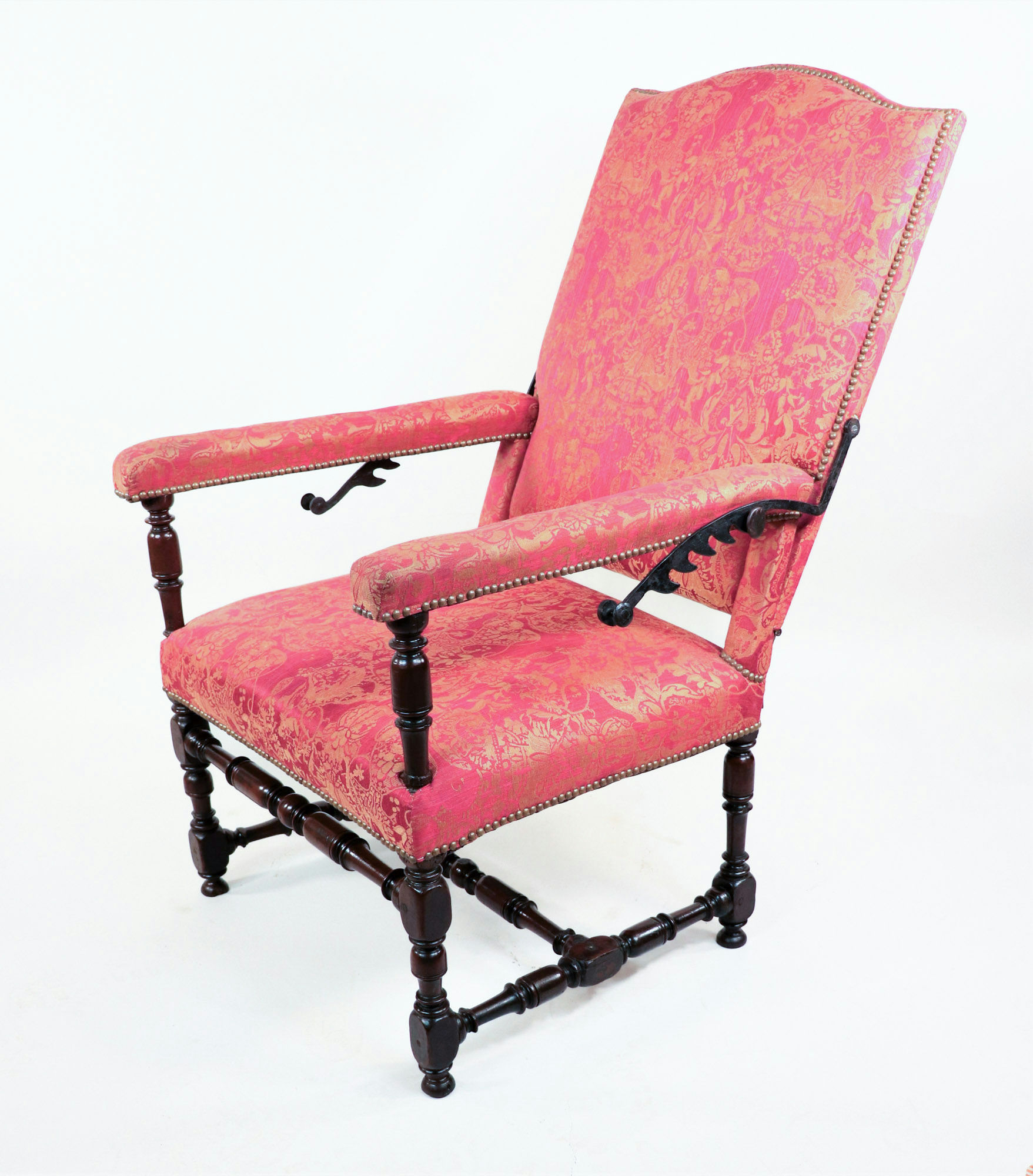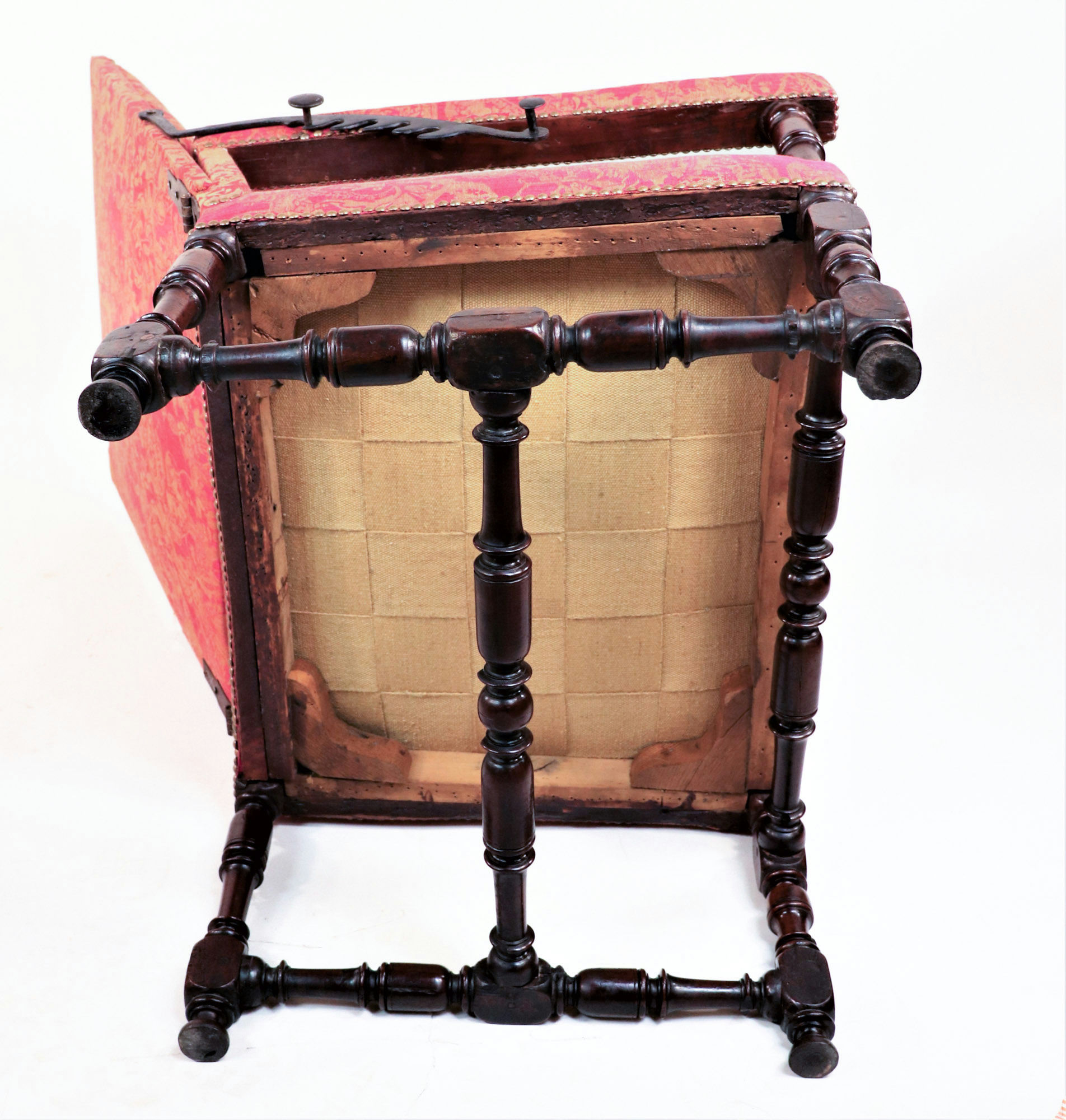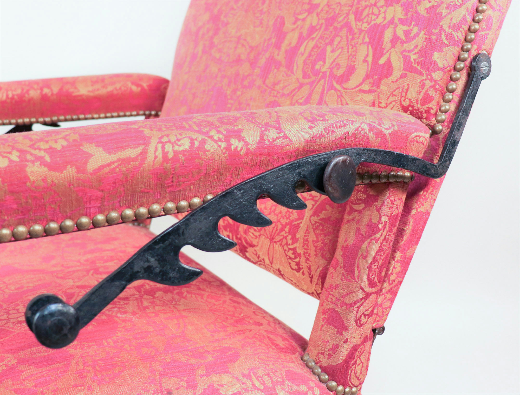 This model, constructed in neighboring England during the same era, may even resemble the French monarch’s reclinable chair. Intended for an English drawing room or parlor, this beautiful piece features elegant jacquard upholstery and turned legs. The backrest can extend almost one-hundred-eight degrees from an upright position, facilitated by a graceful manual mechanism similar to the ratcheting recline features found in modern armchairs. By lifting the supple lengths of walnut flanking either armrest, you can fit the angled teeth around the corresponding knobs to set the chair’s incline.