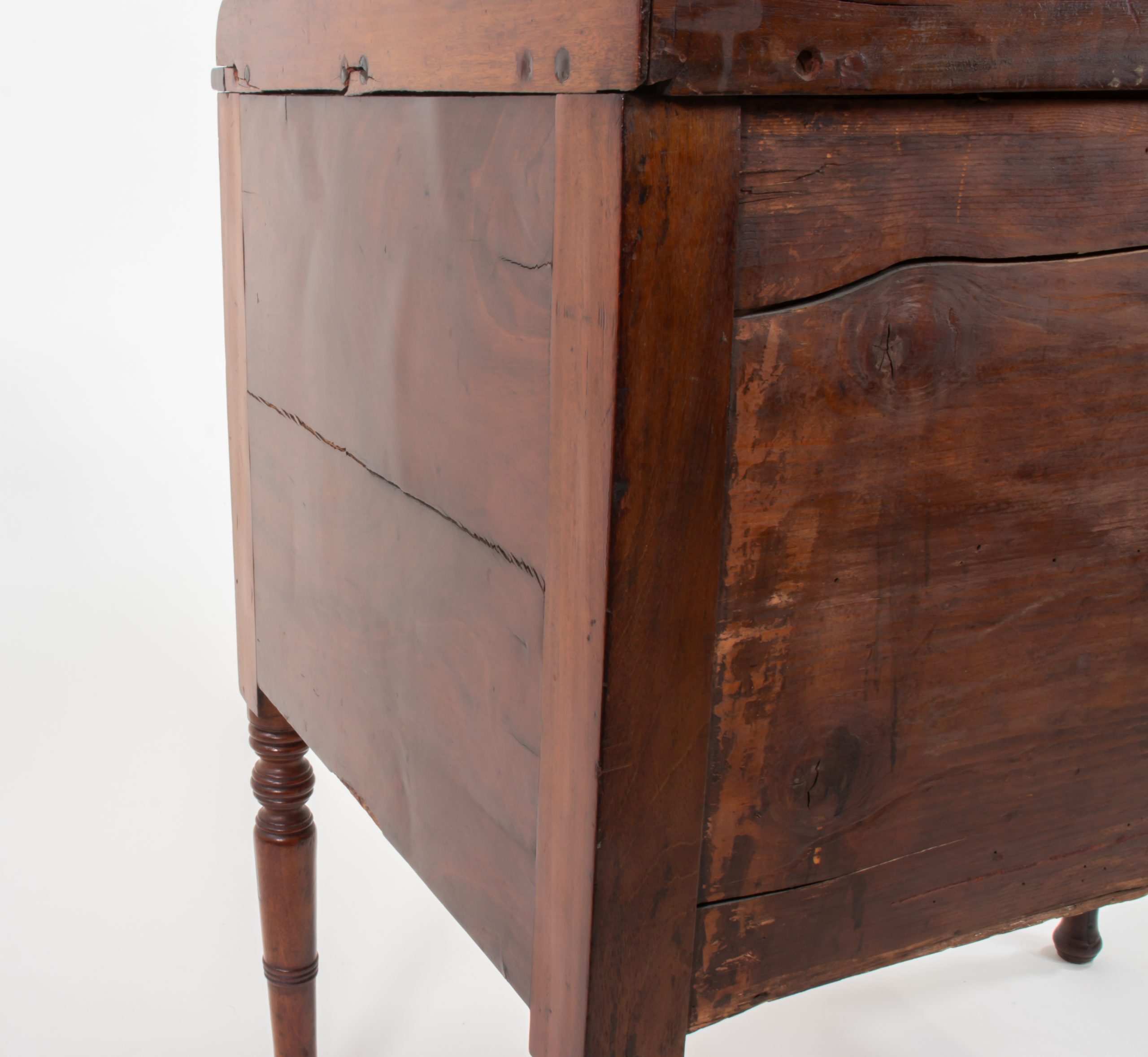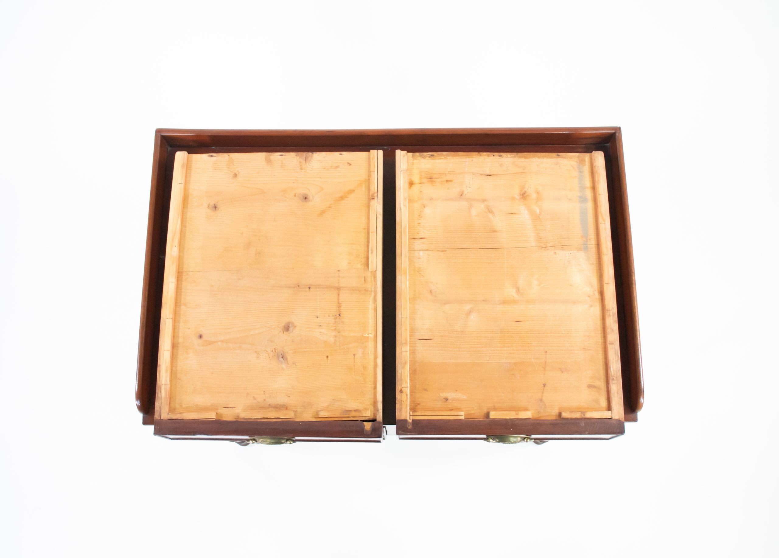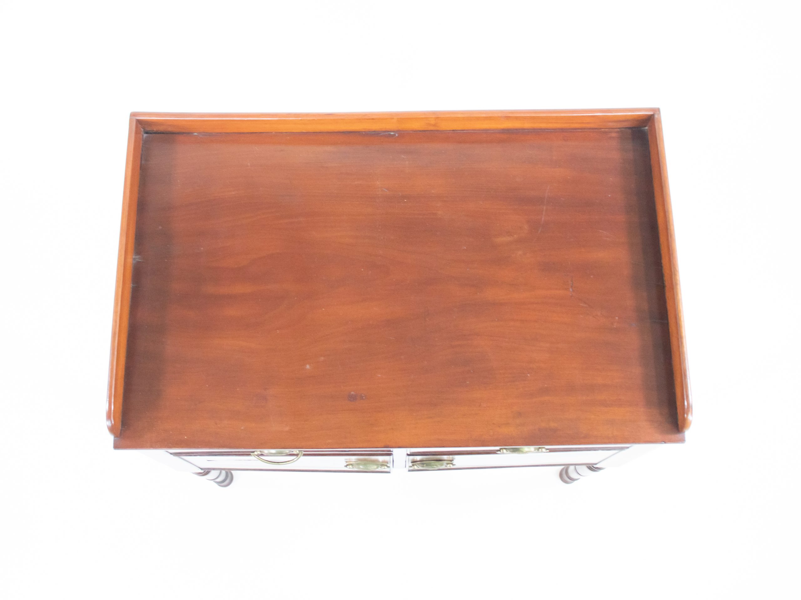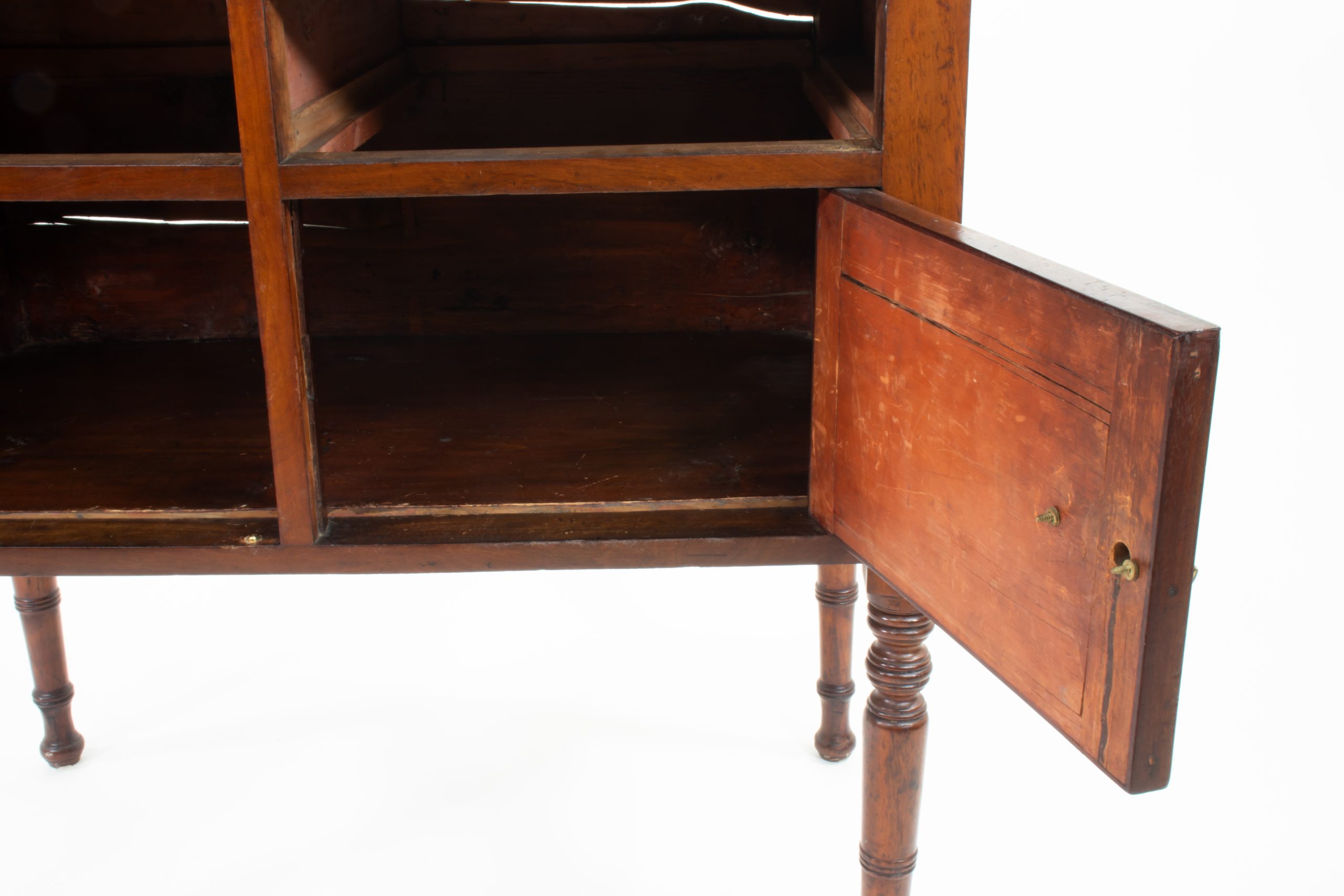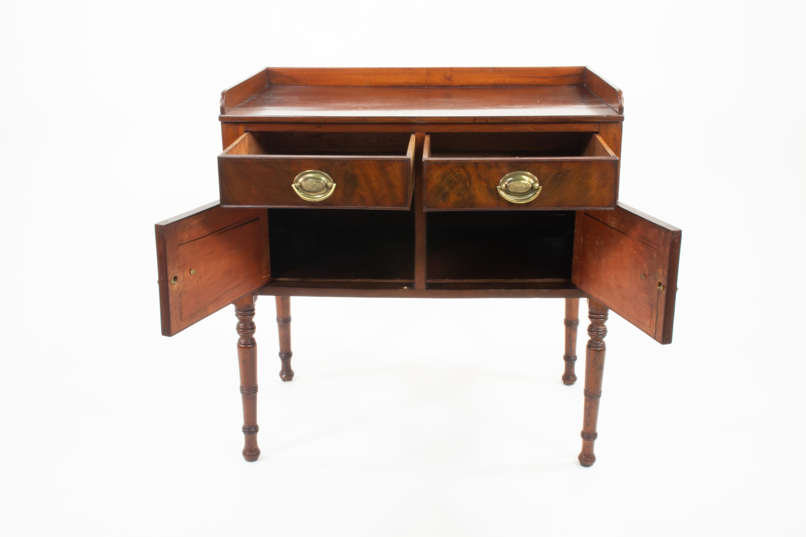 Once serving as a chamber cabinet—a refined washstand designed for a gentleman’s or lady’s dressing room—it exemplifies the discreet elegance and functional craftsmanship of mid‑nineteenth‑century English furniture. The brass oval pulls, later replacements, harmonize with the cabinet’s original joinery, gallery top, and carcass, all of which remain intact.