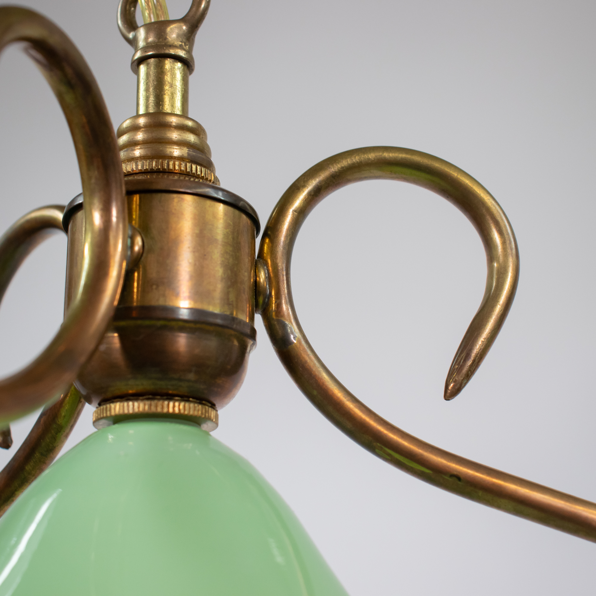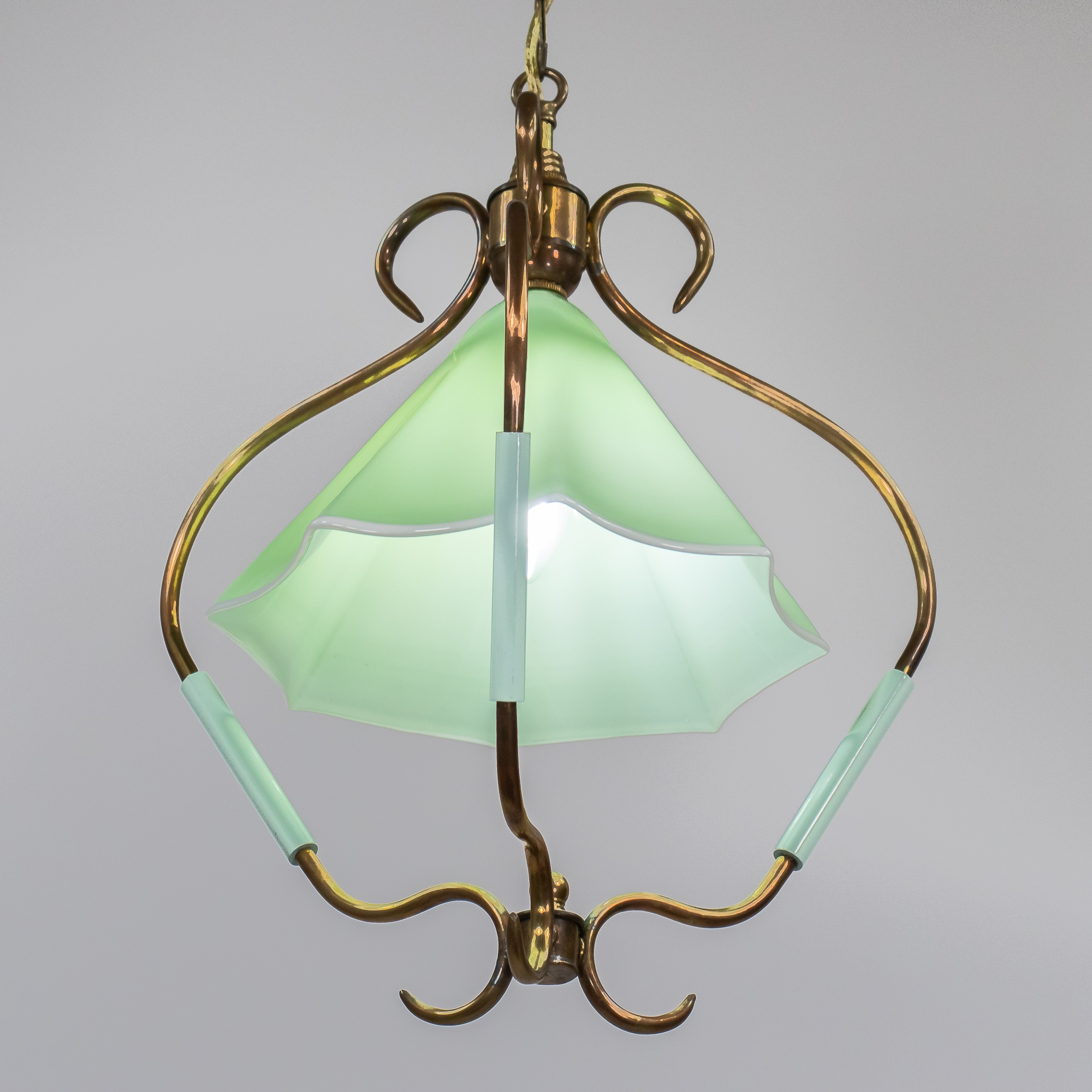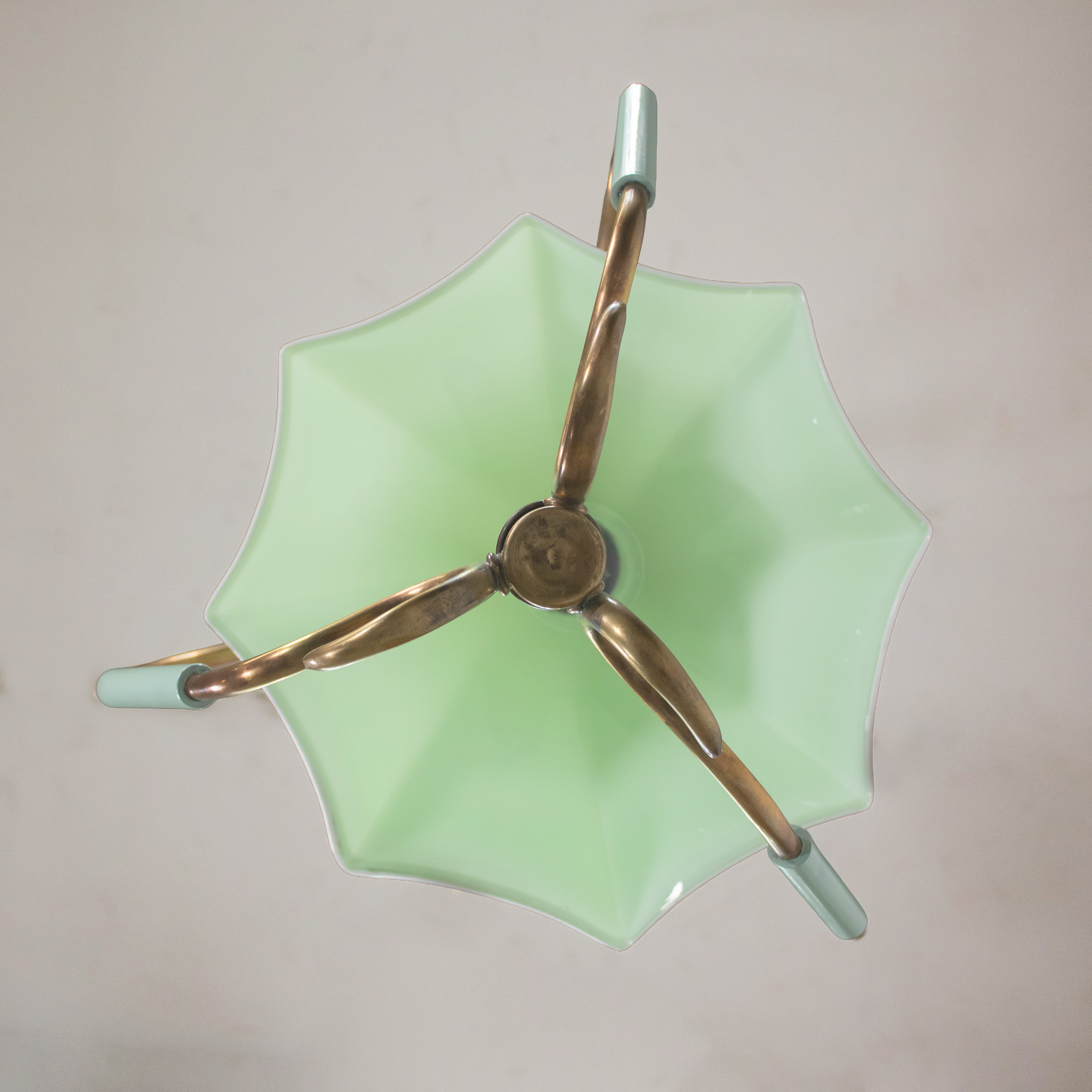 The pendant balances simplicity and sophistication — the brass structure with pale mint accents complements the semi‑translucent green glass, creating a soft, diffused illumination.