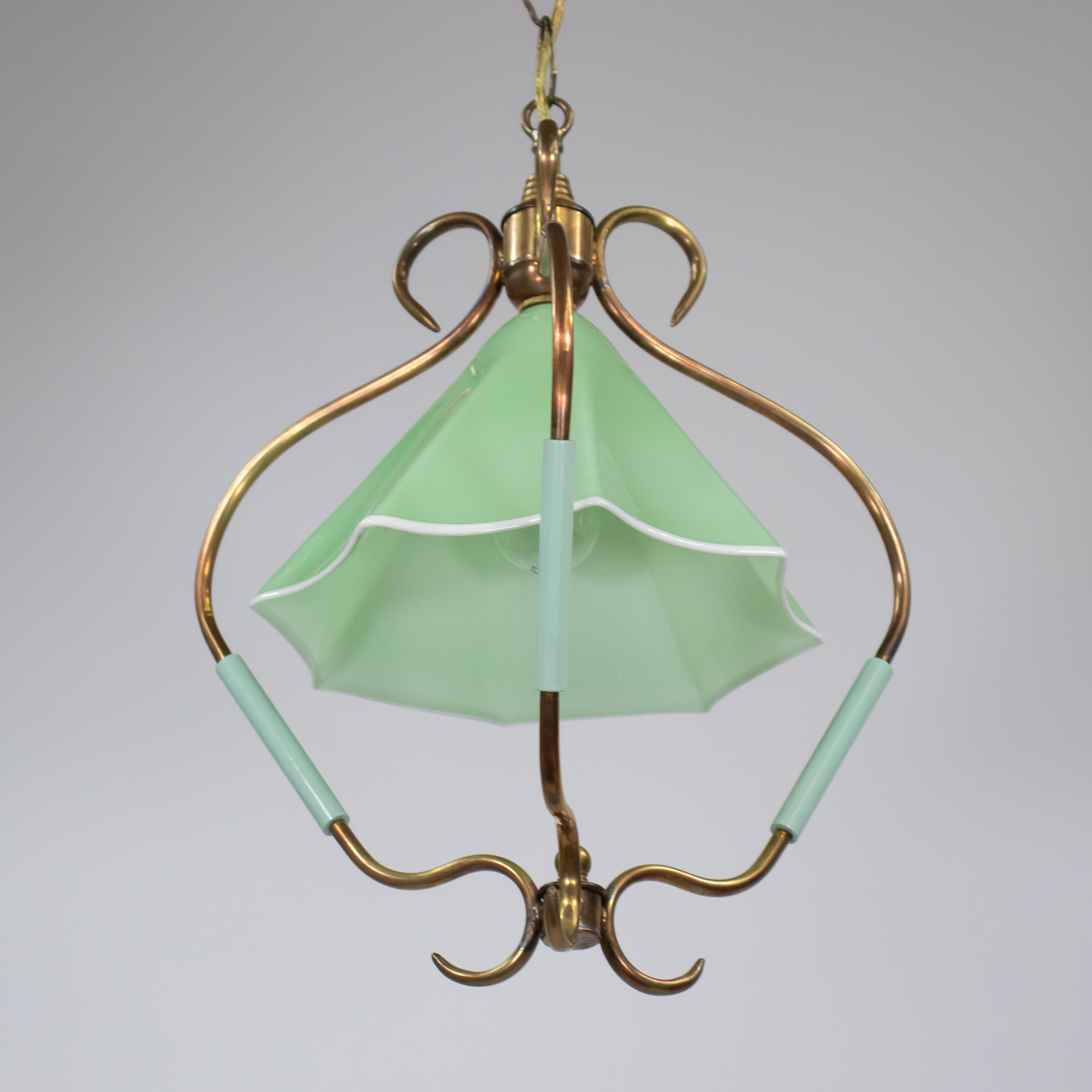 This MCM Italian pendant light features a sculptural frame of gracefully curved brass tubing supporting a hand‑blown green opaline glass shade edged in white. The distinctive bell‑like form and airy silhouette embody the elegance of postwar Italian modernism, recalling designs produced by Fontana Arte and other Milanese ateliers of the 1950s.