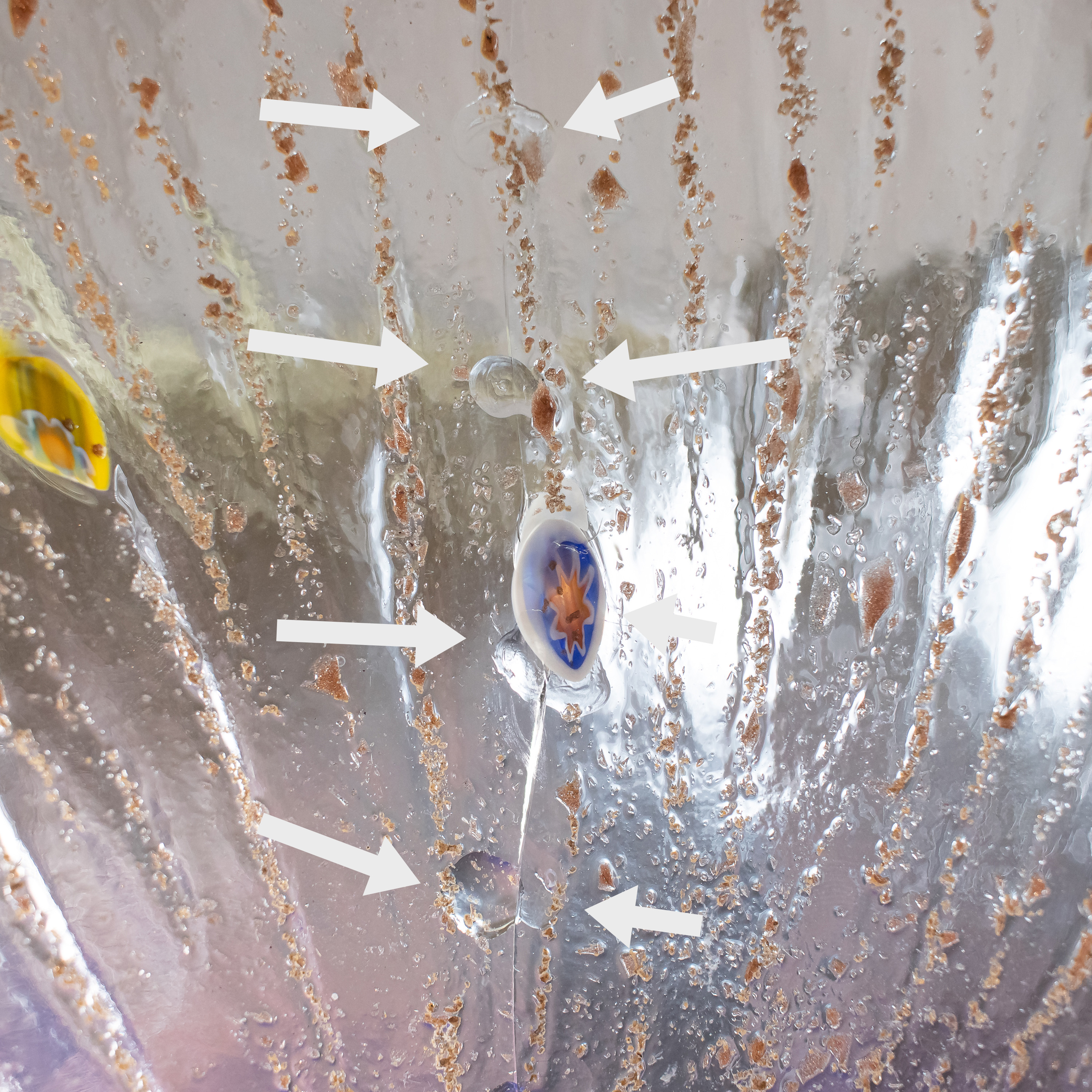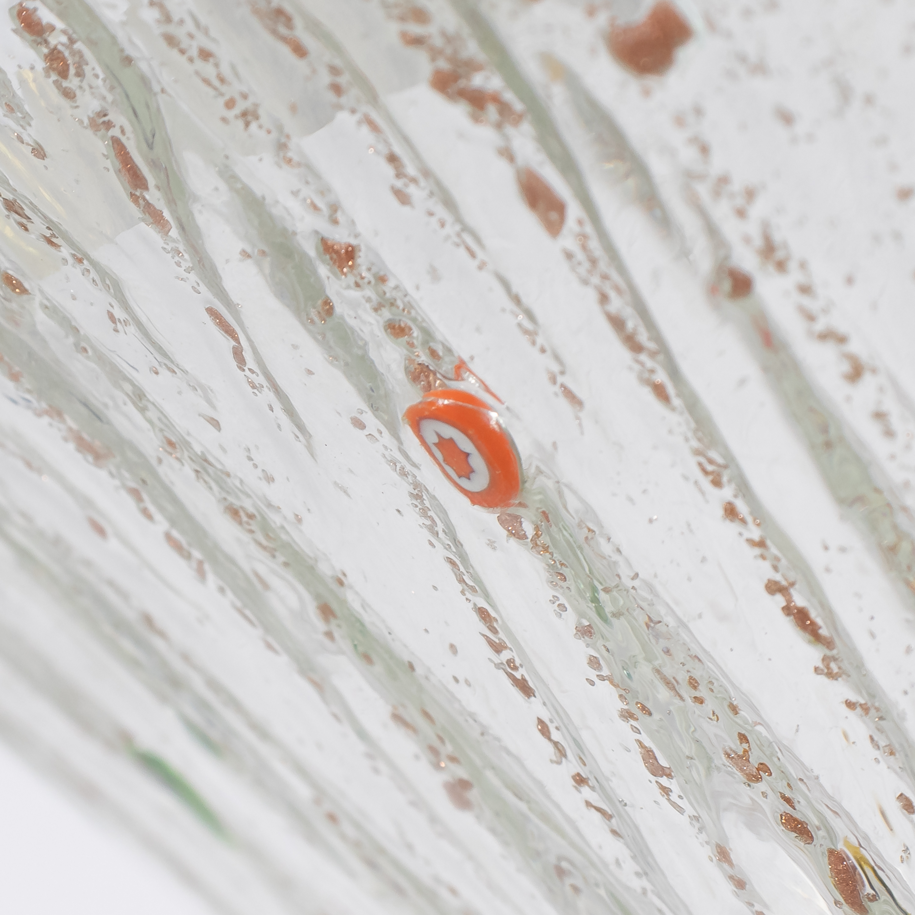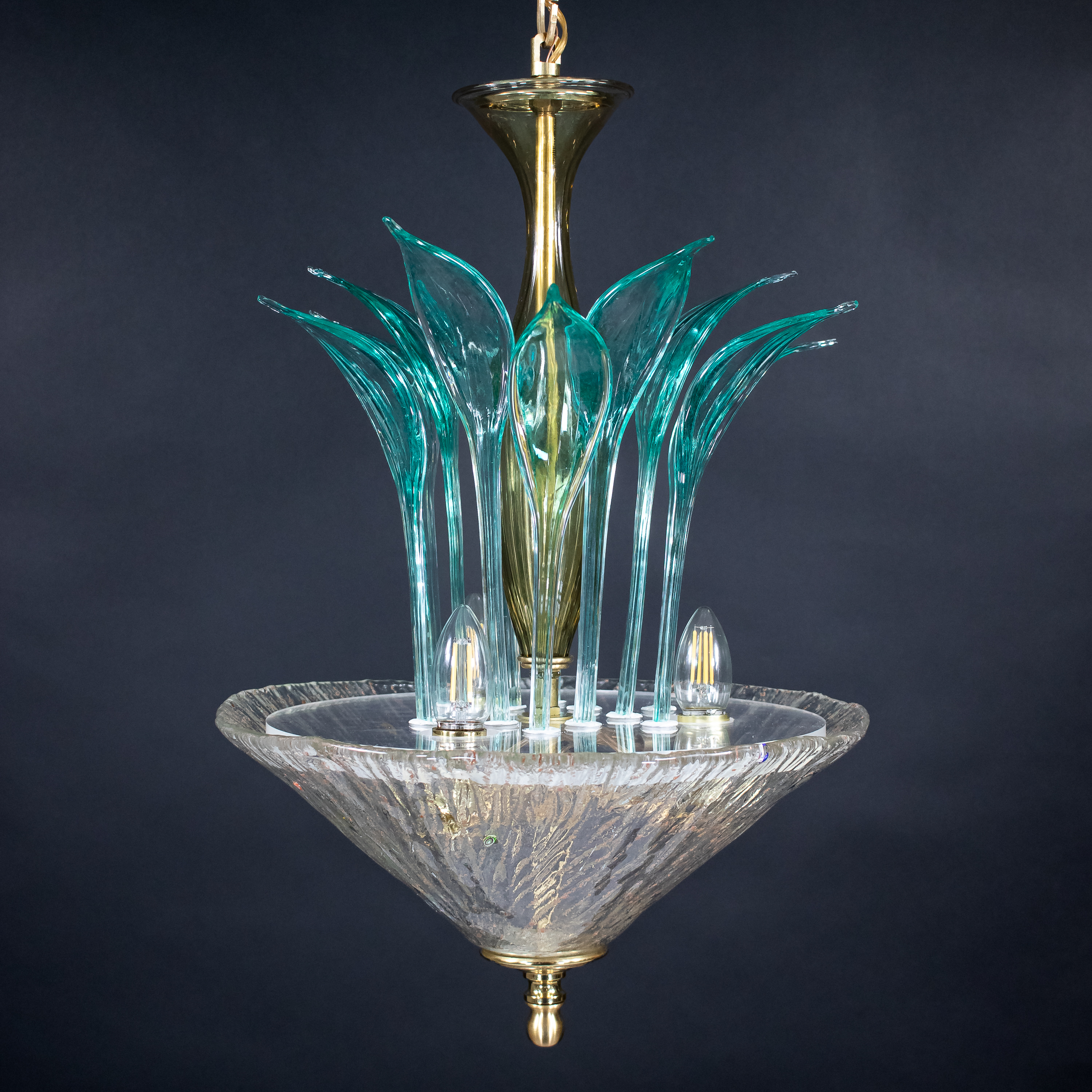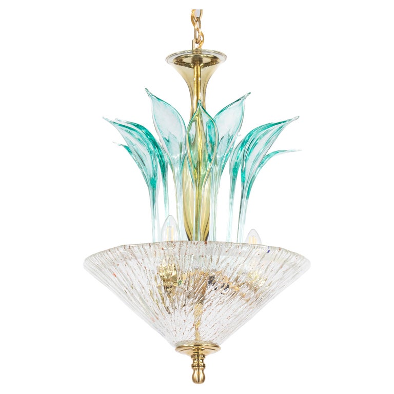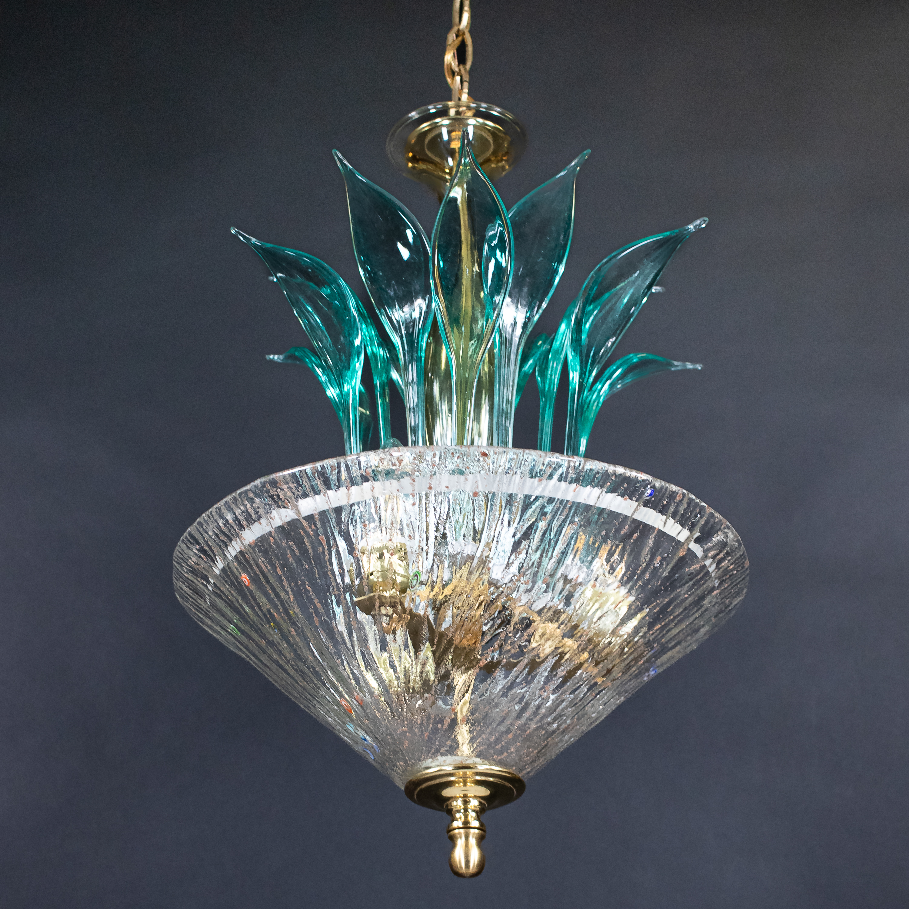 Mid‑Century Italian Murano glass pendant chandelier, the three‑light interior encased by a flared, ribbed bowl richly infused with copper aventurina and dotted with colorful millefiori canes, above which twelve hand‑blown teal‑green leaf‑form elements rise from a slender central column in an expressive, organic Venetian style. Copper aventurina, created by suspending fine copper particles in the molten glass, produces a warm metallic sparkle, while the scattered, embedded millefiori “thousand flowers” canes add vibrant, jewel‑like bursts of color that make this piece especially luminous. The combination of aventurina, millefiori decoration, and sculptural leaf‑form elements is highly consistent with mid‑century work by Barovier & Toso; however, this chandelier is not signed and is therefore offered as “in the manner of Barovier,” without attribution to the firm.