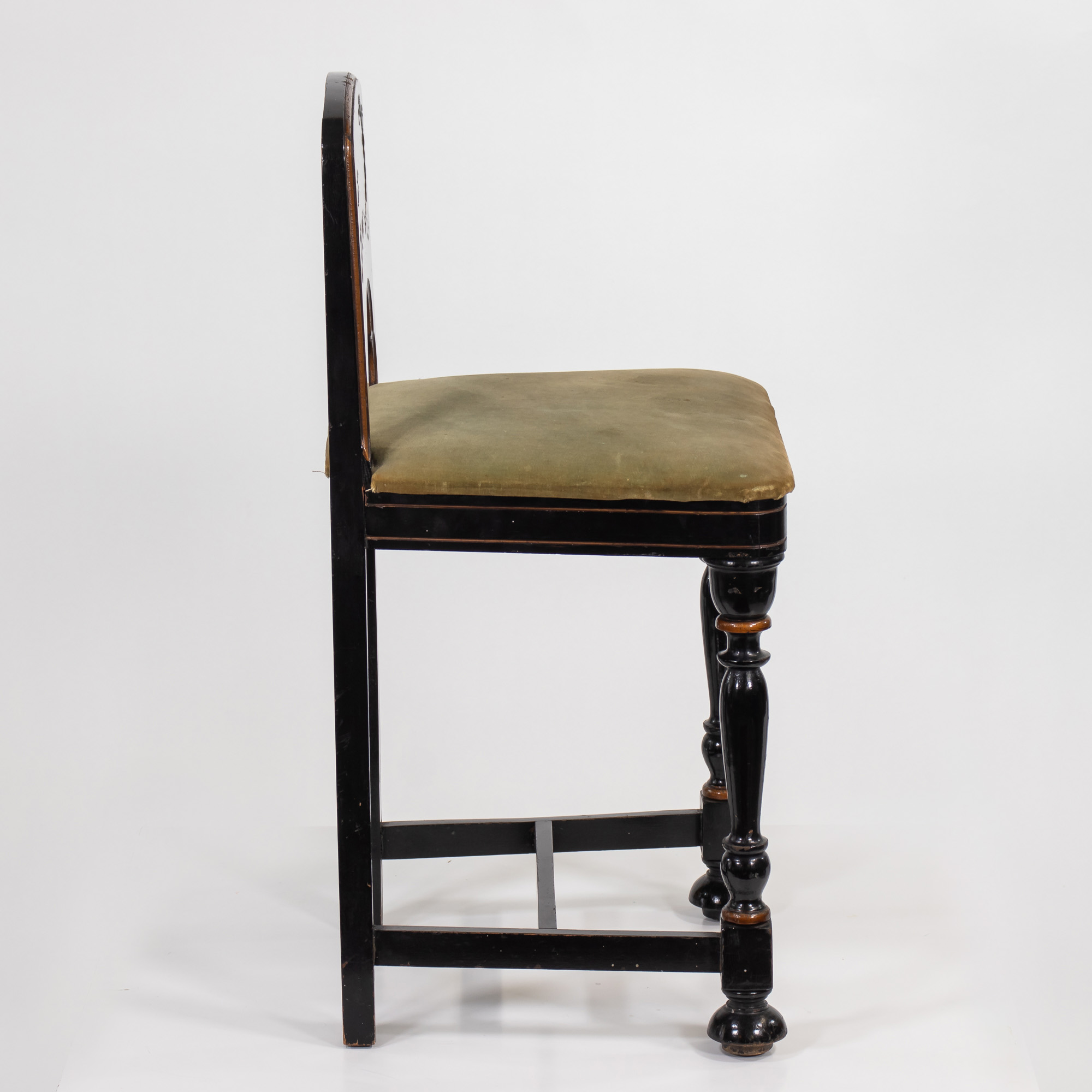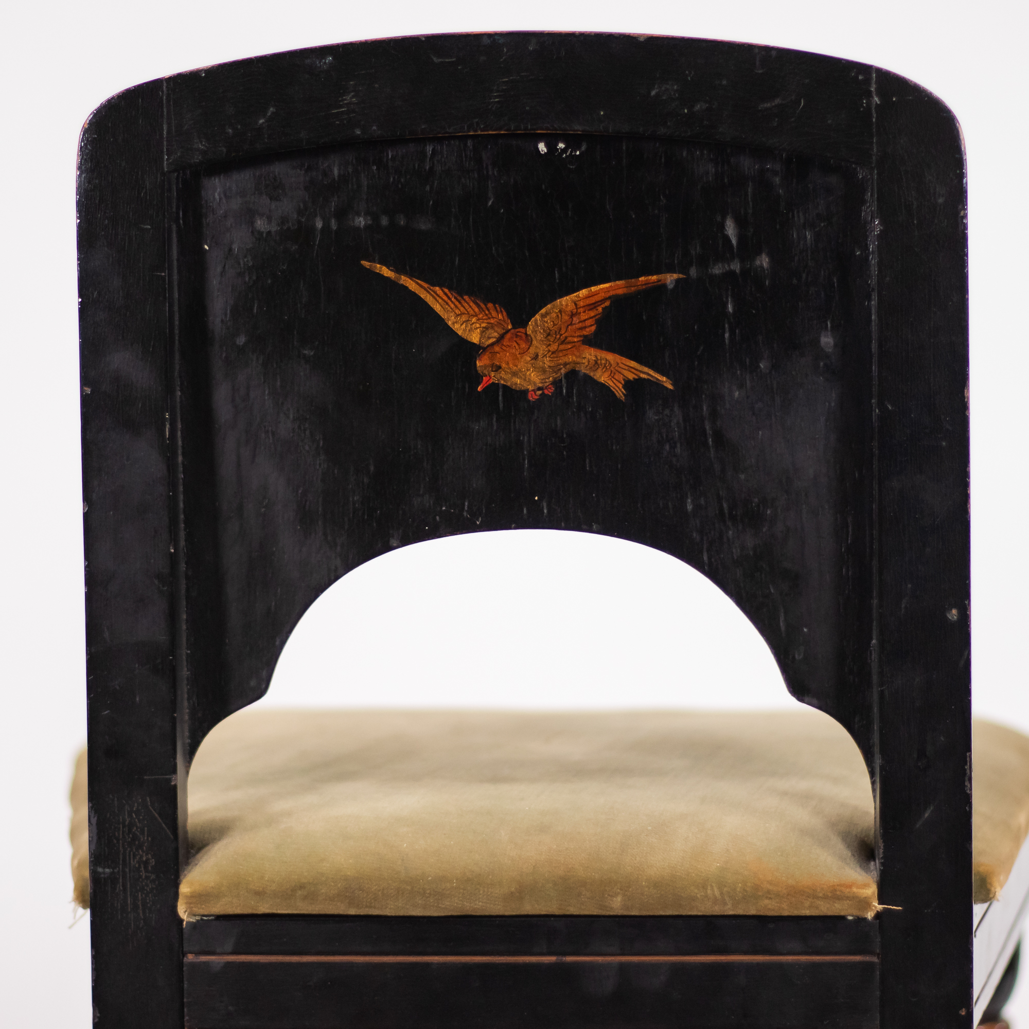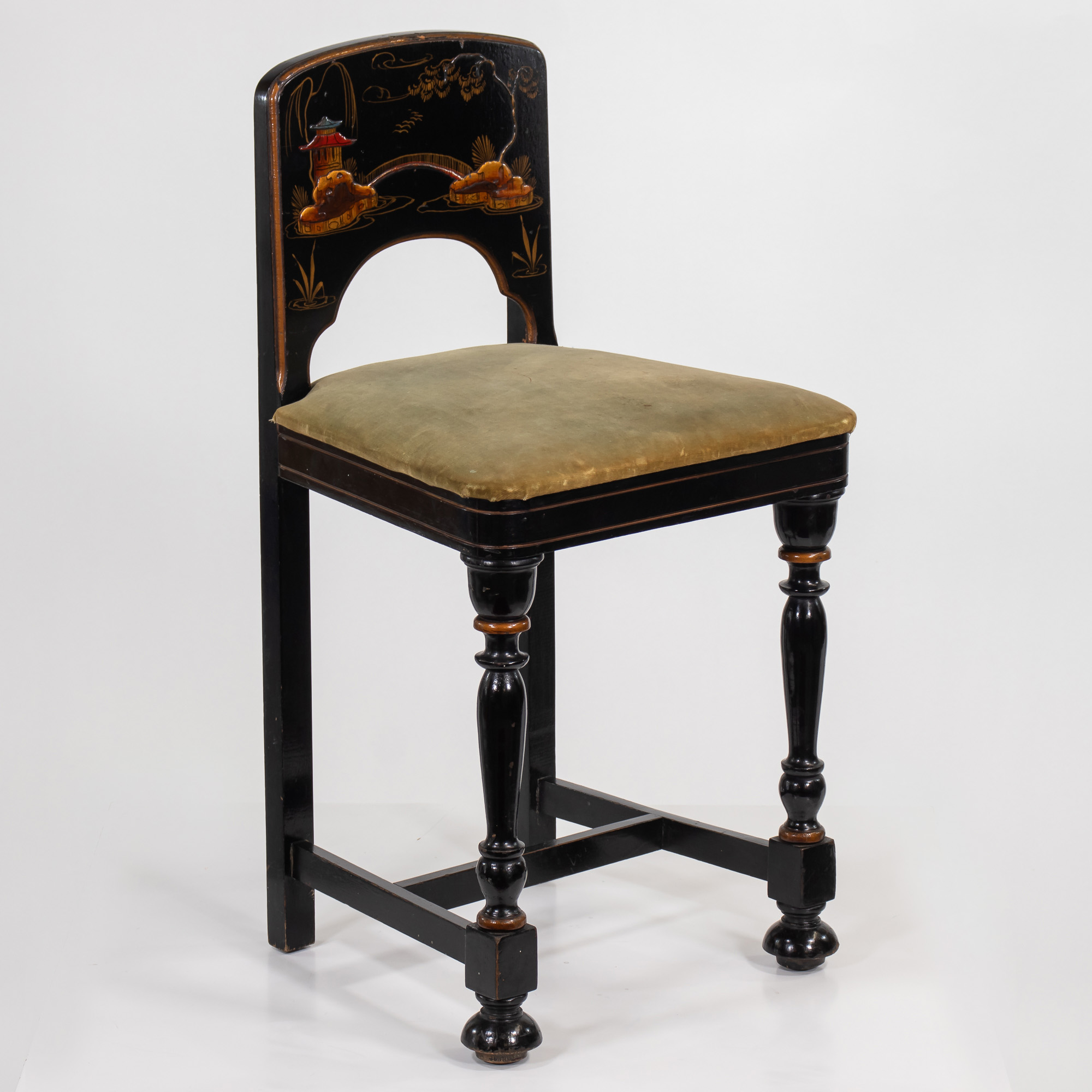This midcentury Chinoserie accent chair features a lacquered backrest showcasing an Asian landscape motif, characteristic of the style. Chinoserie refers to the style that reflects Chinese artistic influences in Western art and design. The seat is upholstered in olive green fabric, offering comfort and support. Based on its dimensions, this chair is designed as a small accent piece that comfortably accommodates both petite adults and children. FREE SHIPPING!