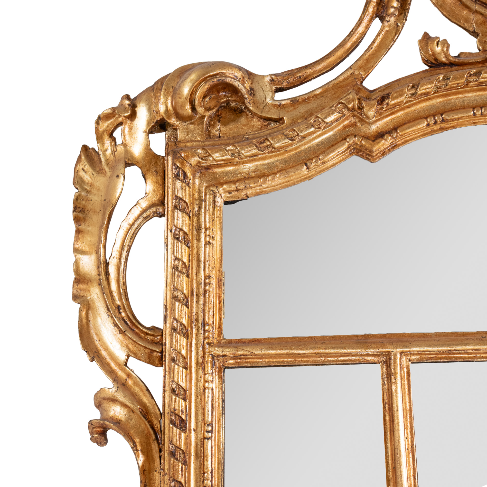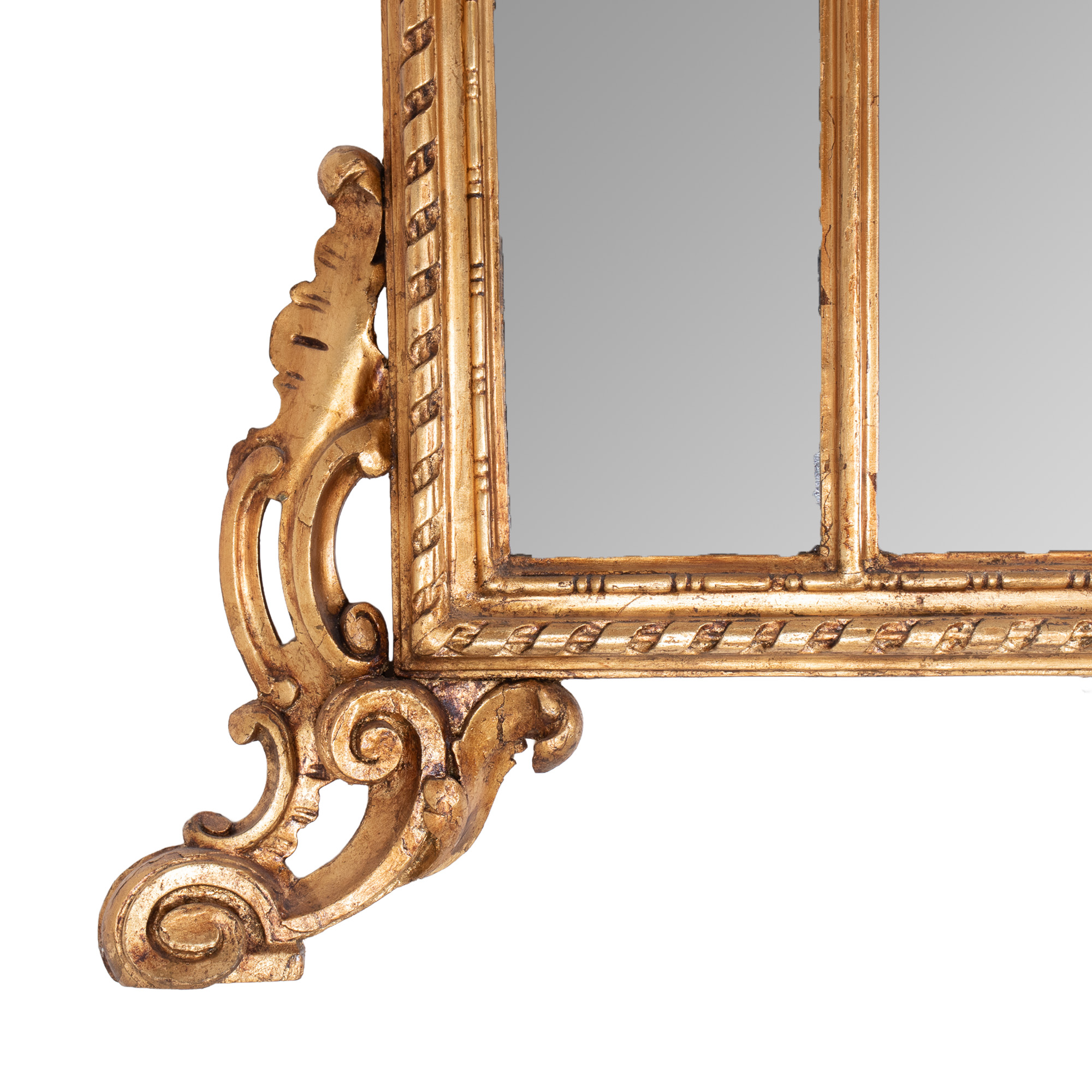 A magnificent late‑19th‑century French giltwood and gesso mirror in the Louis XIV Revival style, circa 1870–1890, standing nearly eight feet tall. The richly carved frame presents a pierced crest of scrolling acanthus and foliate motifs centered by a cartouche, above a divided mirror plate framed by rope‑carved borders and elaborate voluted corners.