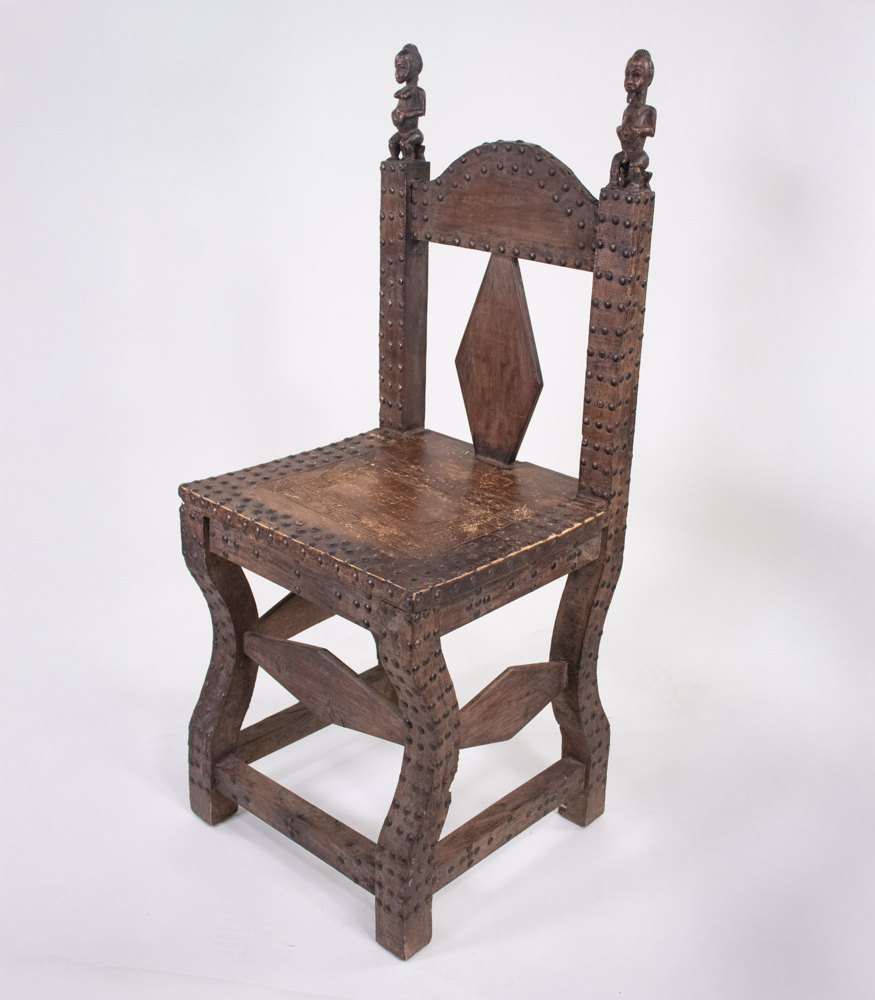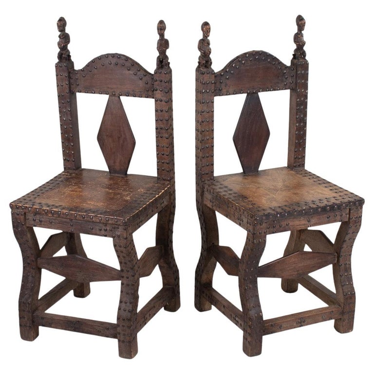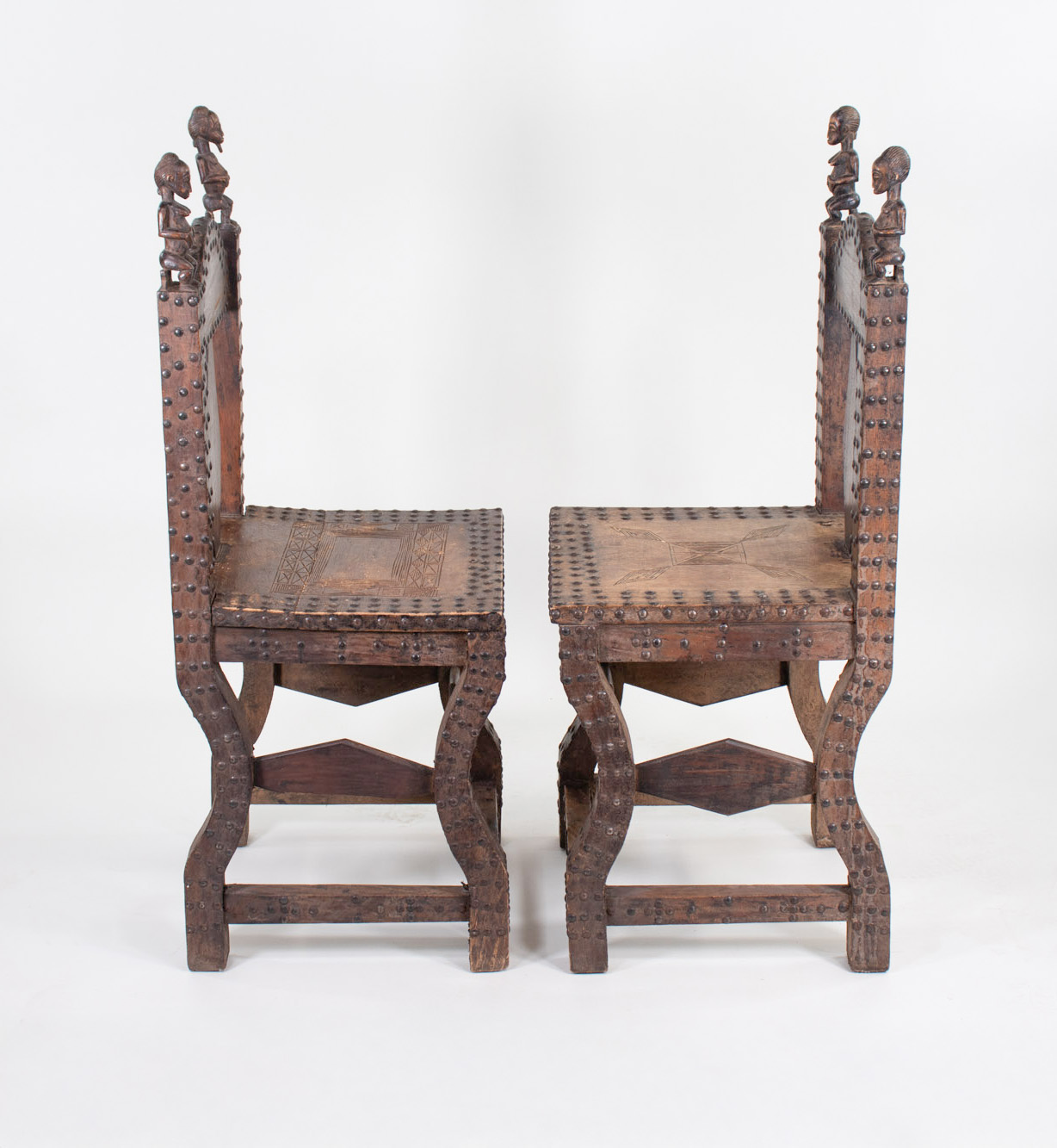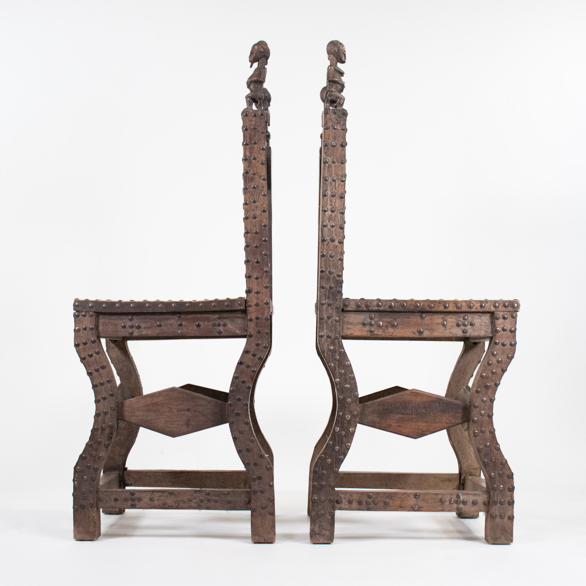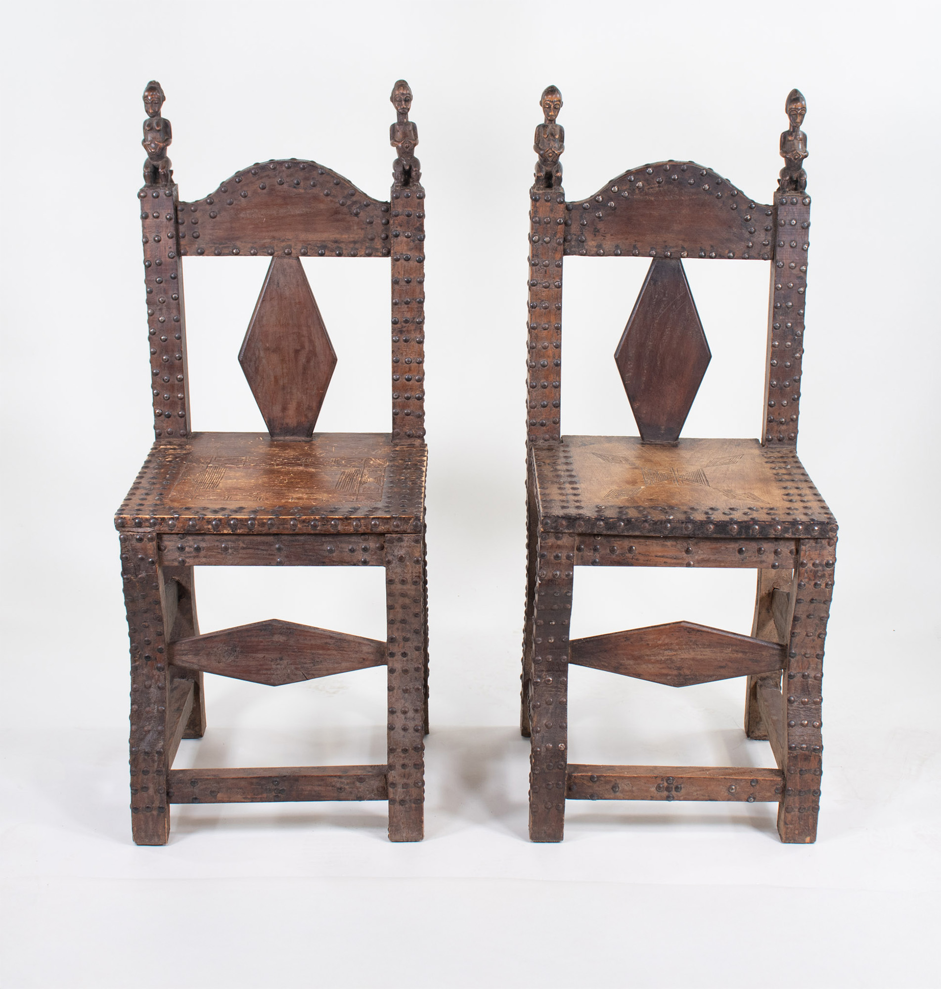 Hand-carved from dense hardwood, these chairs feature intricate detailing that illustrates their cultural significance and ceremonial use. The high backs are adorned with meticulously carved human figures as finials, while geometric diamond motifs and studded embellishments add both structural and decorative appeal. The figures are depicted in an upright posture with their legs slightly bent and hands resting on their abdomen, conveying a sense of dignity and poise.