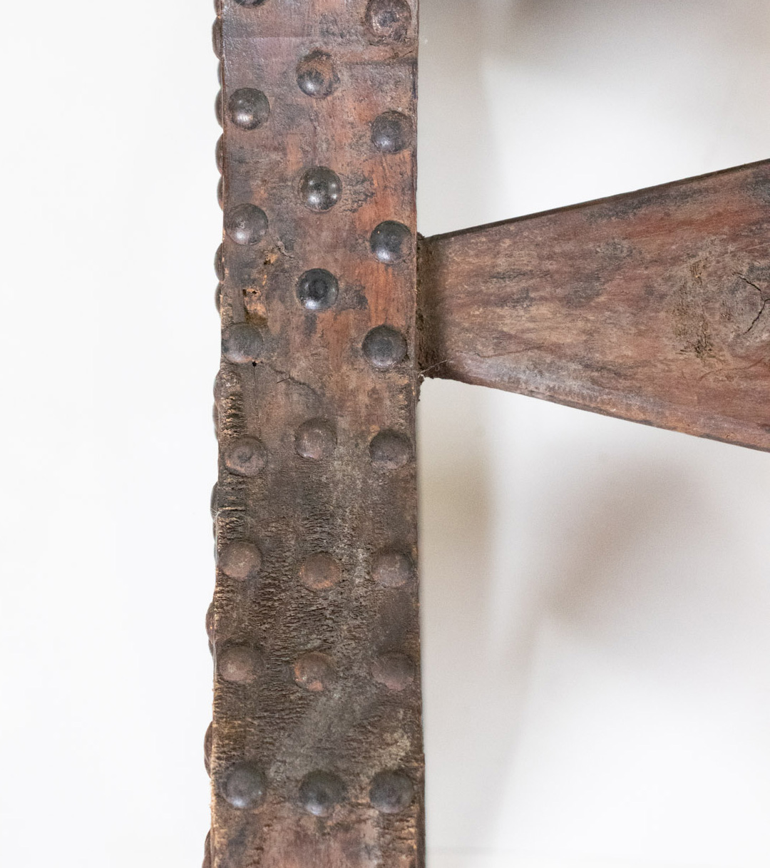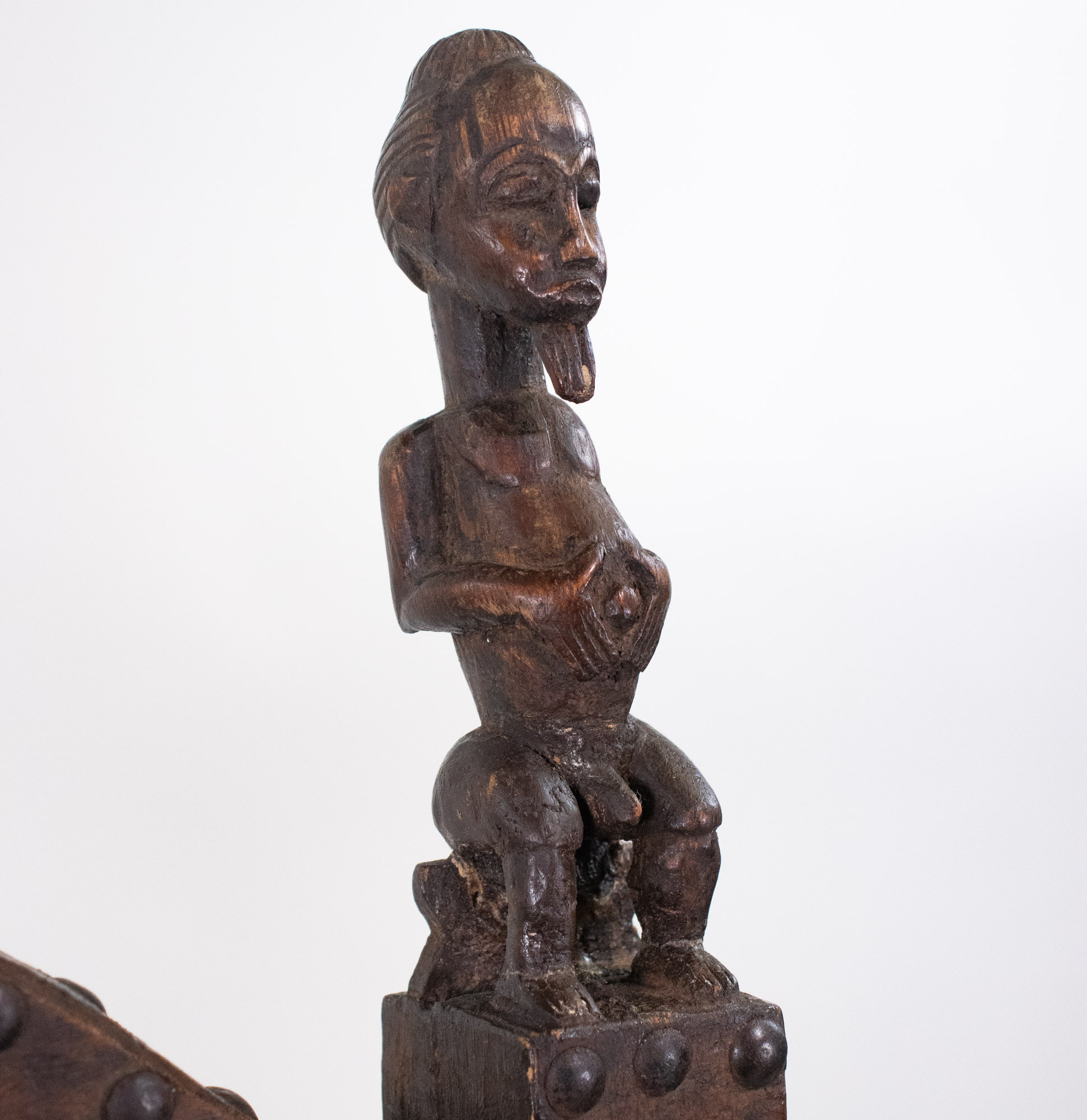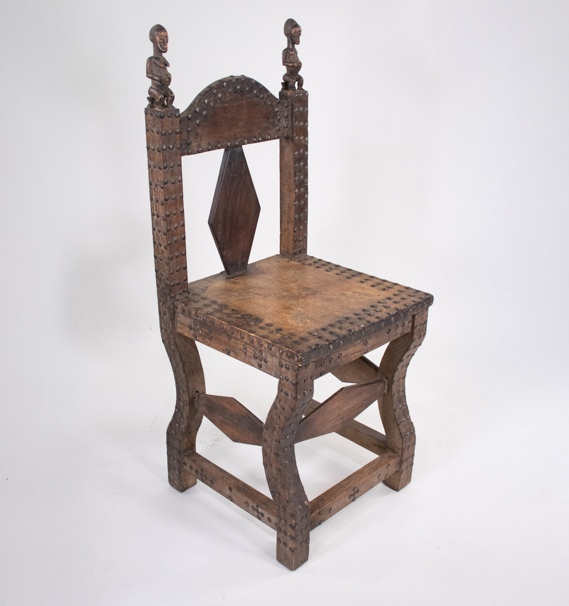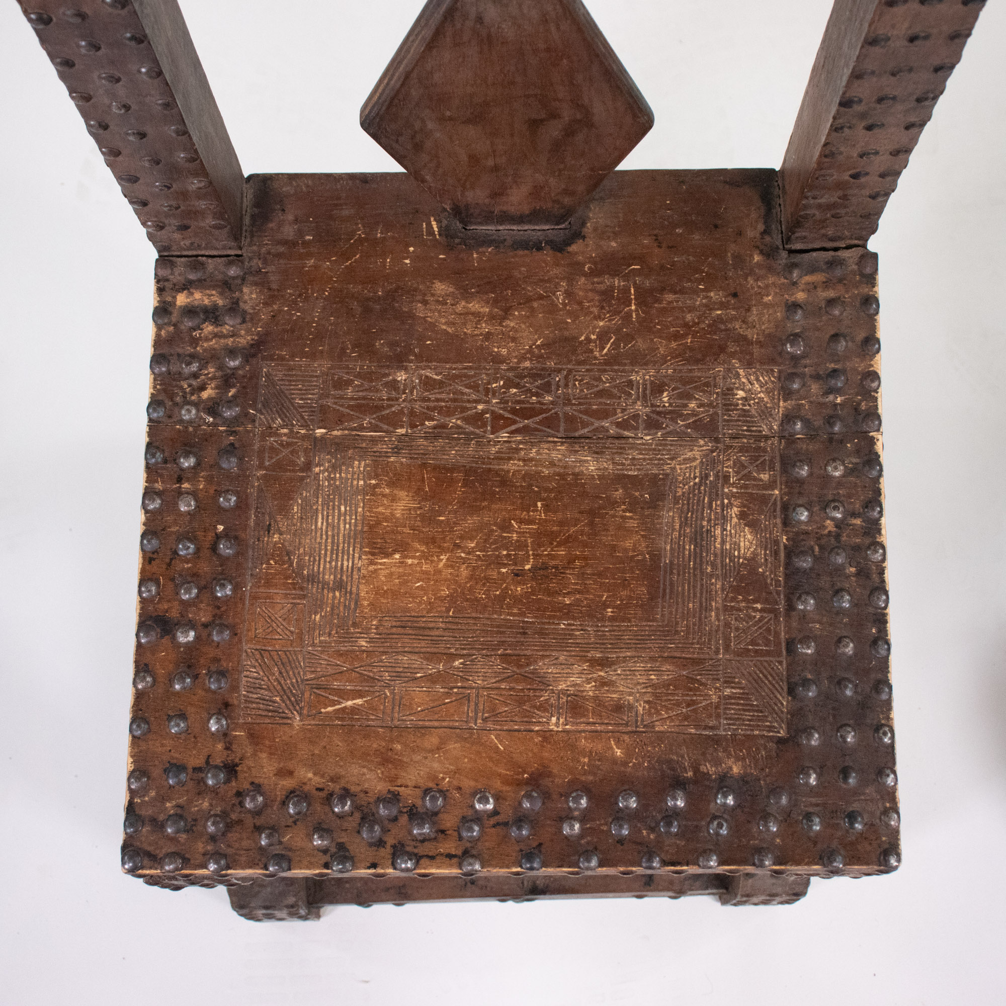 Hand-carved from dense hardwood, these chairs feature intricate detailing that illustrates their cultural significance and ceremonial use. The high backs are adorned with meticulously carved human figures as finials, while geometric diamond motifs and studded embellishments add both structural and decorative appeal. The figures are depicted in an upright posture with their legs slightly bent and hands resting on their abdomen, conveying a sense of dignity and poise.