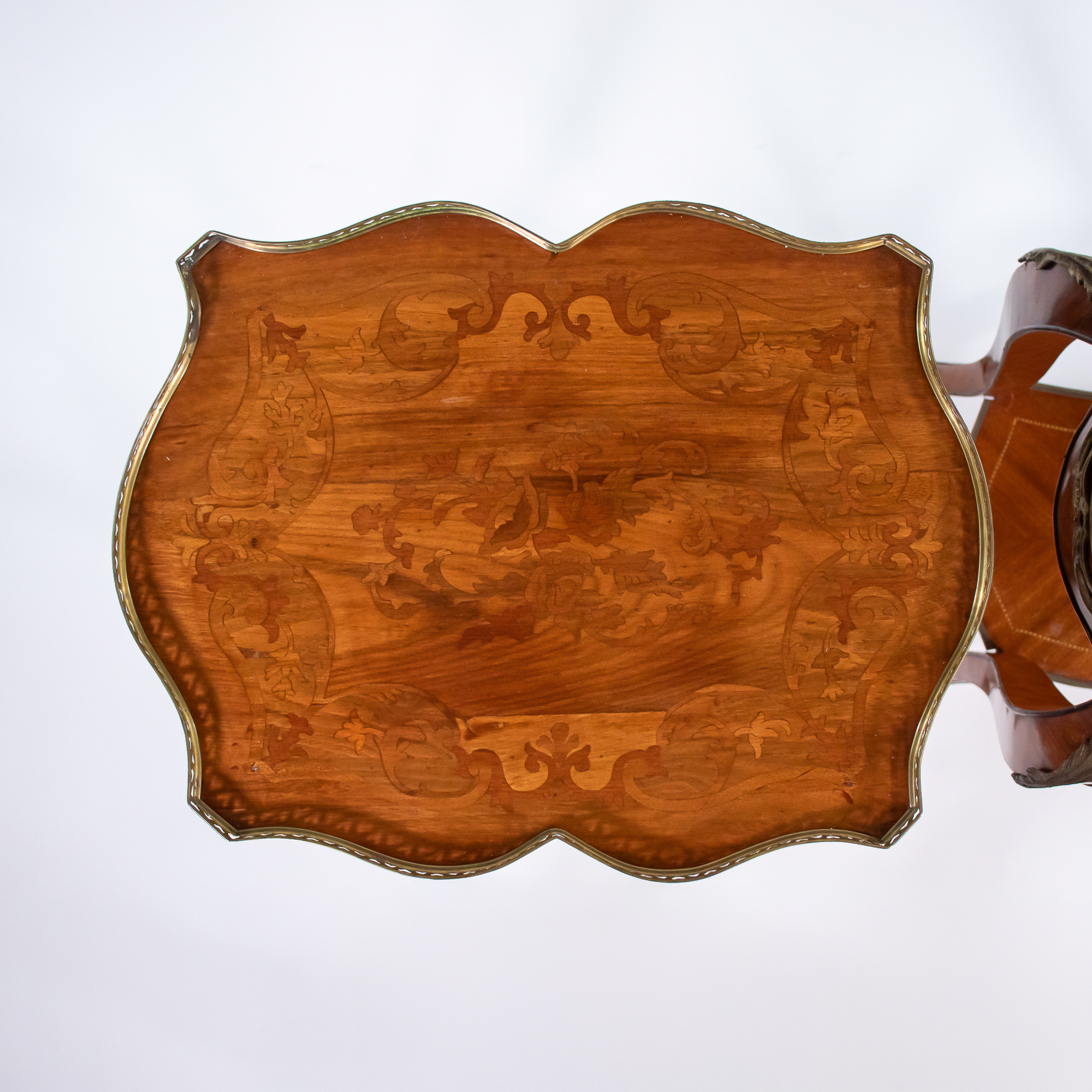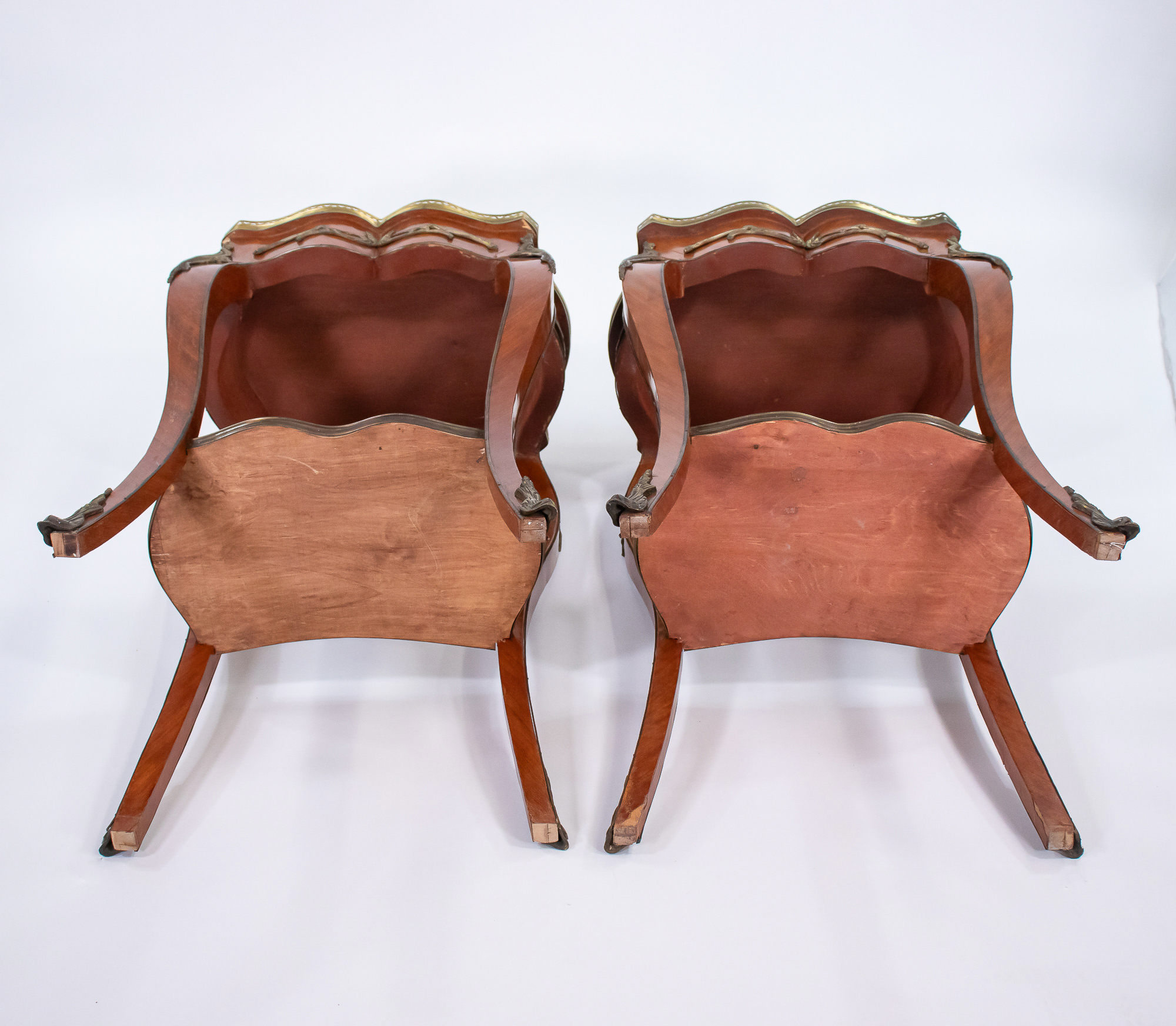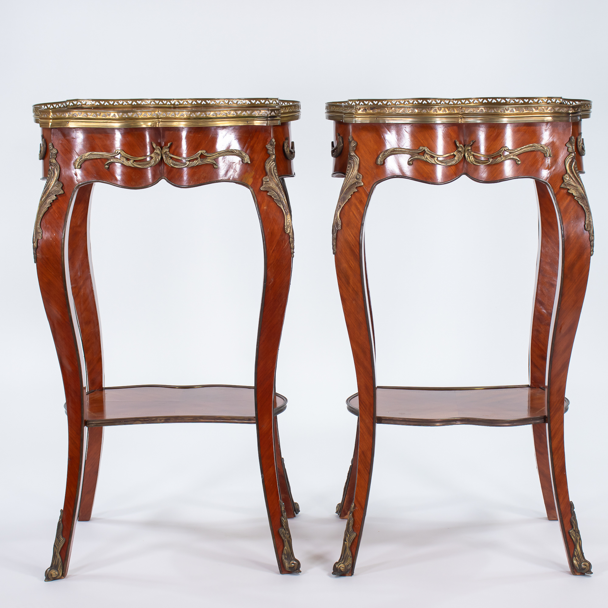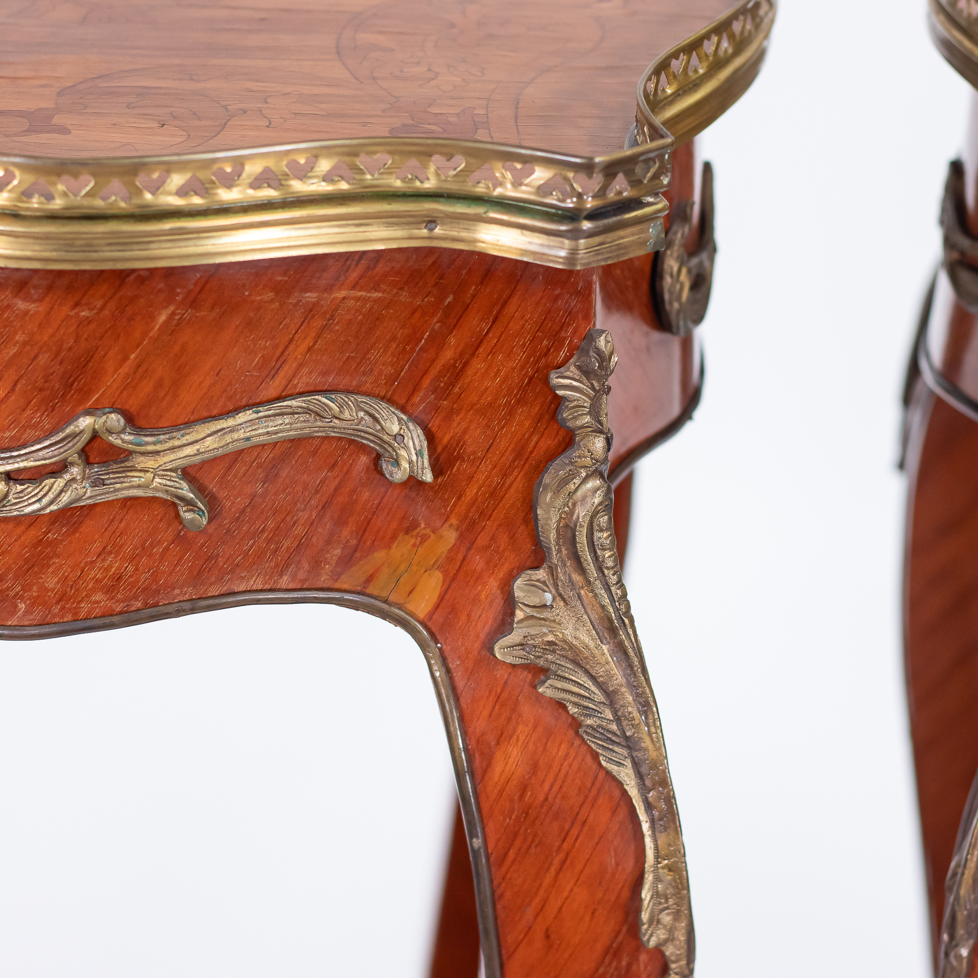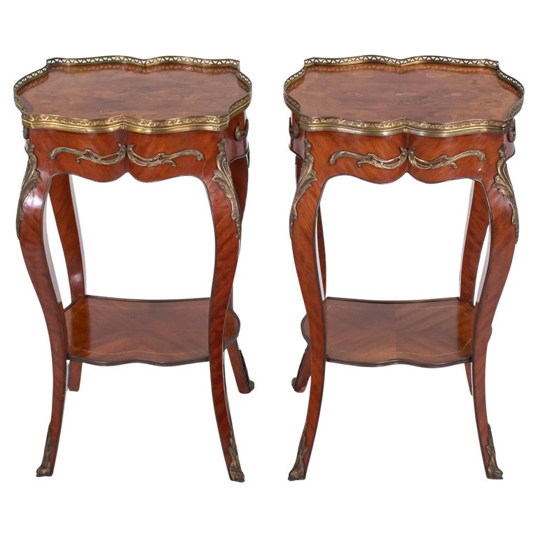These exquisite end tables are constructed from pine with a rich mahogany veneer, showcasing the refined craftsmanship characteristic of early 20th-century French design. Each gueridon features a gracefully scalloped top adorned with intricate inlays, elegantly framed by a delicate brass gallery and bronze appliques that enhance their elegance. The tables rest on slender, curved legs that culminate in bronze sabots, exhibiting a blend of functionality and artistic appeal.