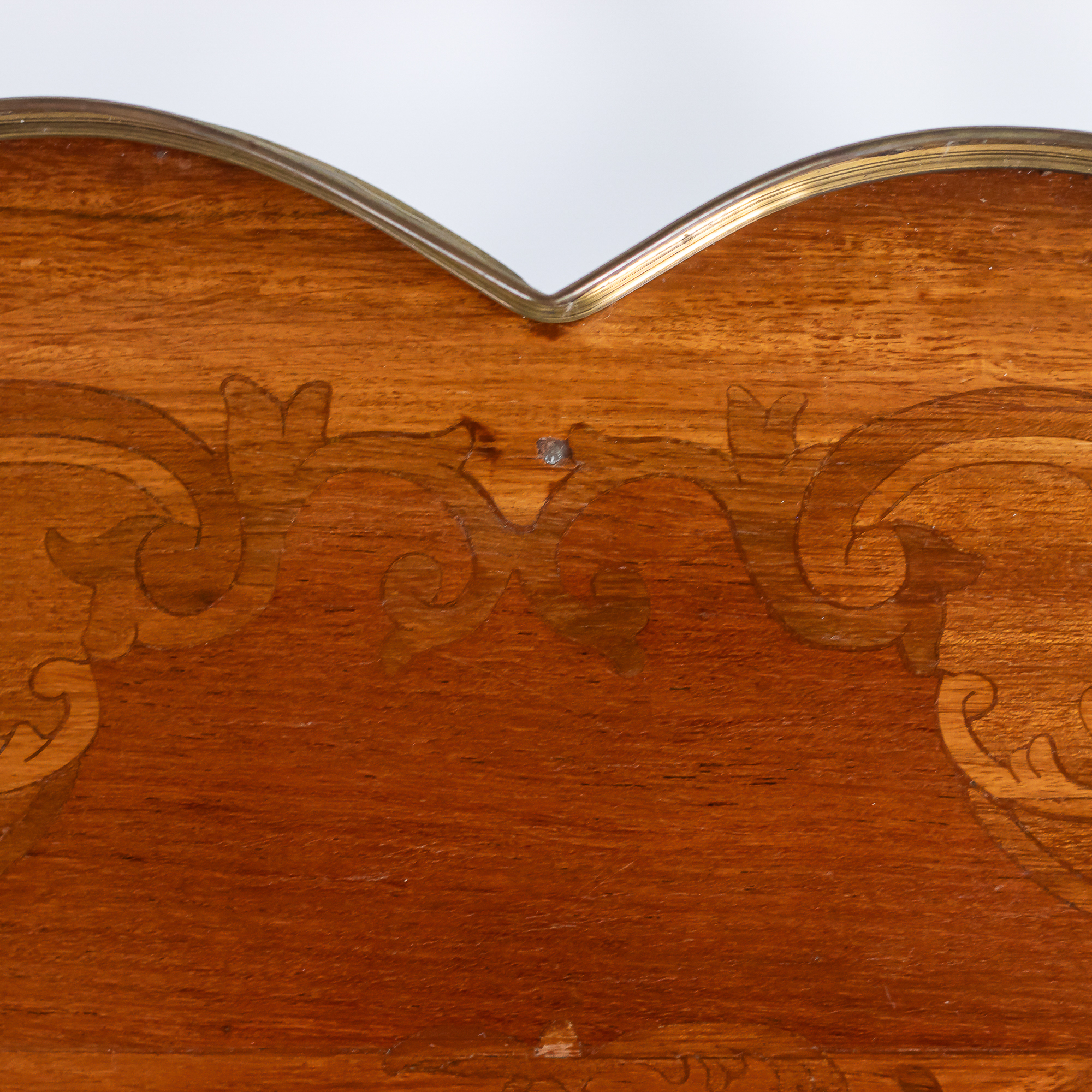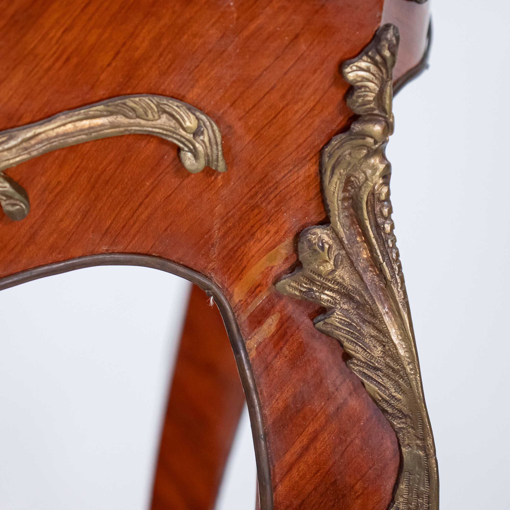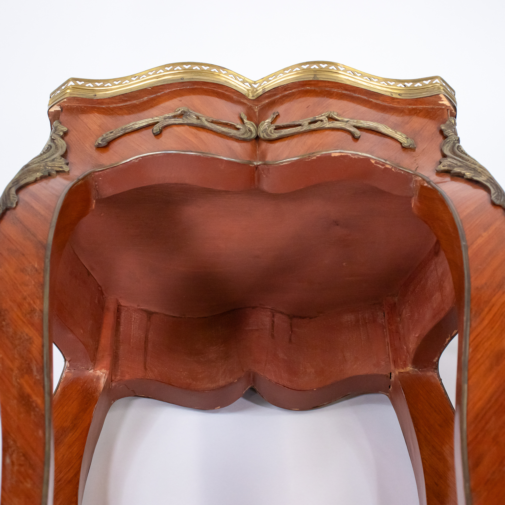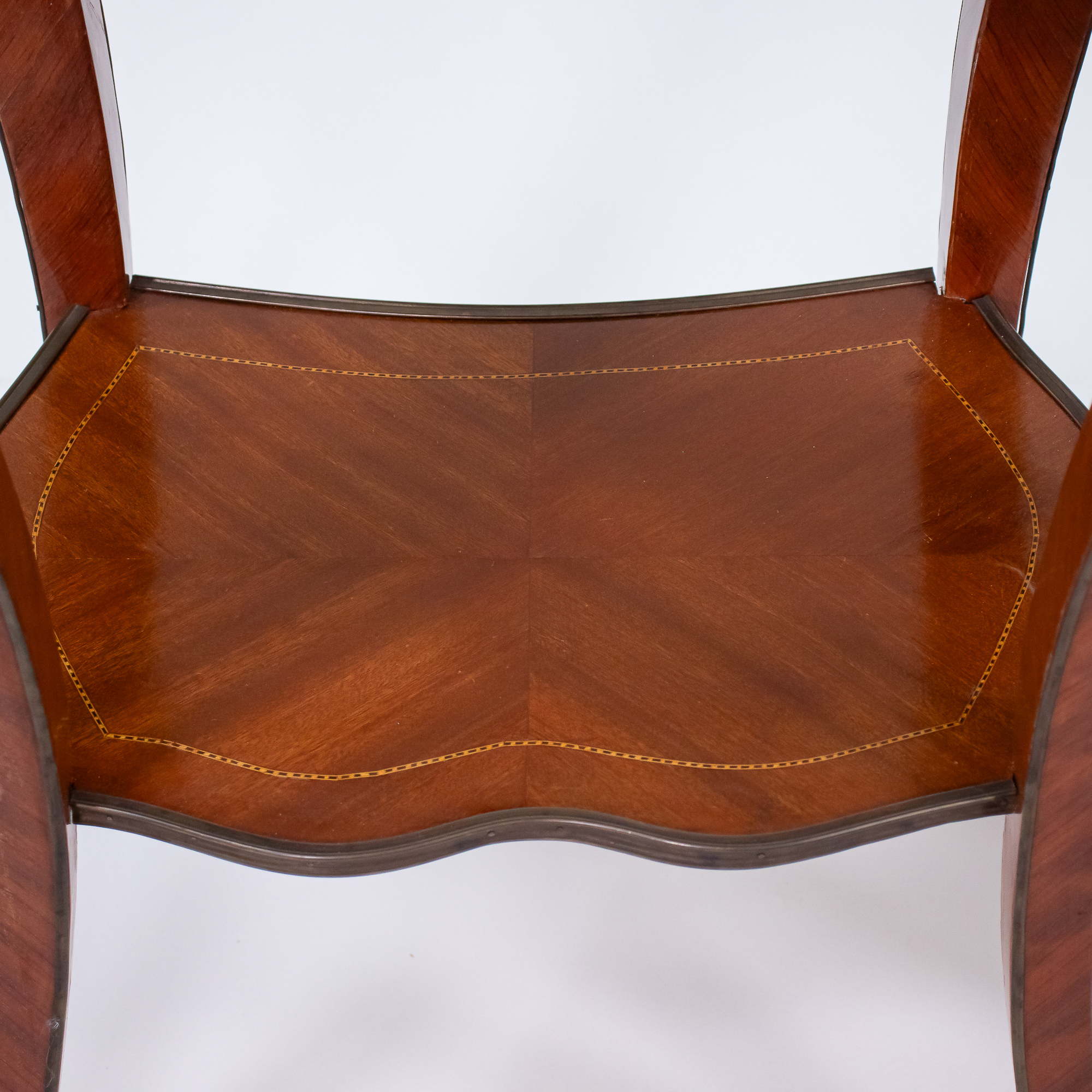 These exquisite end tables are constructed from pine with a rich mahogany veneer, showcasing the refined craftsmanship characteristic of early 20th-century French design. Each gueridon features a gracefully scalloped top adorned with intricate inlays, elegantly framed by a delicate brass gallery and bronze appliques that enhance their elegance. The tables rest on slender, curved legs that culminate in bronze sabots, exhibiting a blend of functionality and artistic appeal.