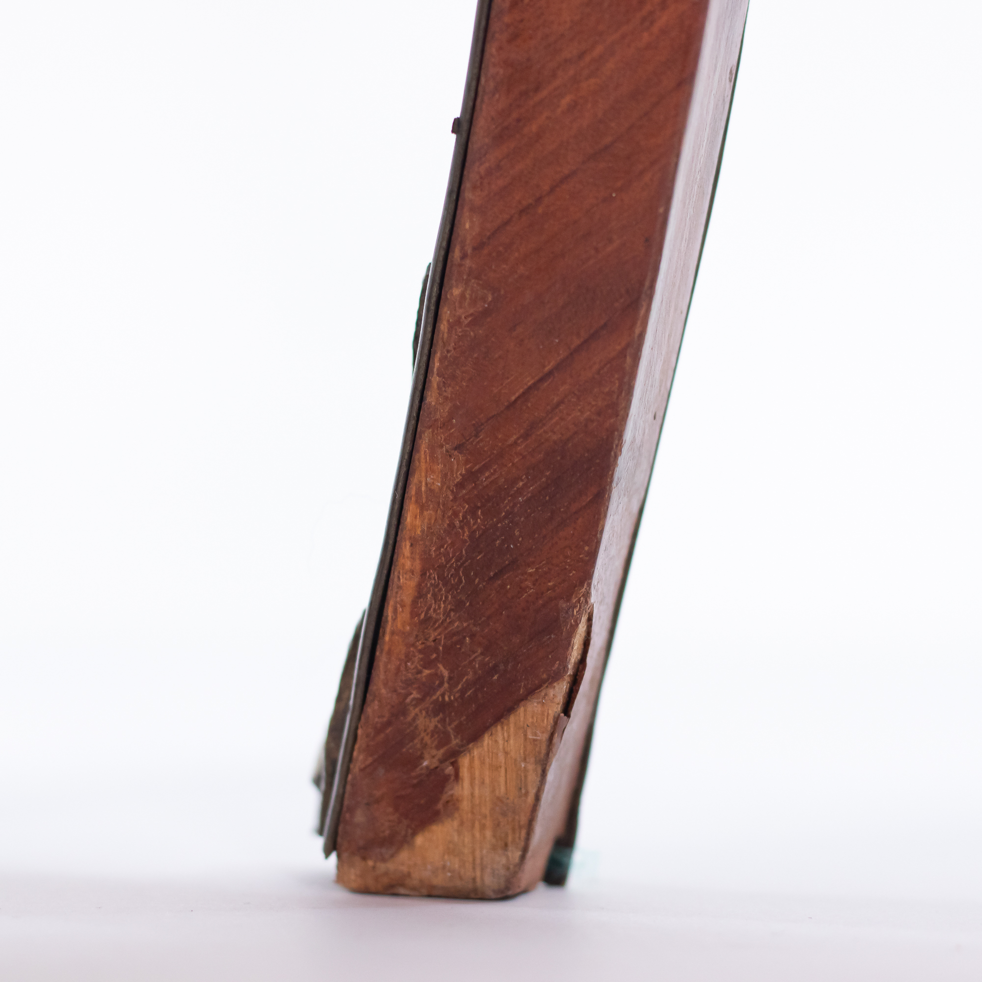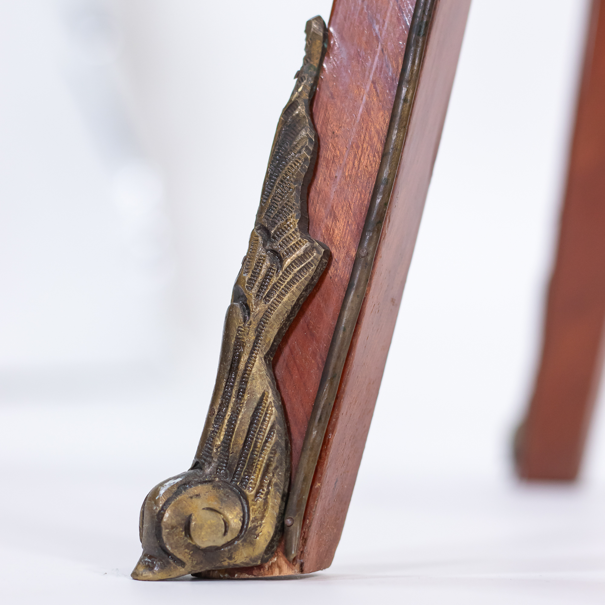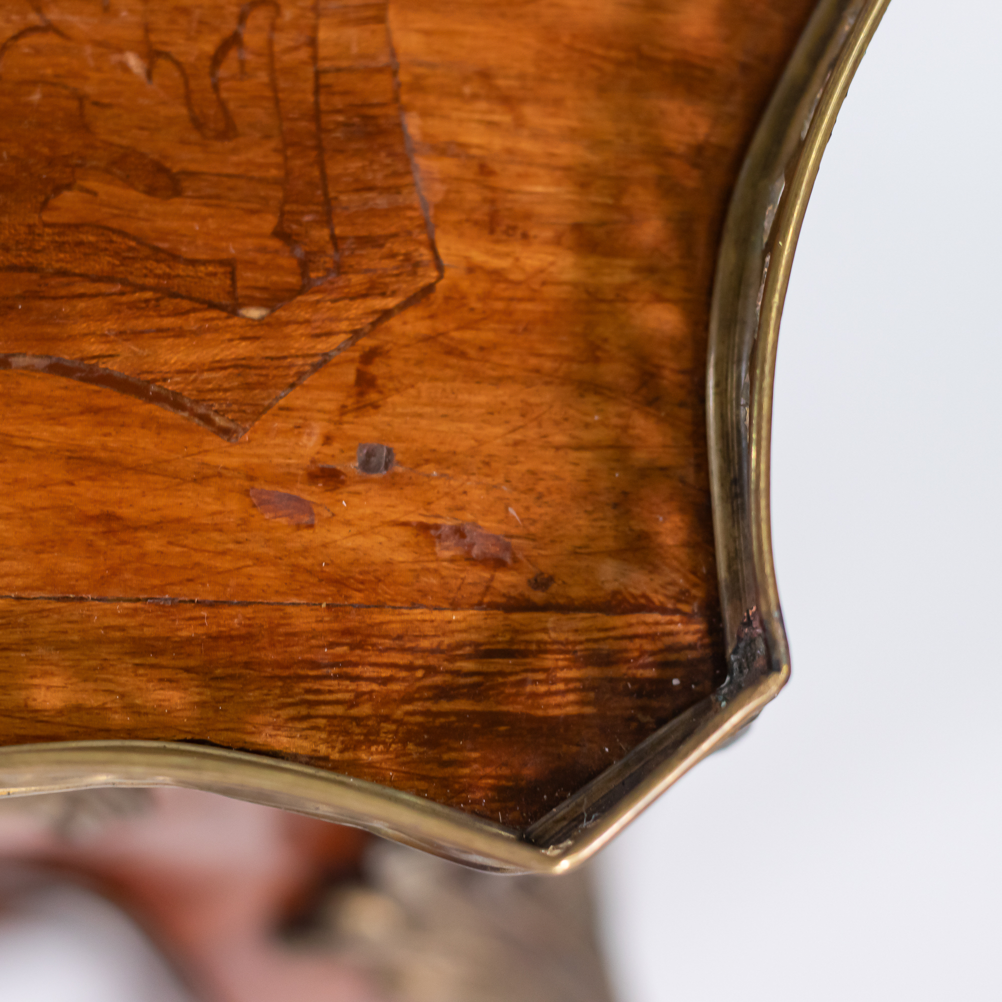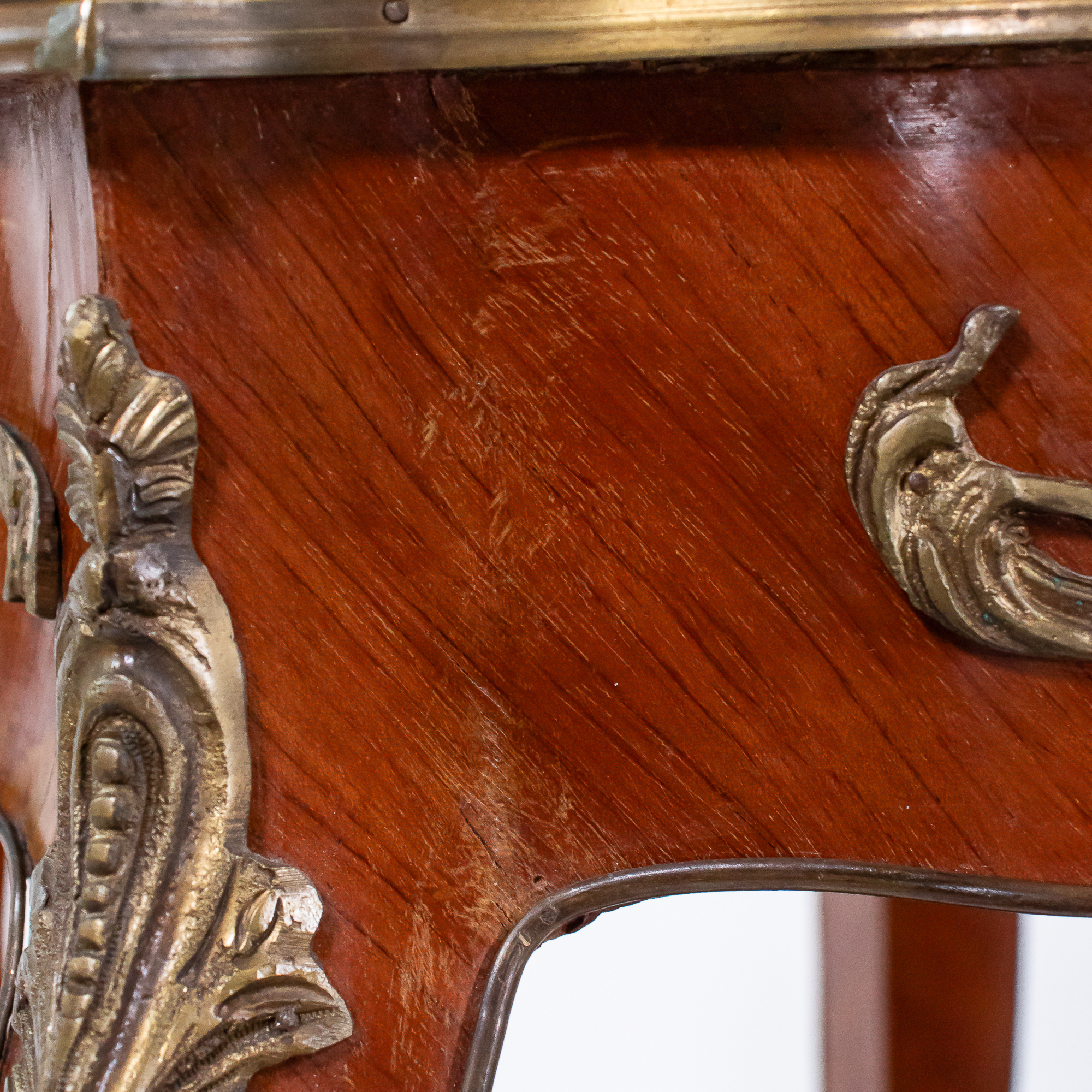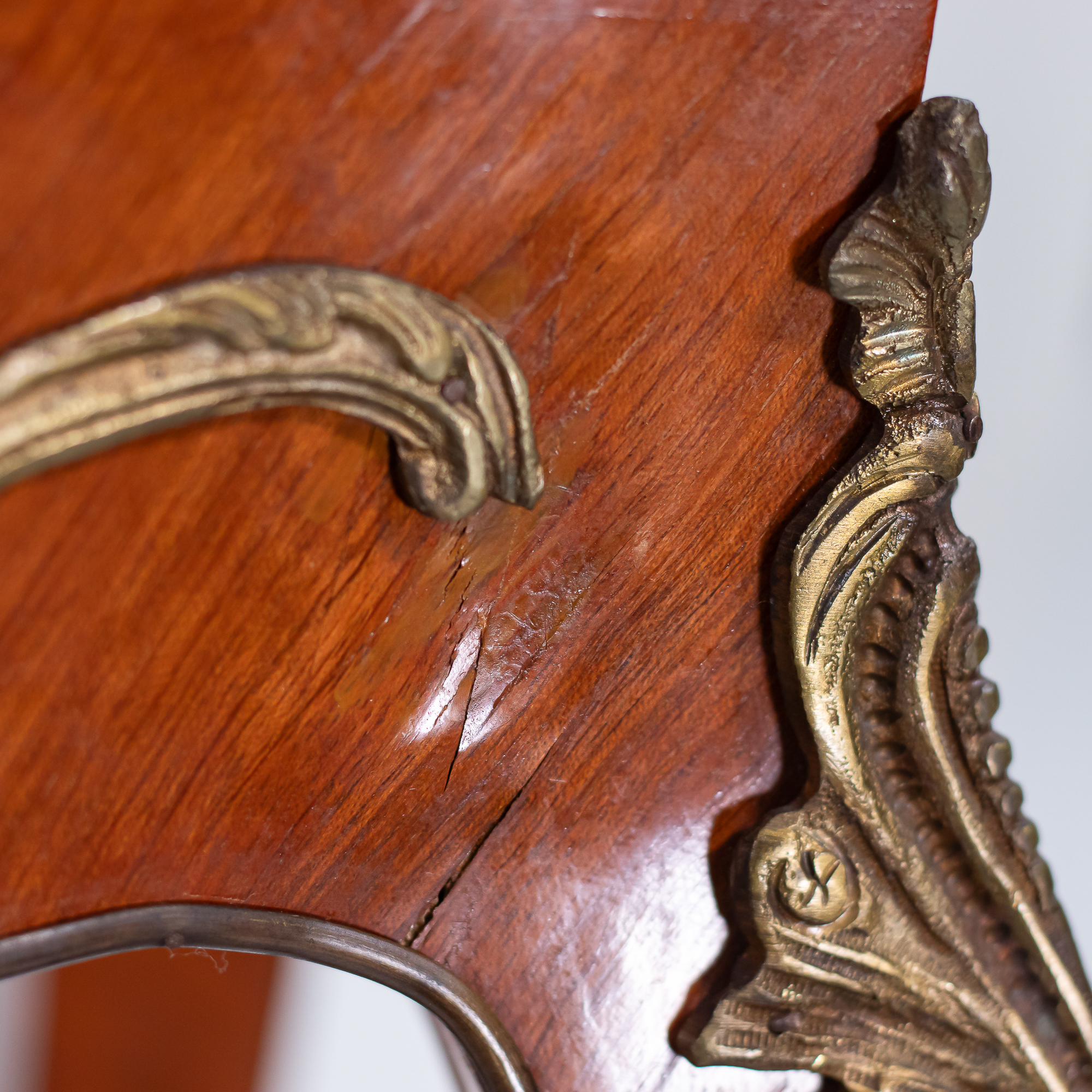 These exquisite end tables are constructed from pine with a rich mahogany veneer, showcasing the refined craftsmanship characteristic of early 20th-century French design. Each gueridon features a gracefully scalloped top adorned with intricate inlays, elegantly framed by a delicate brass gallery and bronze appliques that enhance their elegance. The tables rest on slender, curved legs that culminate in bronze sabots, exhibiting a blend of functionality and artistic appeal.