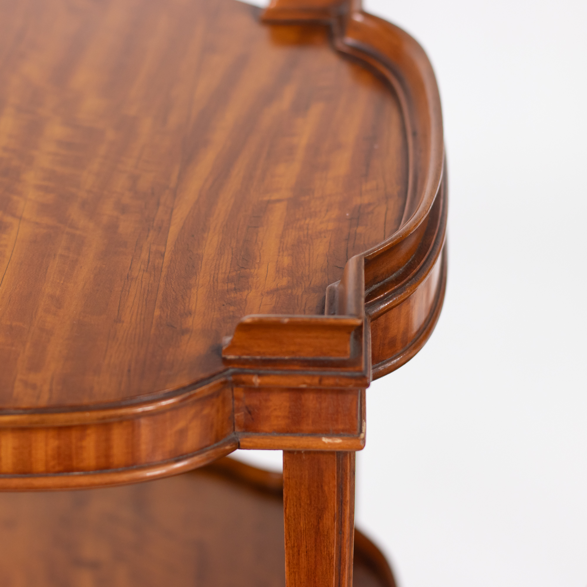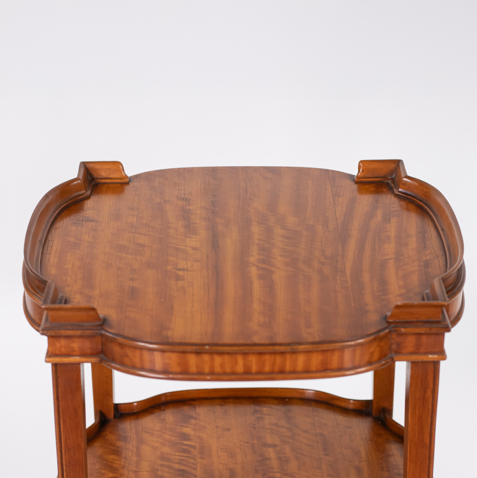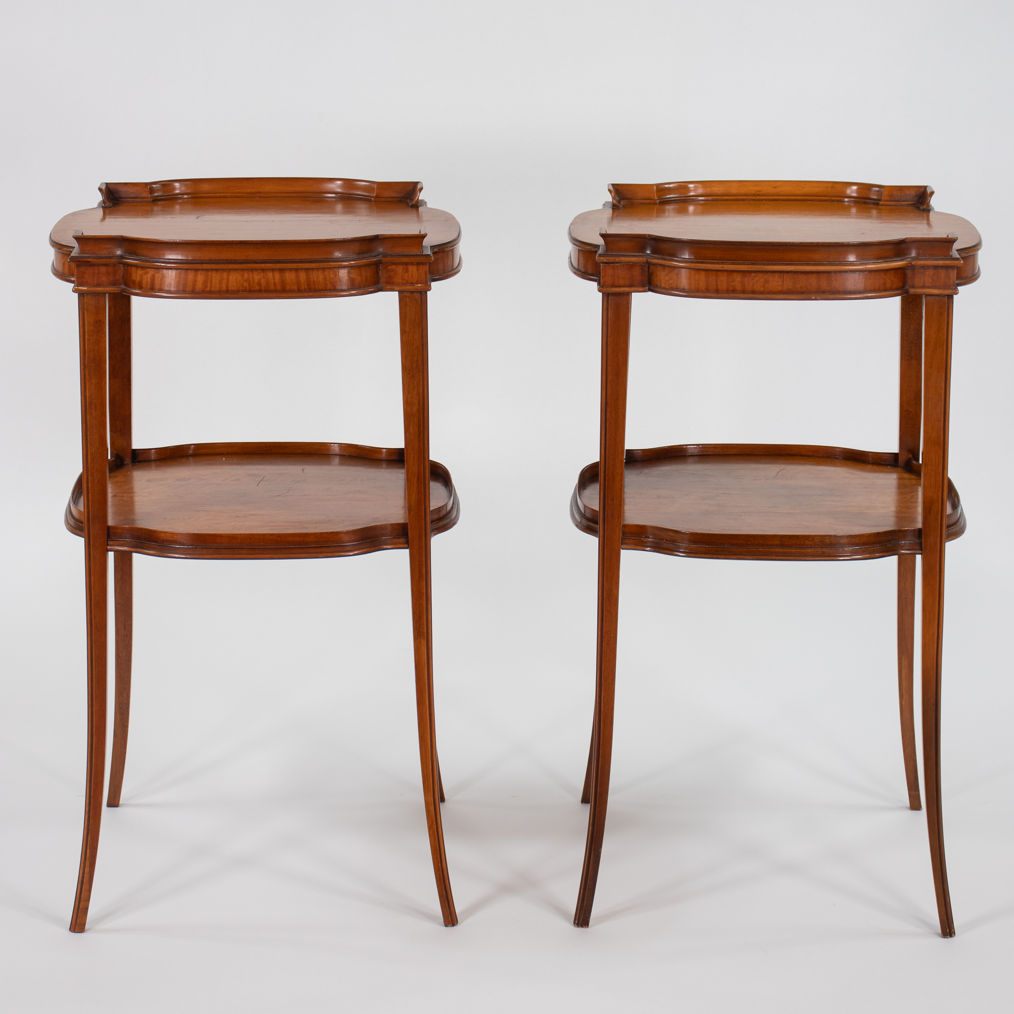 A pair of Mid-Century Italian satinwood veneered end tables, circa 1950s-1960s. Pine construction with satinwood veneer displaying prominent cathedral grain patterns. Two-tier design featuring a cartouche-shaped top and eared (crossetted) corners, with a molded edge and conforming lower shelves. Supported on elegantly tapered square-profile legs. The refined proportions and clean geometric lines exemplify Italian mid-century modern design principles of the period.