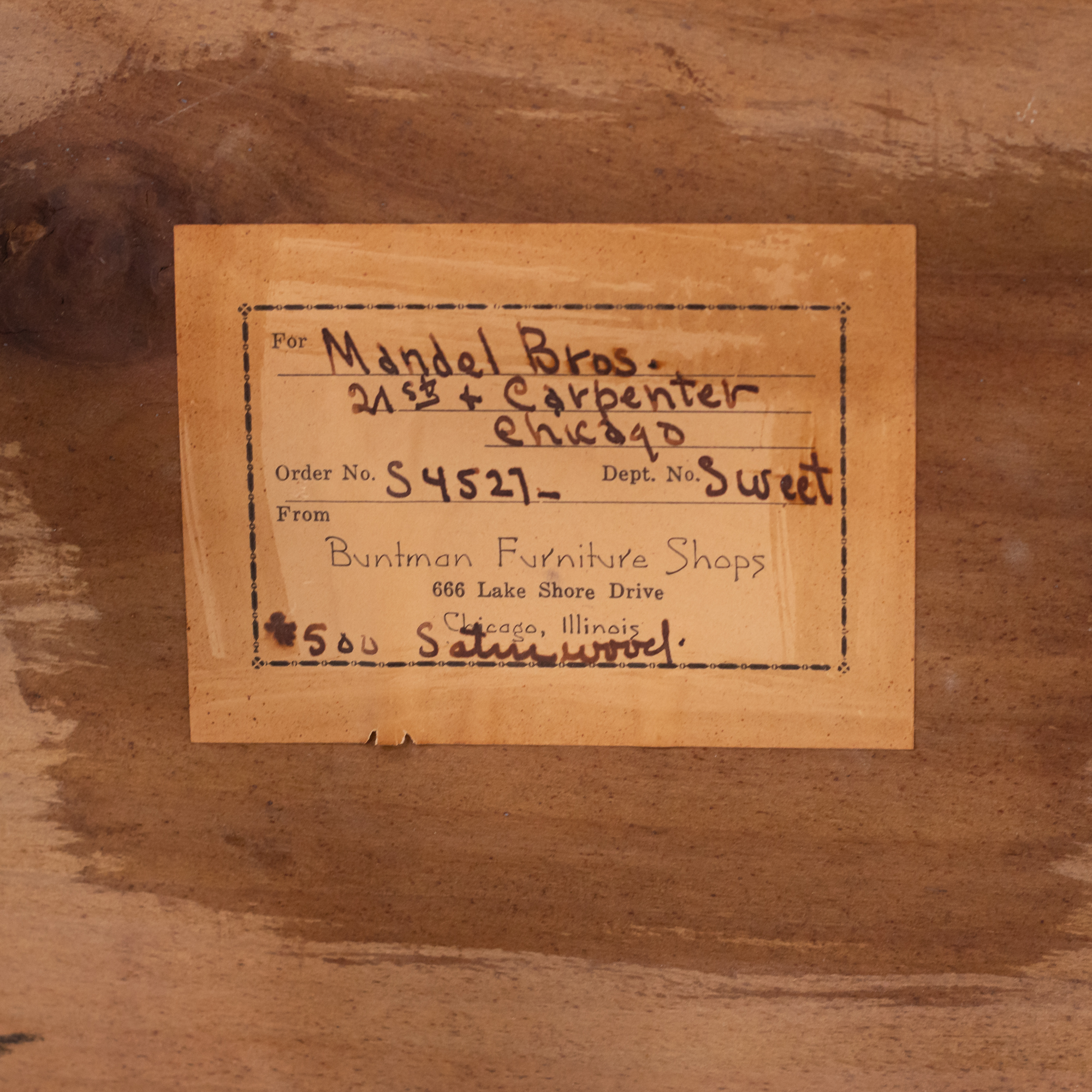 These tables bear original retailer labels from two of Chicago’s most prestigious furniture establishments: Mandel Brothers and Buntman Furniture Shop, both located at the renowned Chicago Furniture Mart at 666 Lake Shore Drive. Mandel Brothers, founded in 1855, was one of Chicago’s premier department stores and a leading importer of fine European furnishings until 1960. Known for their discerning eye and commitment to quality, Mandel Brothers specialized in bringing the finest European craftsmanship to sophisticated American homes. The Chicago Furniture Mart served as the epicenter of Midwest furniture retail, attracting the region’s most affluent clientele.
