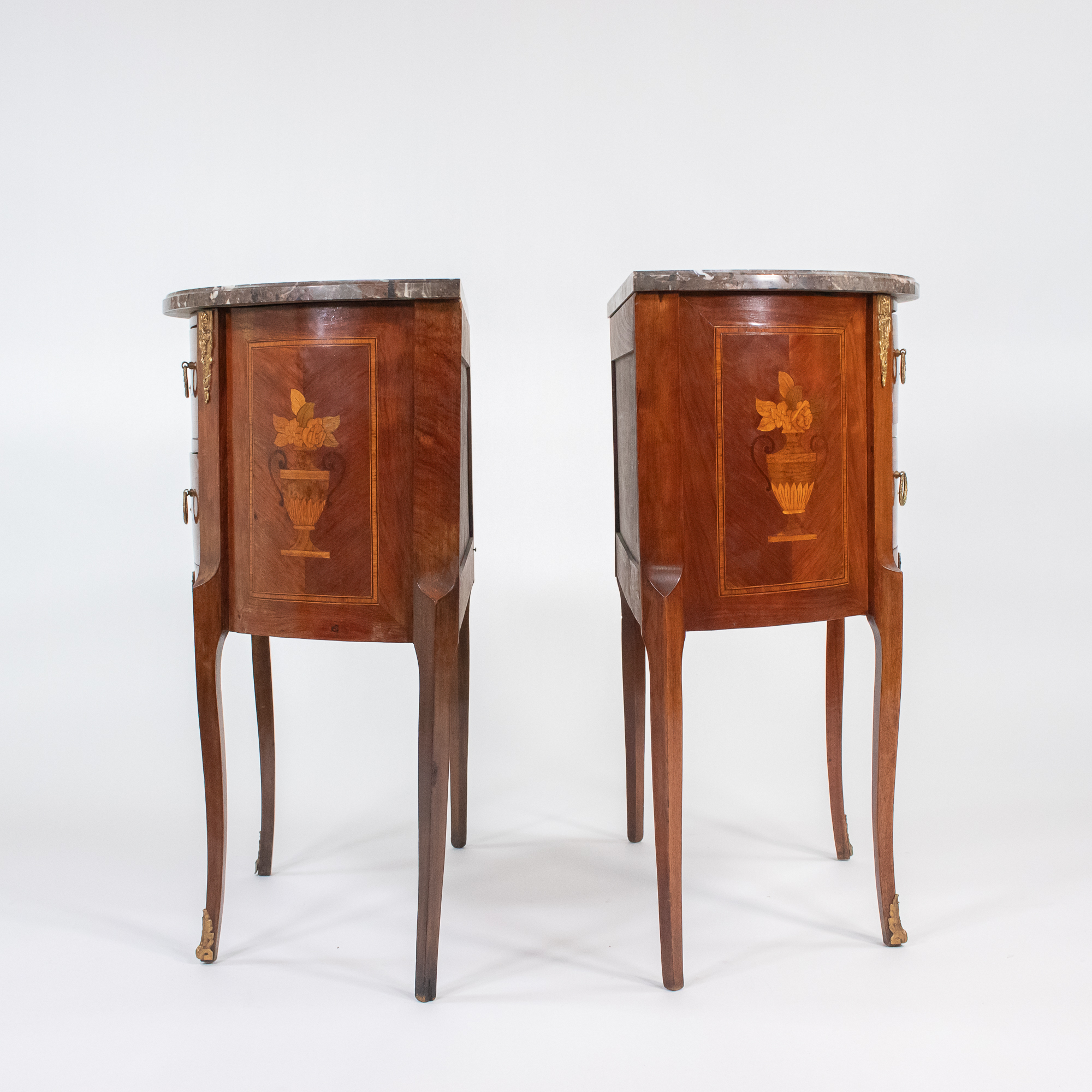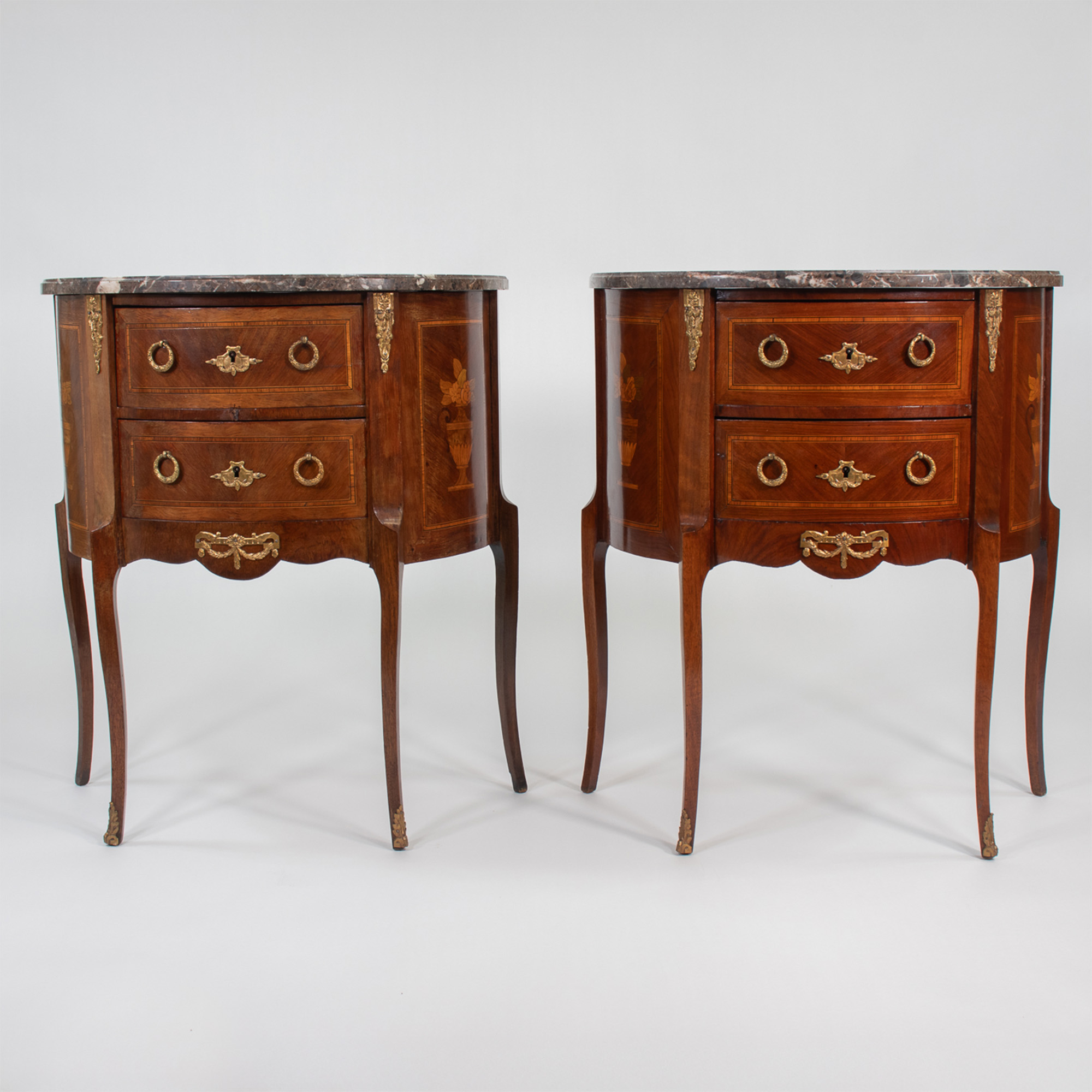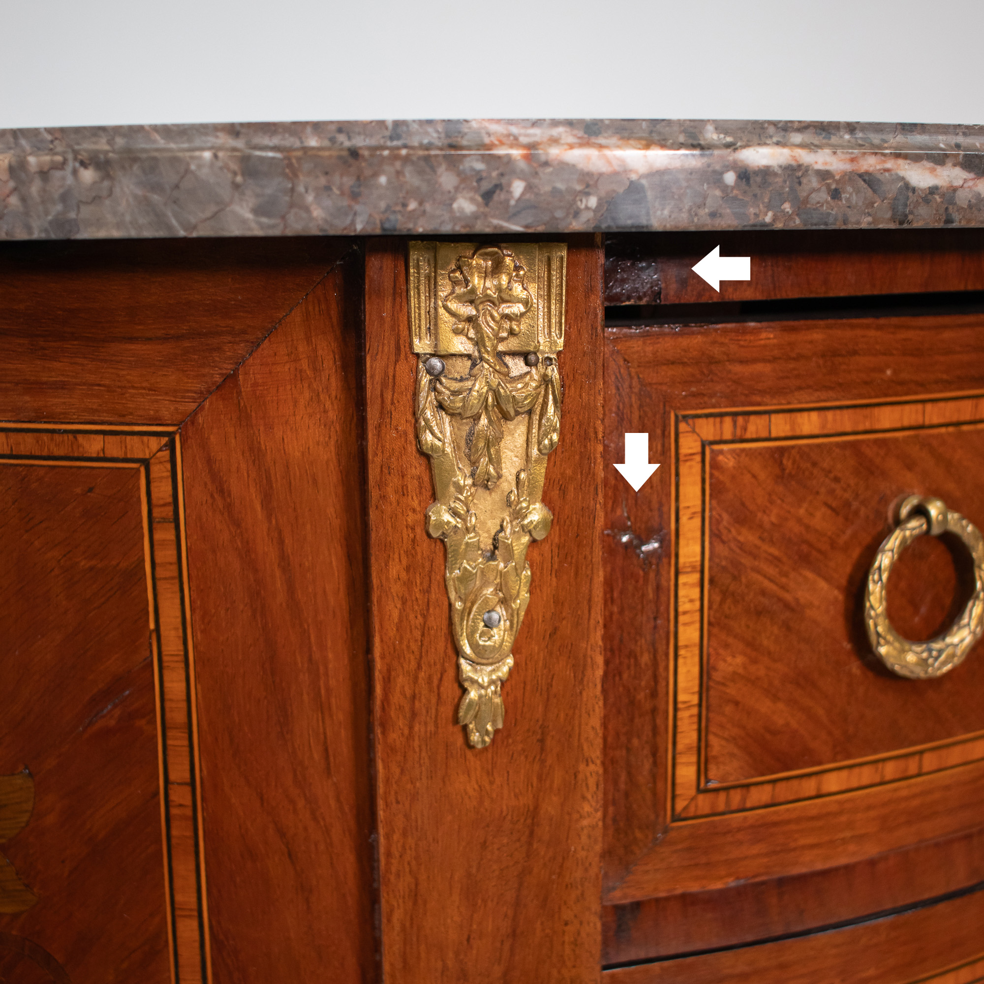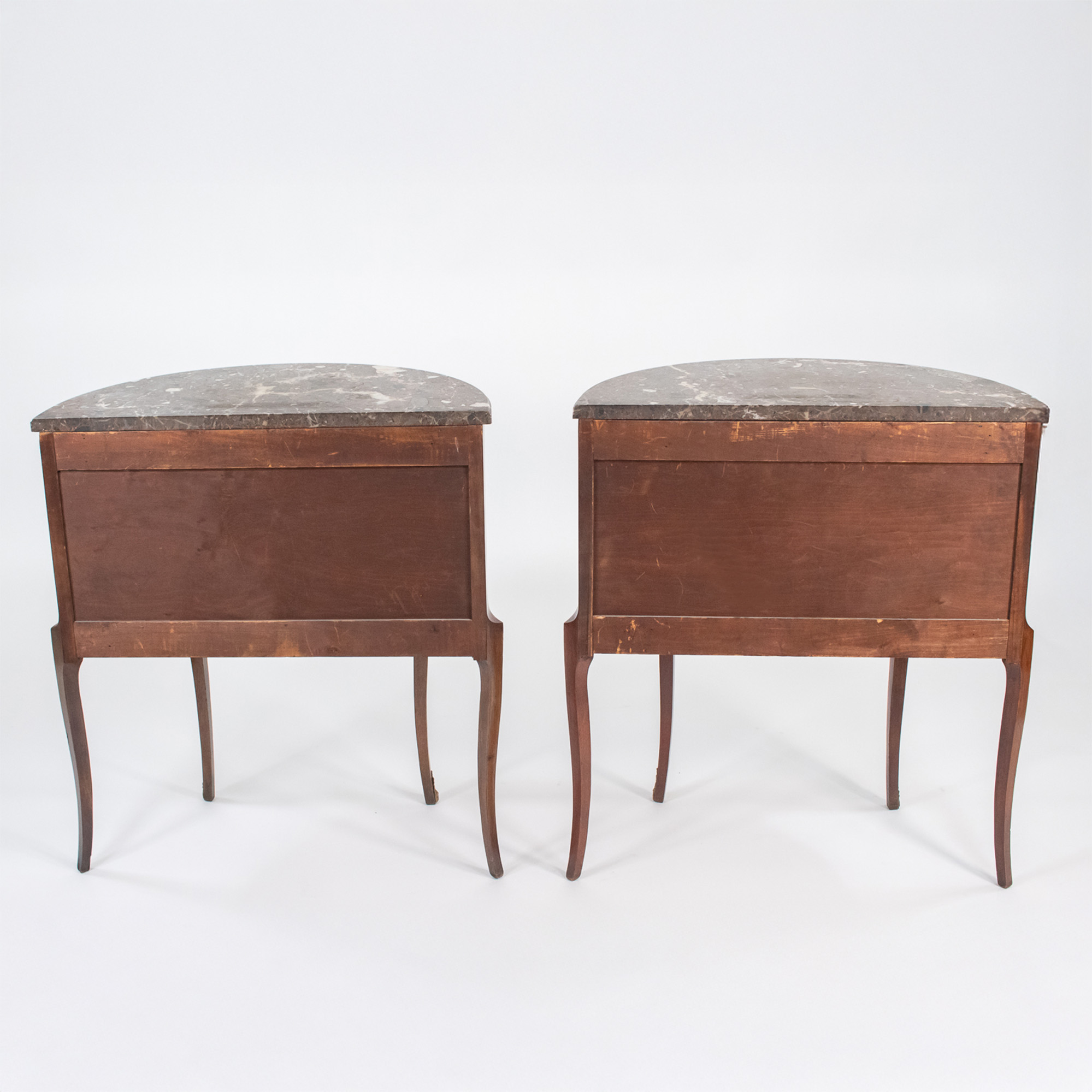 The gray marble tops show attractive white veining and retain good polish. Bronze mounts are cast rather than stamped, indicating quality construction. Drawers are fitted with period-appropriate brass hardware.