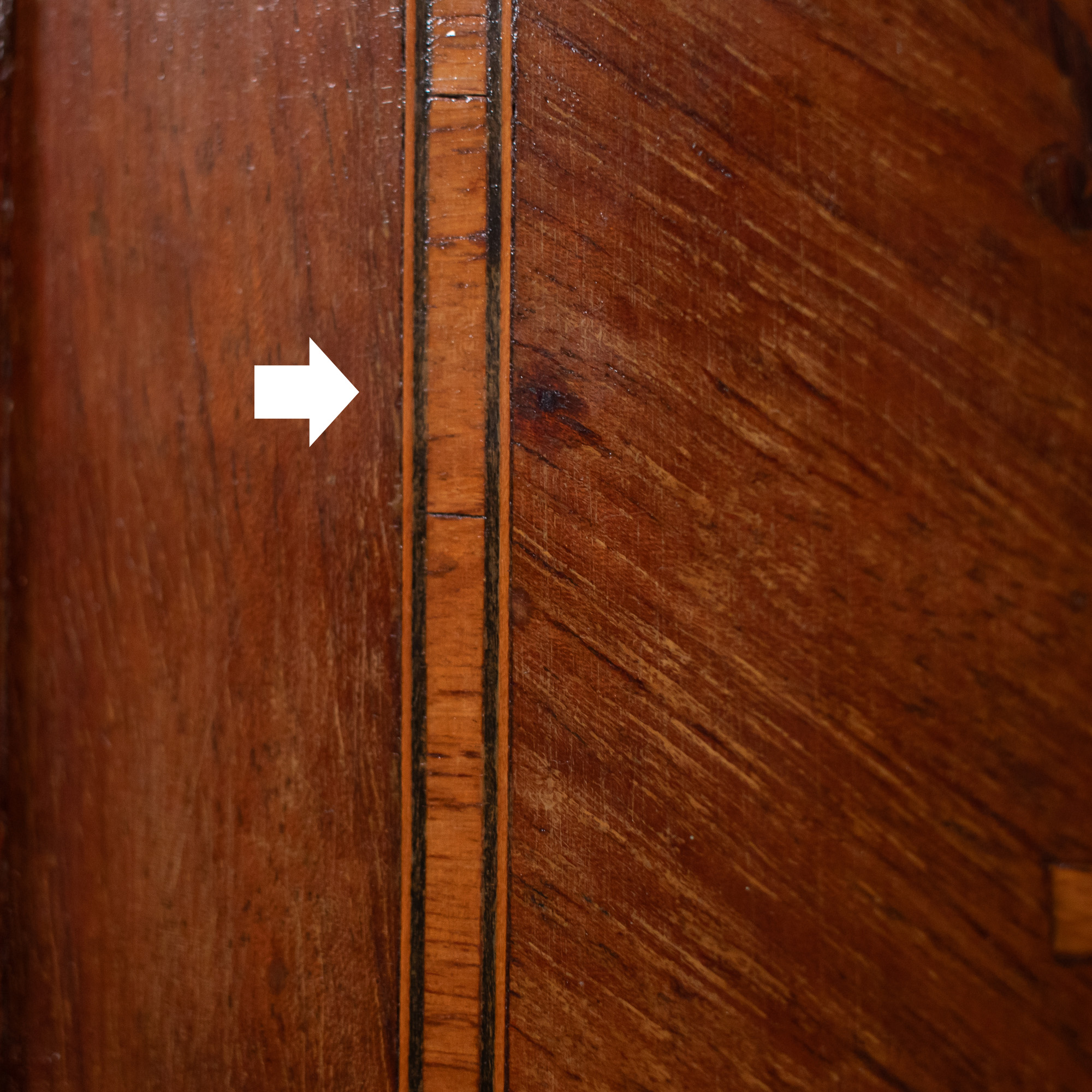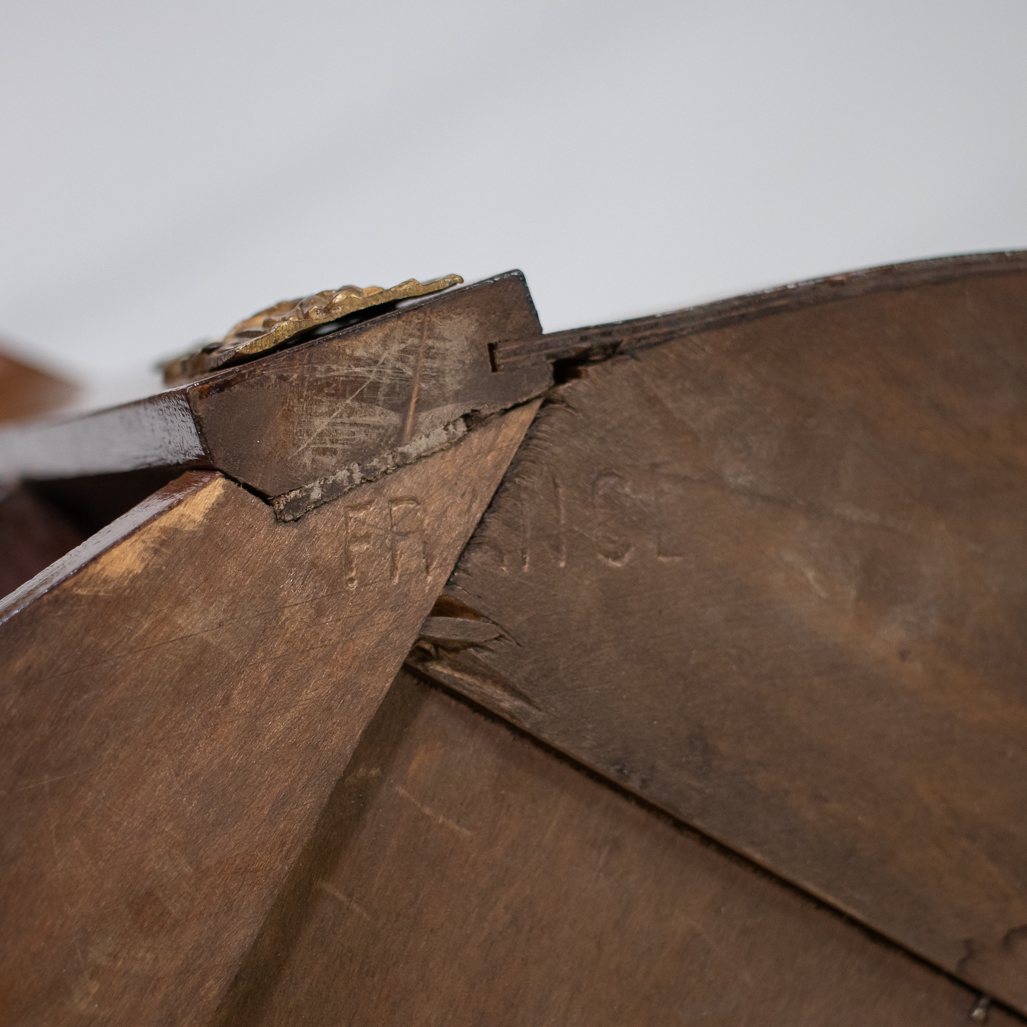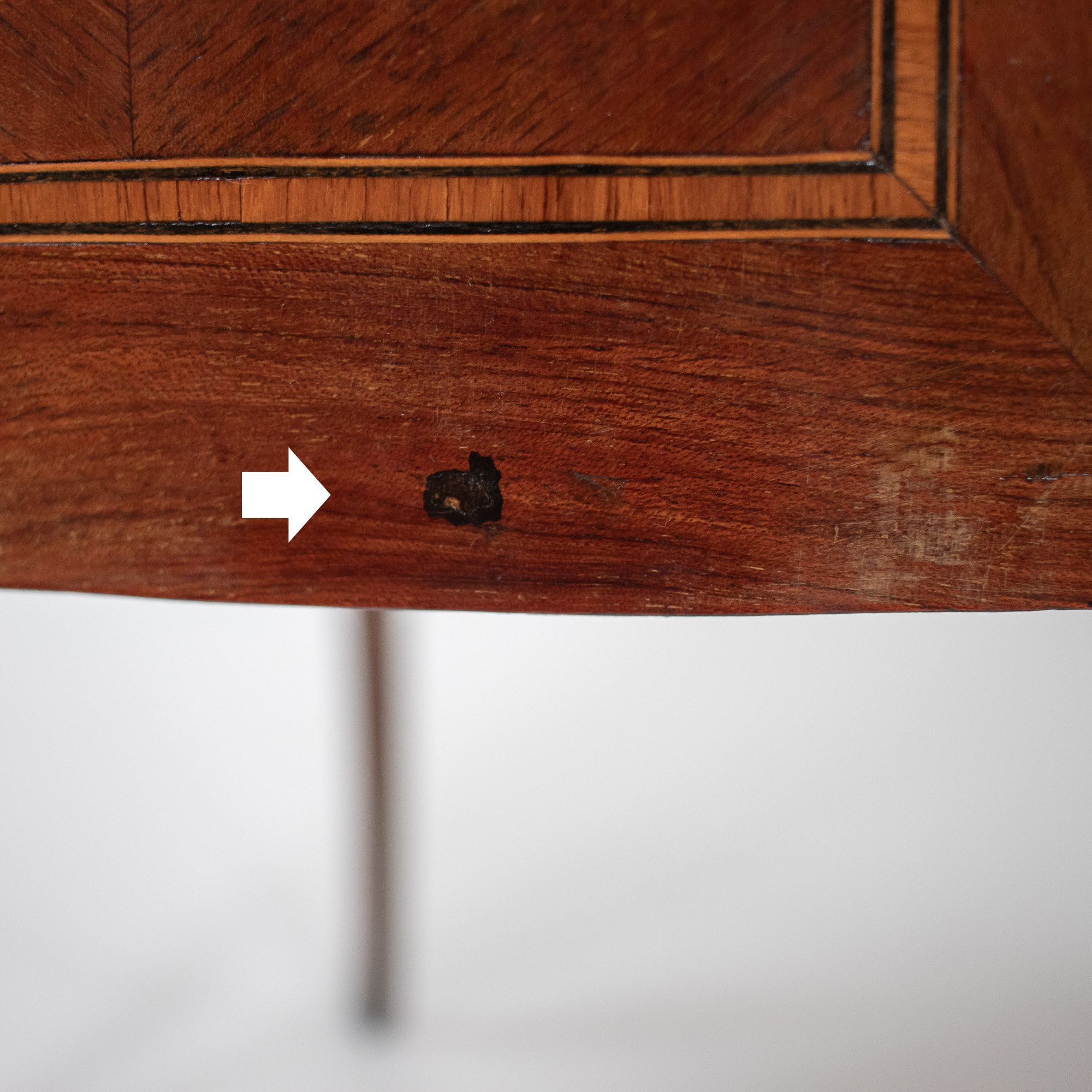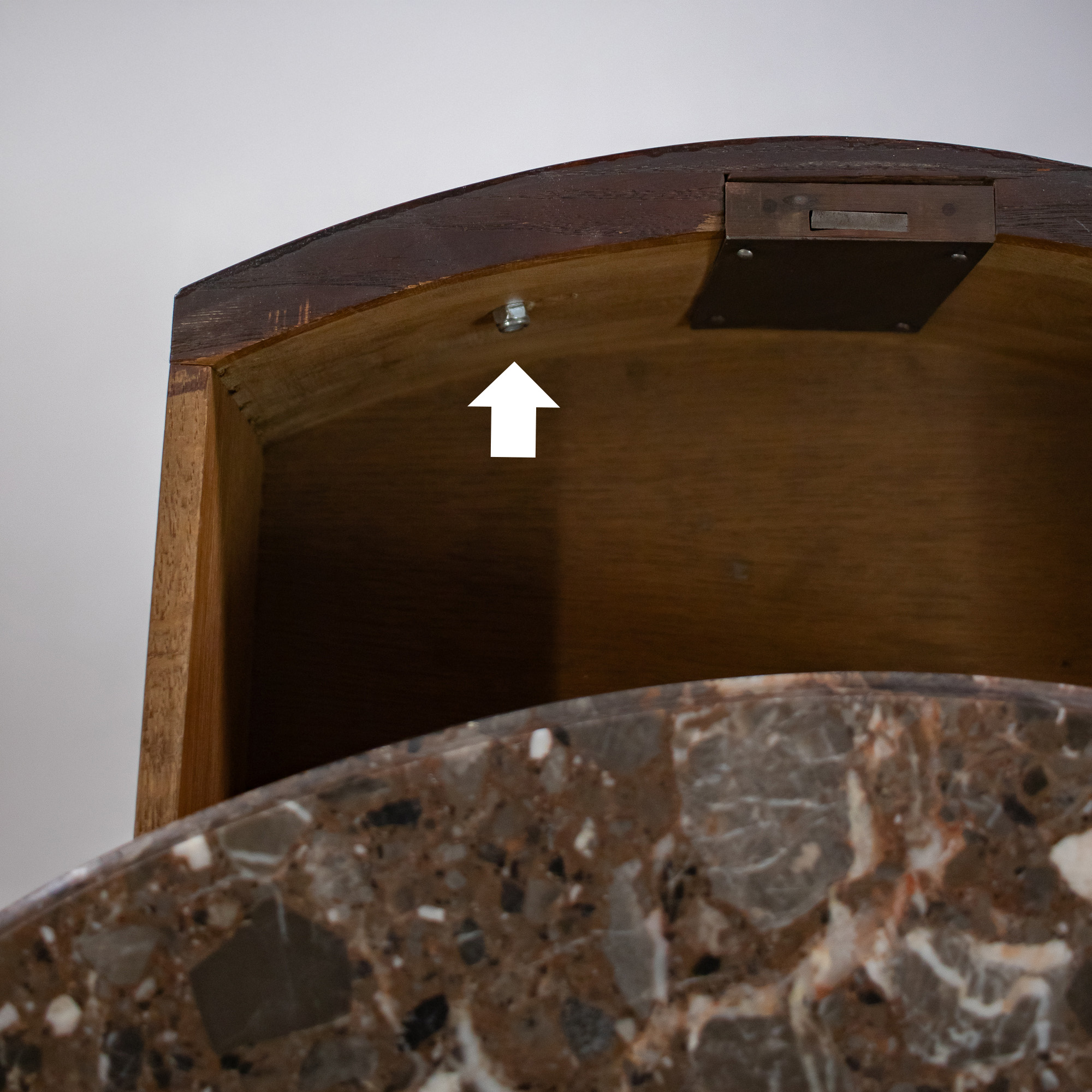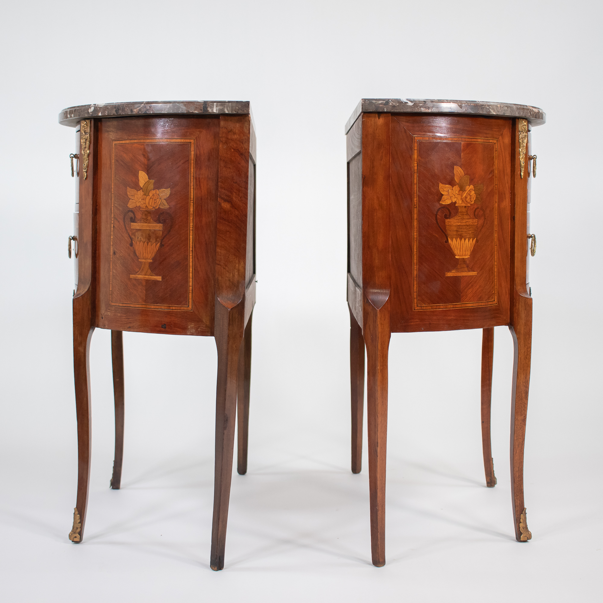 The gray marble tops show attractive white veining and retain good polish. Bronze mounts are cast rather than stamped, indicating quality construction. Drawers are fitted with period-appropriate brass hardware.