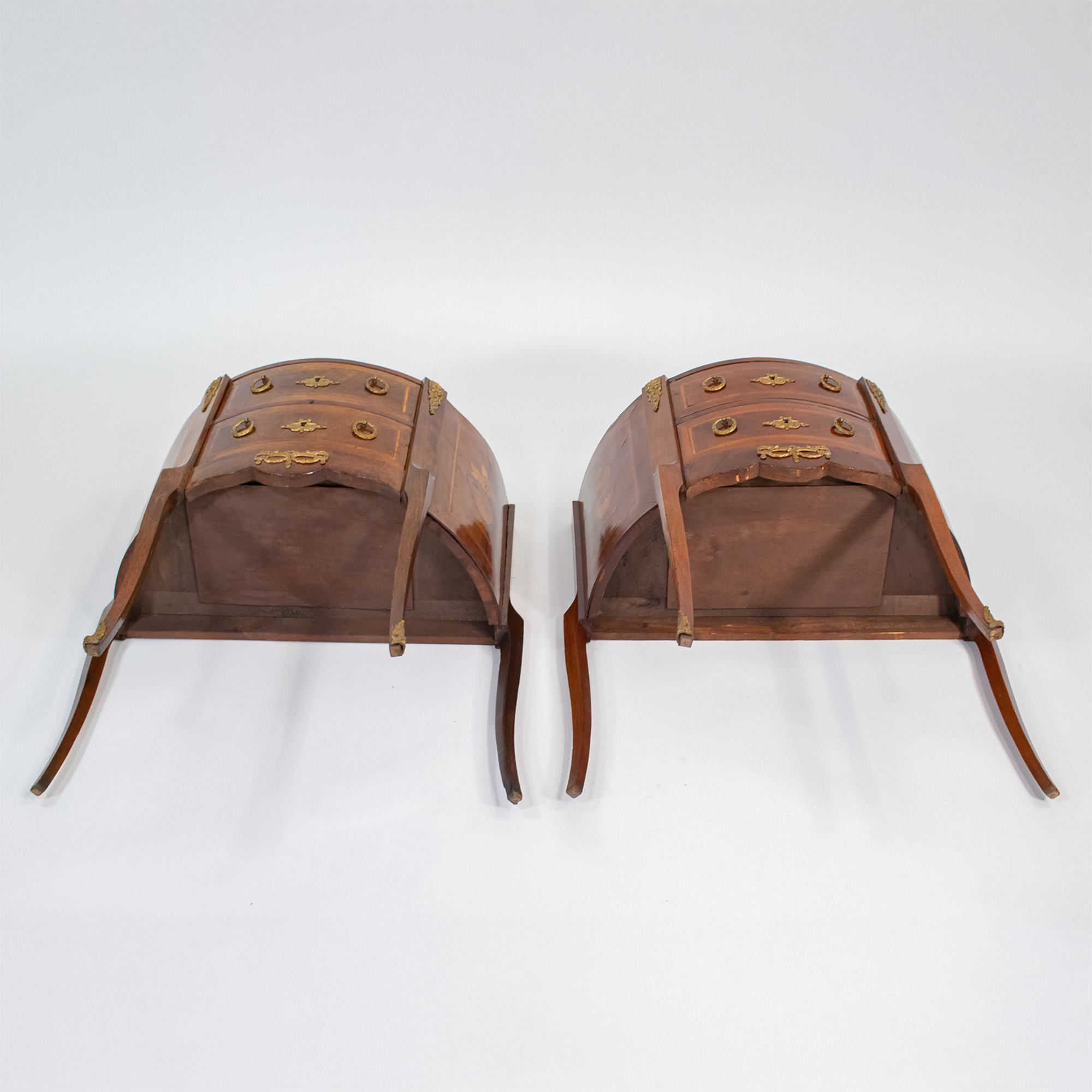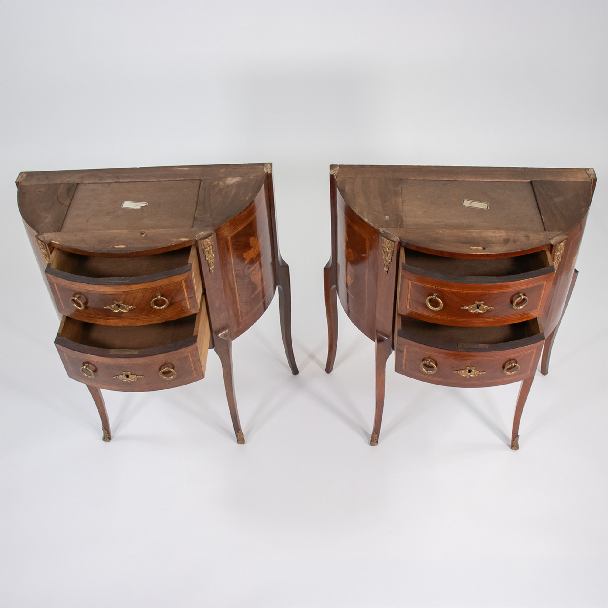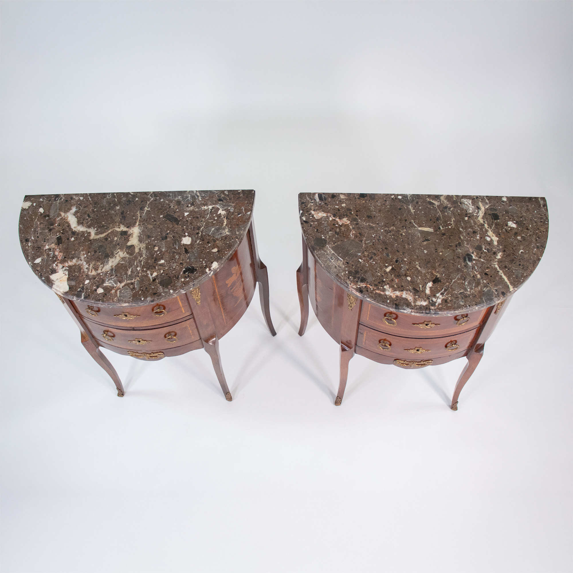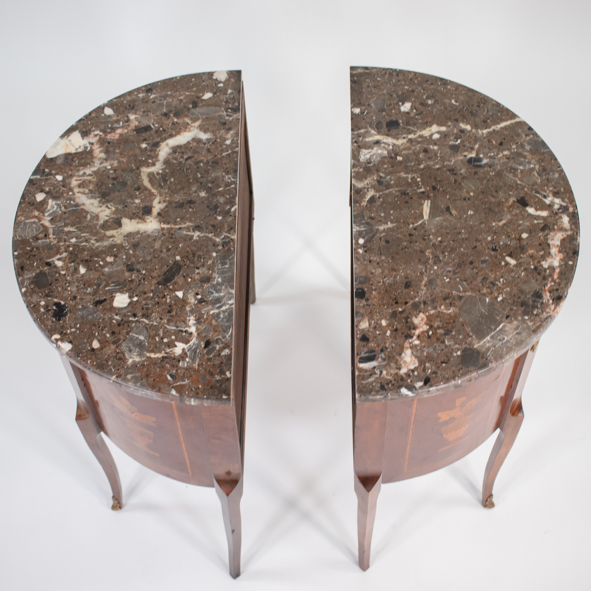 Pair of elegant demilune console tables in the Louis XVI manner, each featuring a shaped marble top over a conforming case with two drawers. The mahogany-veneered oak frame features a mahogany veneer of fine marquetry inlay and cast gilt bronze mounts and hardware that include circular ring pulls and decorative foliate mounts. Raised on gracefully curved saber legs terminating in bronze sabots.
