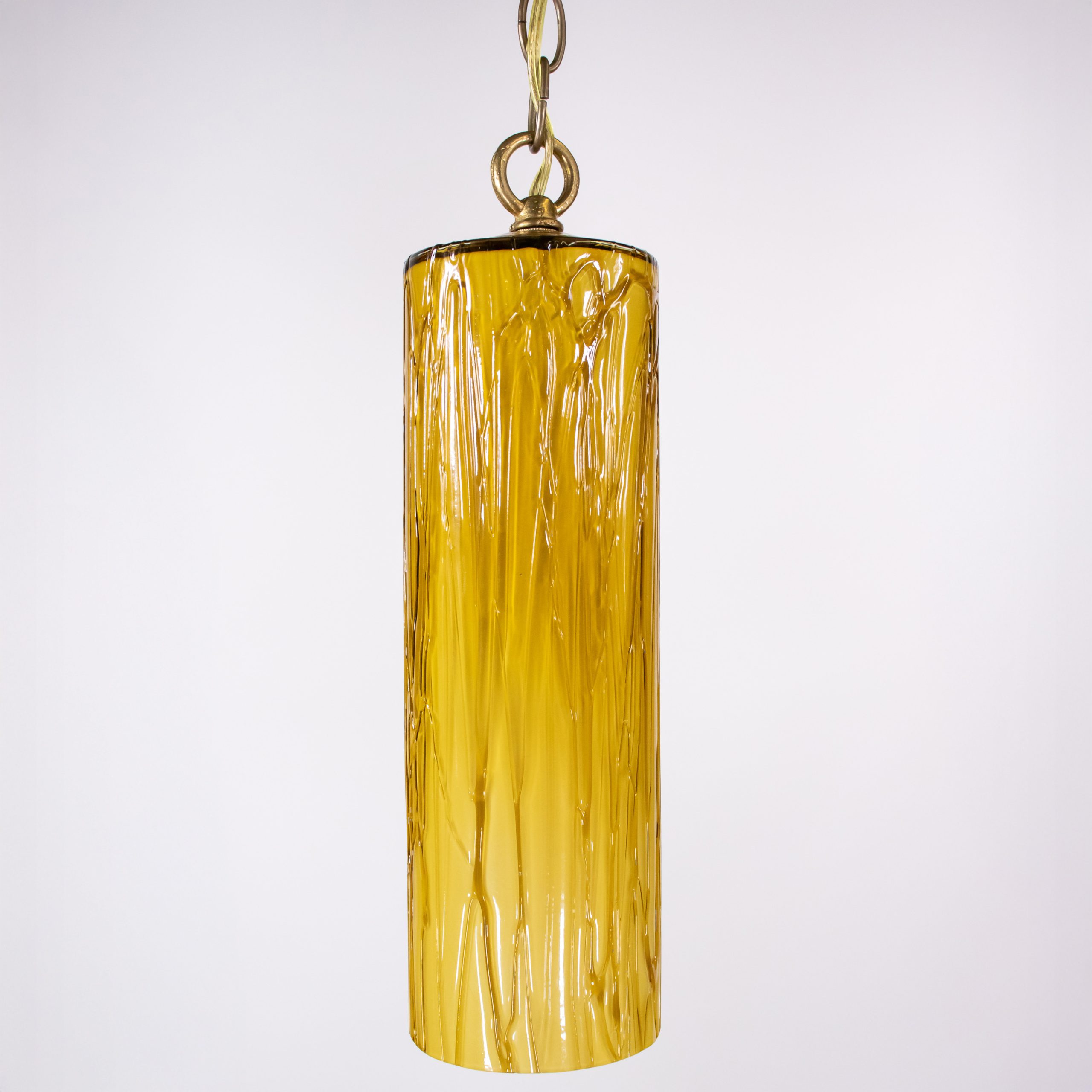 The elongated cylindrical forms are distinguished by an organic, dripped surface that gives them a sculptural, almost molten appearance, with subtle variations from piece to piece that underscore their artisan, handblown origin. When illuminated, the combination of amber outer layer and white interior amplifies the warm tone of the glass, casting an inviting, atmospheric light that is especially flattering in dining, bar, and living spaces.