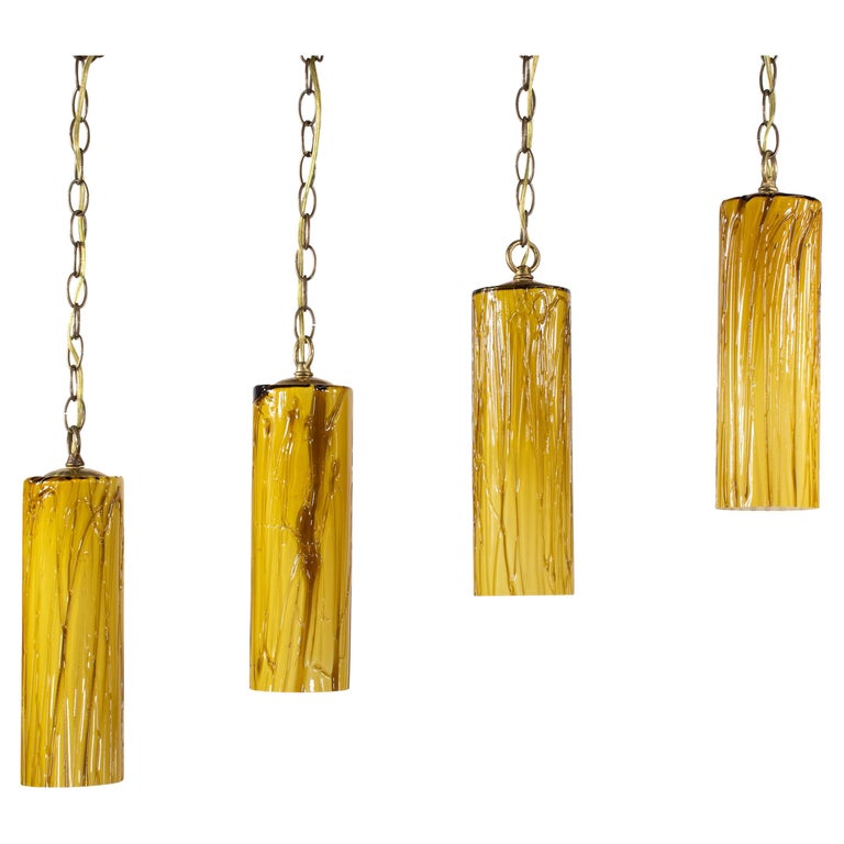 Set of four mid-century Murano tubular pendant lights in richly layered amber and white “incamiciato” glass, inspired by the celebrated mid-century designs of Carlo Nason, the renowned Italian glass designer known for his innovative work with cased glass and sculptural forms. Each shade is handblown using the traditional incamiciato (cased) technique, in which a core of white opal glass (lattimo) is encased in a sheath of amber-toned glass. This layered construction creates a beautiful visual depth: the exterior reads as a warm, honeyed amber with darker caramel accents, while the white interior reflects and softens the light, producing an even, diffused glow rather than glare.