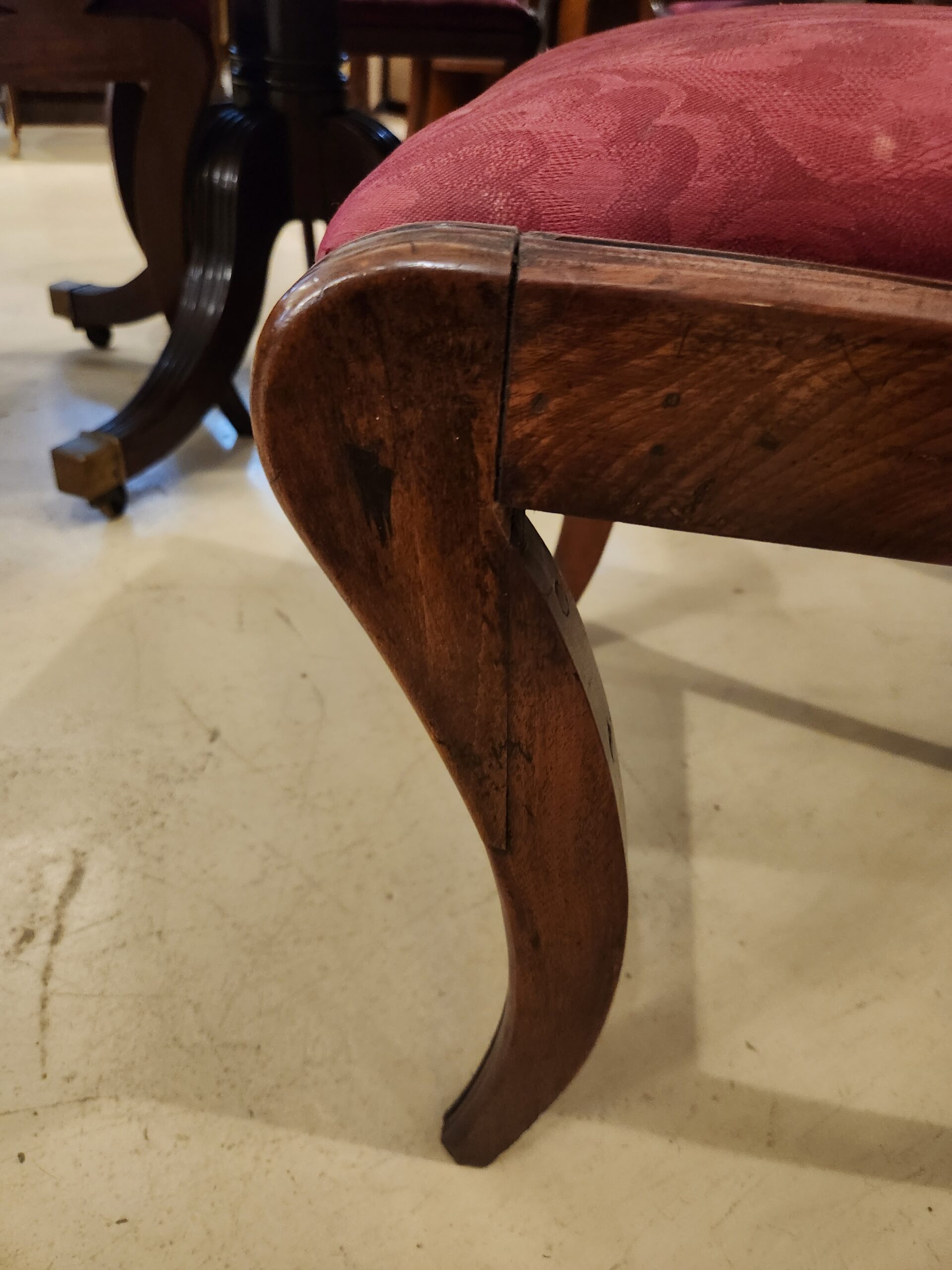 Set of 6 Circa 1810 Regency Period Mahogany Chairs. This entirely hand-carved set consists of two armchairs and four side chairs. The top crest rails flair out into rondels while the center rails have the rondels in the center. All the chairs have elegantly carved saber legs. Both armchairs have carved scroll arms. Sparing no detail, this set of chairs has close reeding on the top of the rails and the top of the arms. The removable slip seats have a nice padded red upholstery.