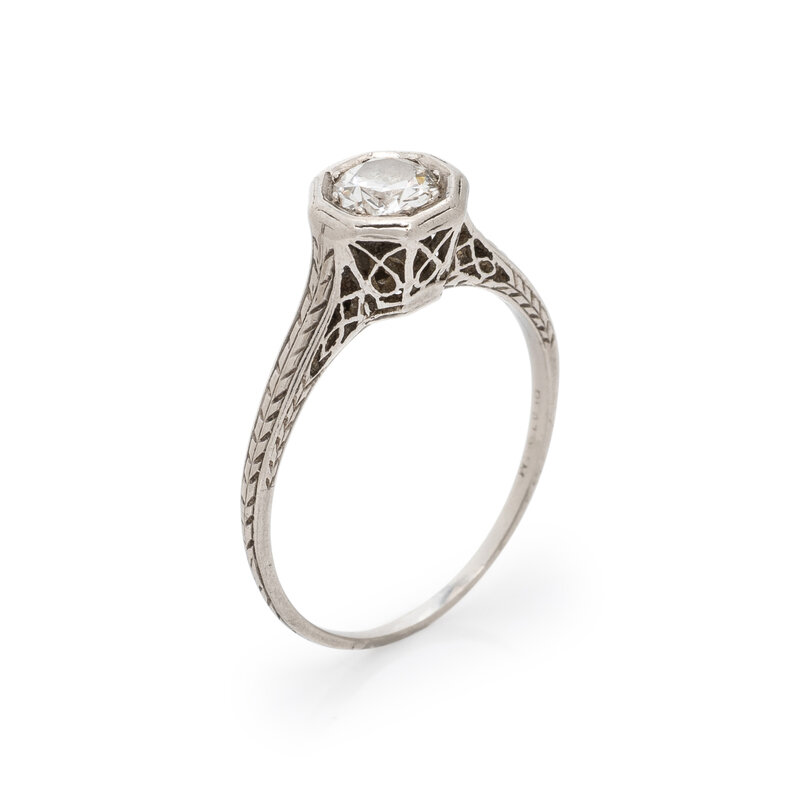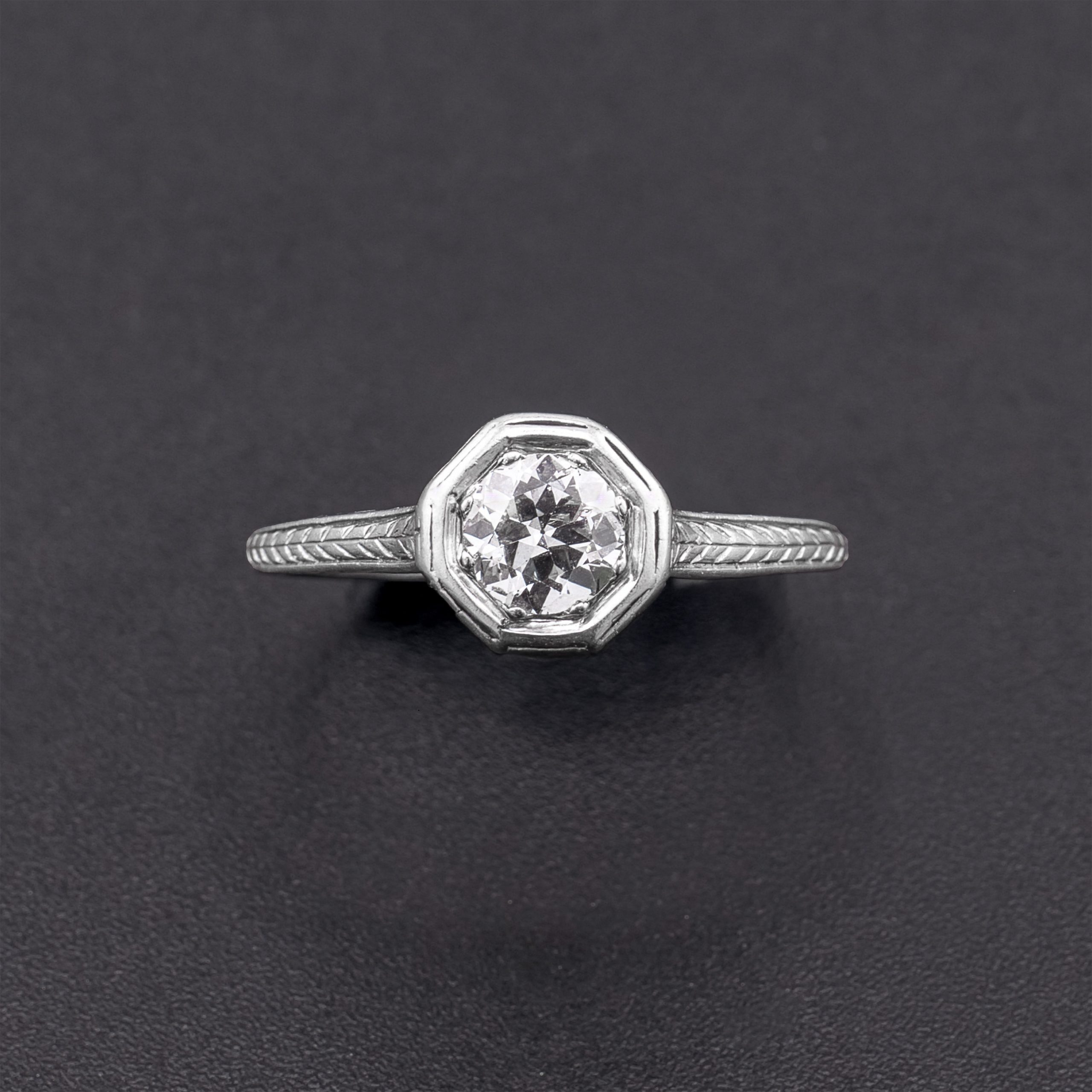 This vintage platinum ring dates to the 1950s. It features an Art Deco–inspired octagonal bezel, while the hand-pierced gallery and subtle milgrain detailing highlight the fine workmanship.