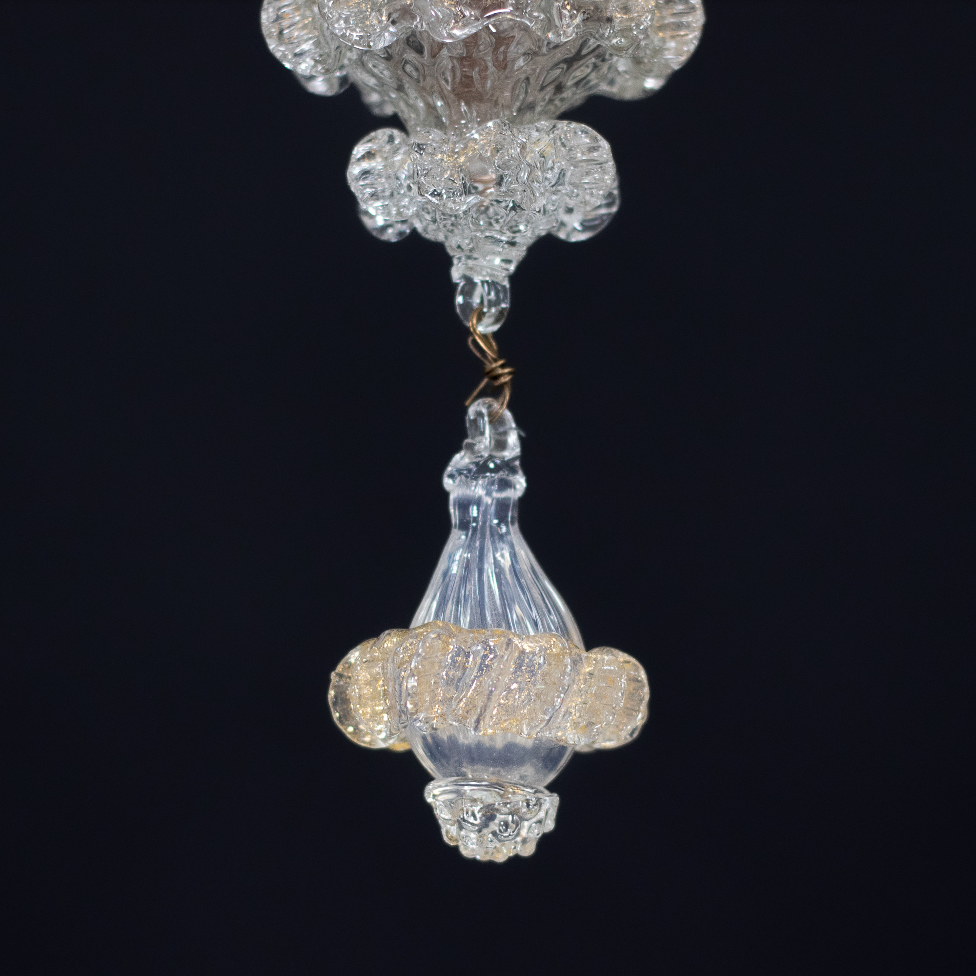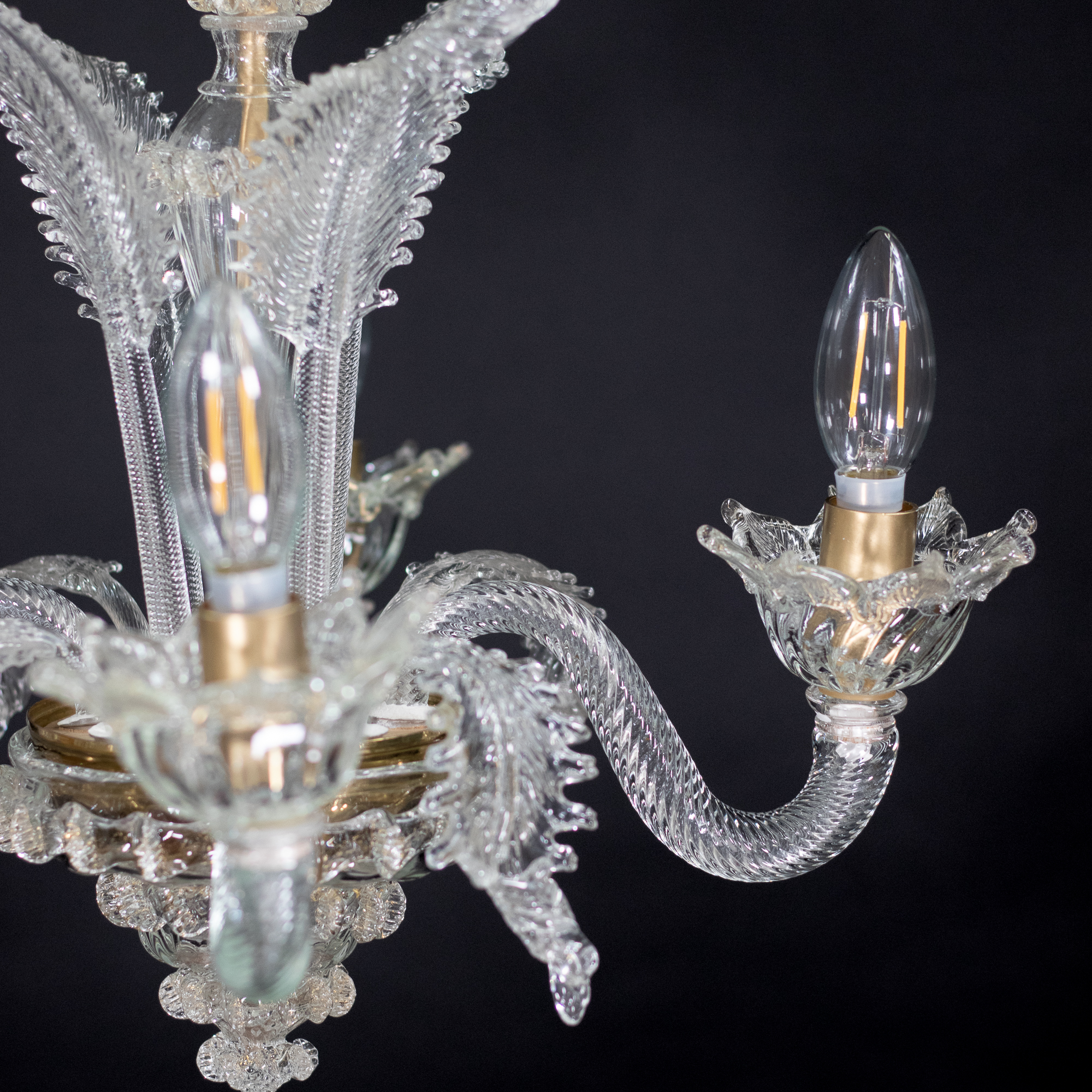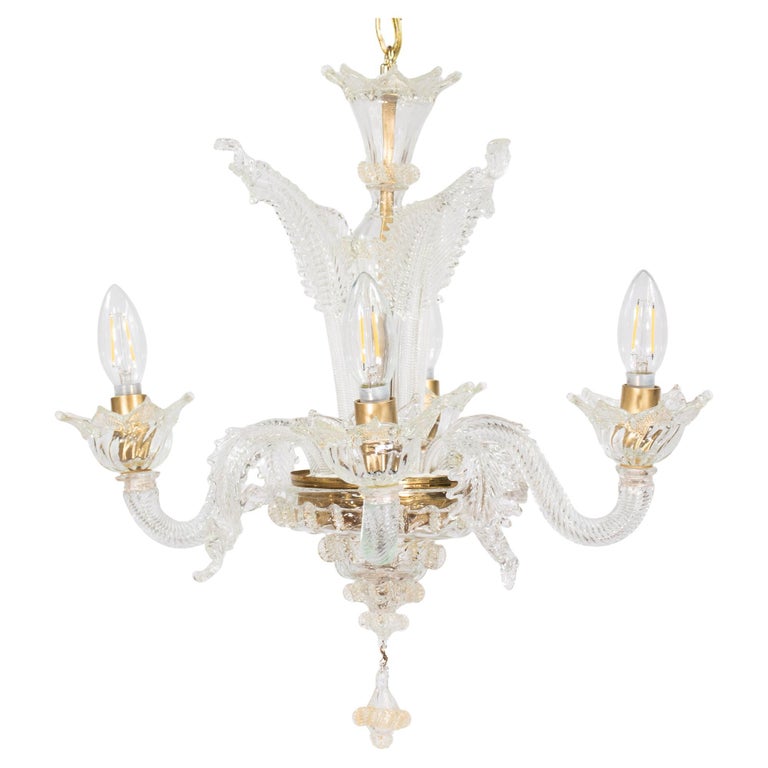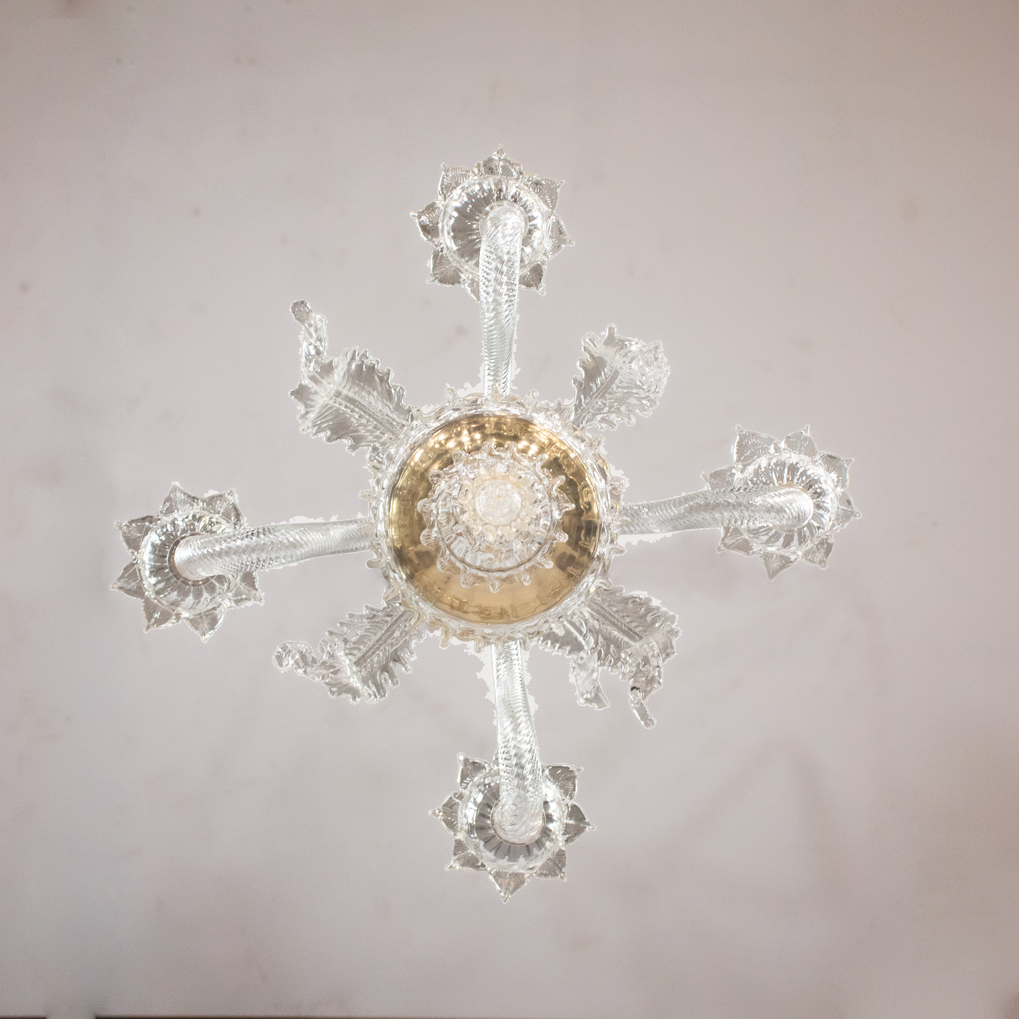 The glass houses on the island of Murano are renowned for their highly ornamented glass chandeliers made of pincered and molded blown glass. This elegant chandelier is a vintage, pared-down interpretation of the ‘Ca’Rezzonico’ style of chandeliers created by Giuseppe Briati in the 18th century. The ‘Ca’Rezzonico’ style is named after the Venetian palace, now a public museum dedicated to 18th-century Venice, where Briati’s initial masterpiece resides. The body and arms of this piece are made of clear, colorless glass enhanced with 24-karat gold leaf. The subtle glints of gold concentrated on the trims and details mimic the look of sunbeams when lit. Otherwise, the translucent crystalline glass blends seamlessly with any color palette.