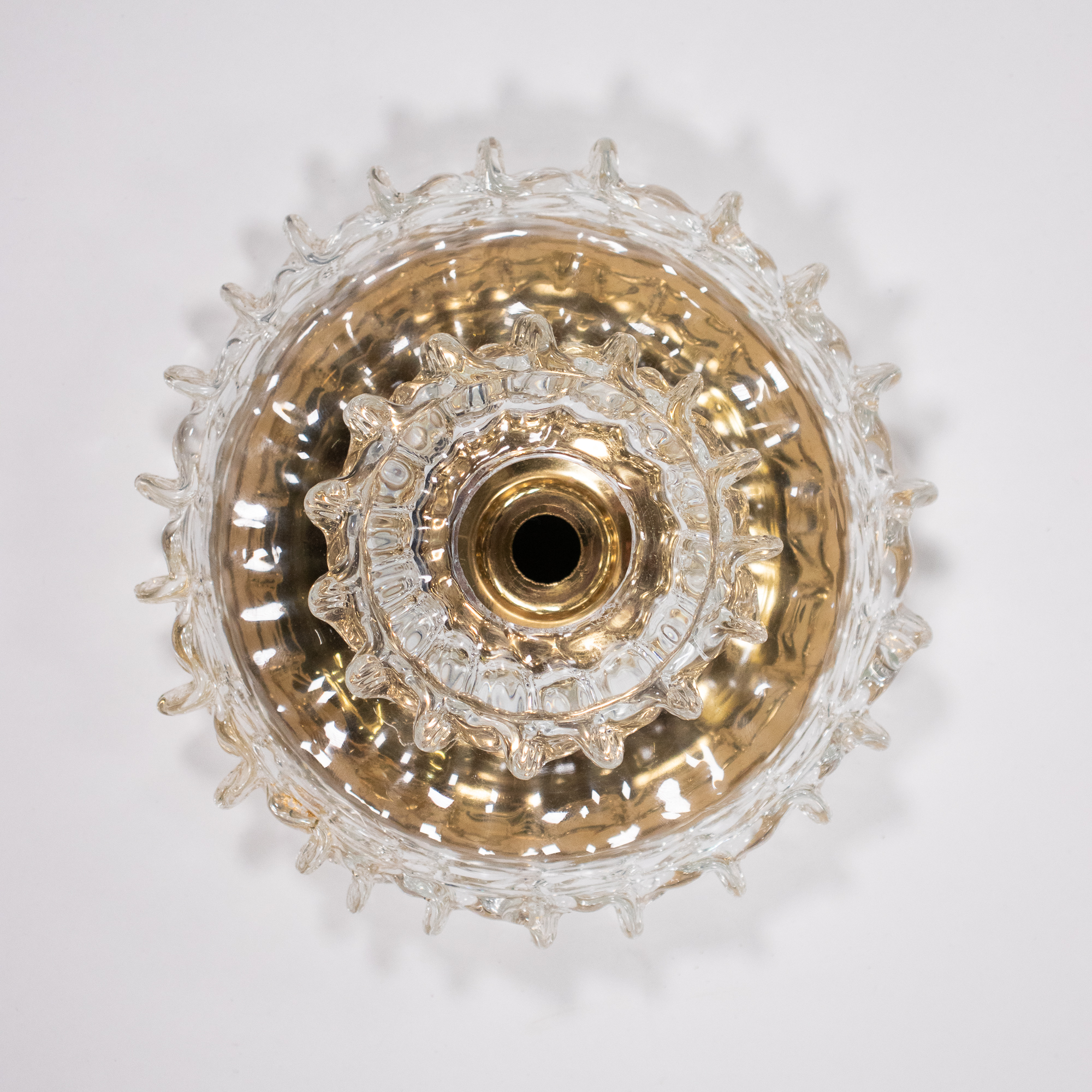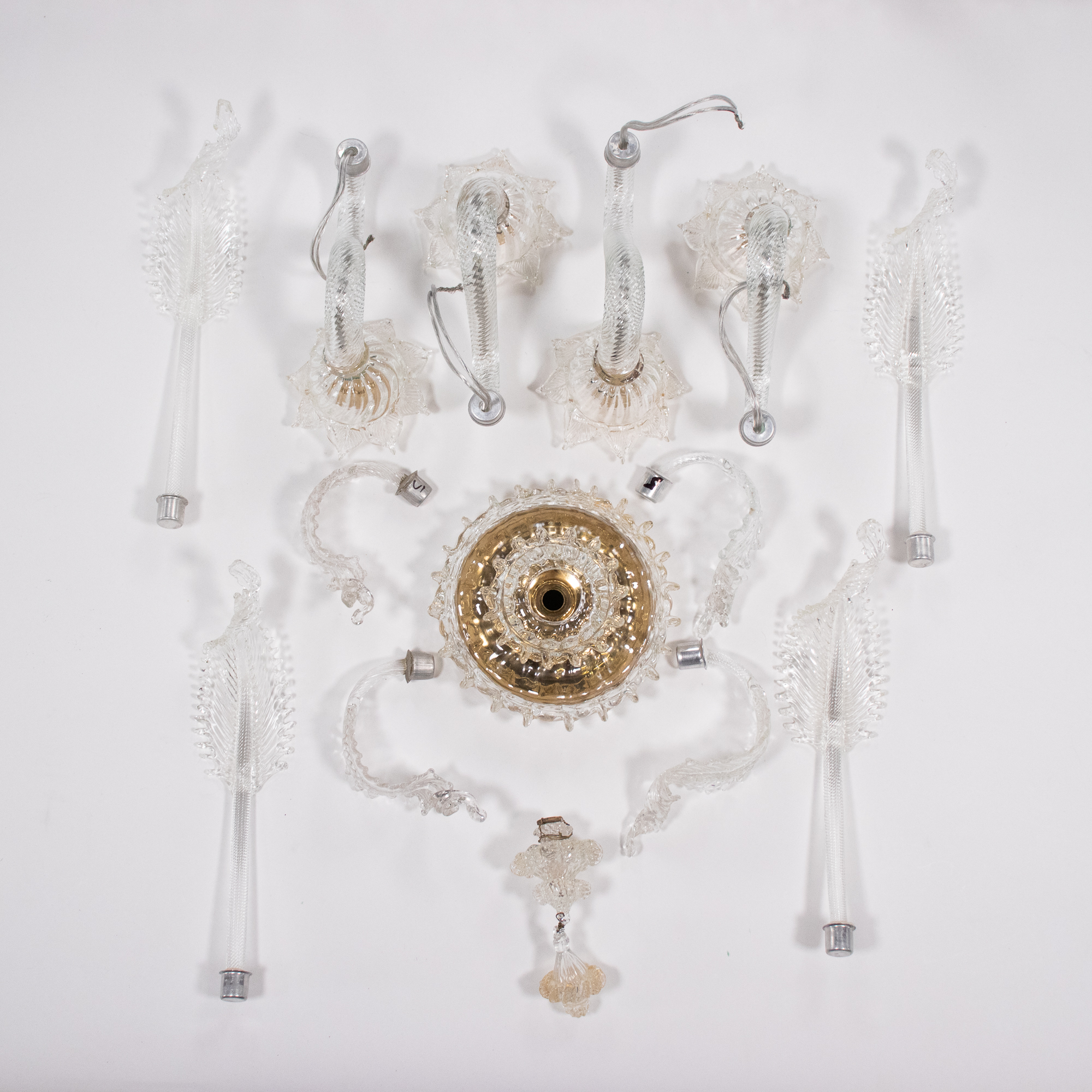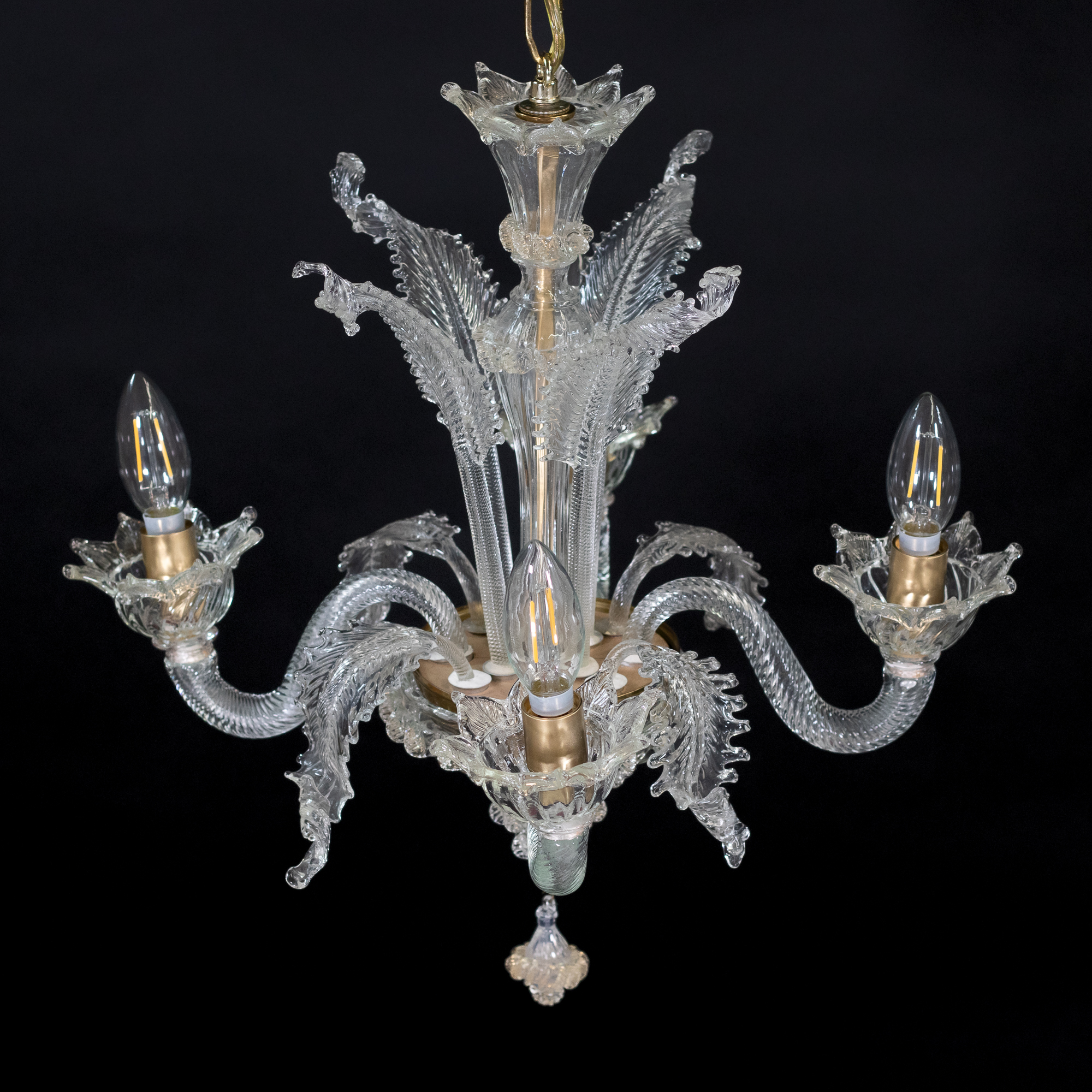 The glass houses on the island of Murano are renowned for their highly ornamented glass chandeliers made of pincered and molded blown glass. This elegant chandelier is a vintage, pared-down interpretation of the ‘Ca’Rezzonico’ style of chandeliers created by Giuseppe Briati in the 18th century. The ‘Ca’Rezzonico’ style is named after the Venetian palace, now a public museum dedicated to 18th-century Venice, where Briati’s initial masterpiece resides. The body and arms of this piece are made of clear, colorless glass enhanced with 24-karat gold leaf. The subtle glints of gold concentrated on the trims and details mimic the look of sunbeams when lit. Otherwise, the translucent crystalline glass blends seamlessly with any color palette.