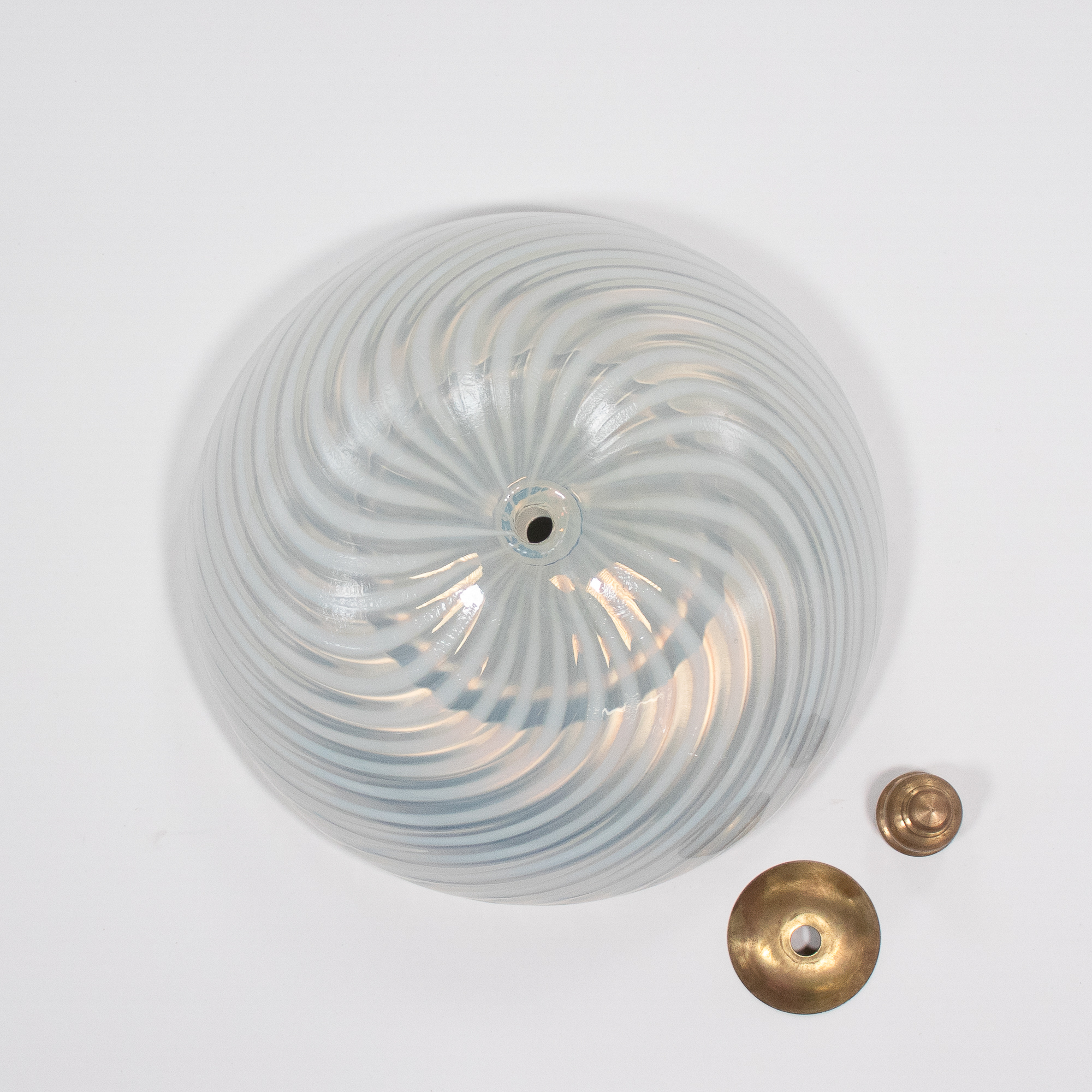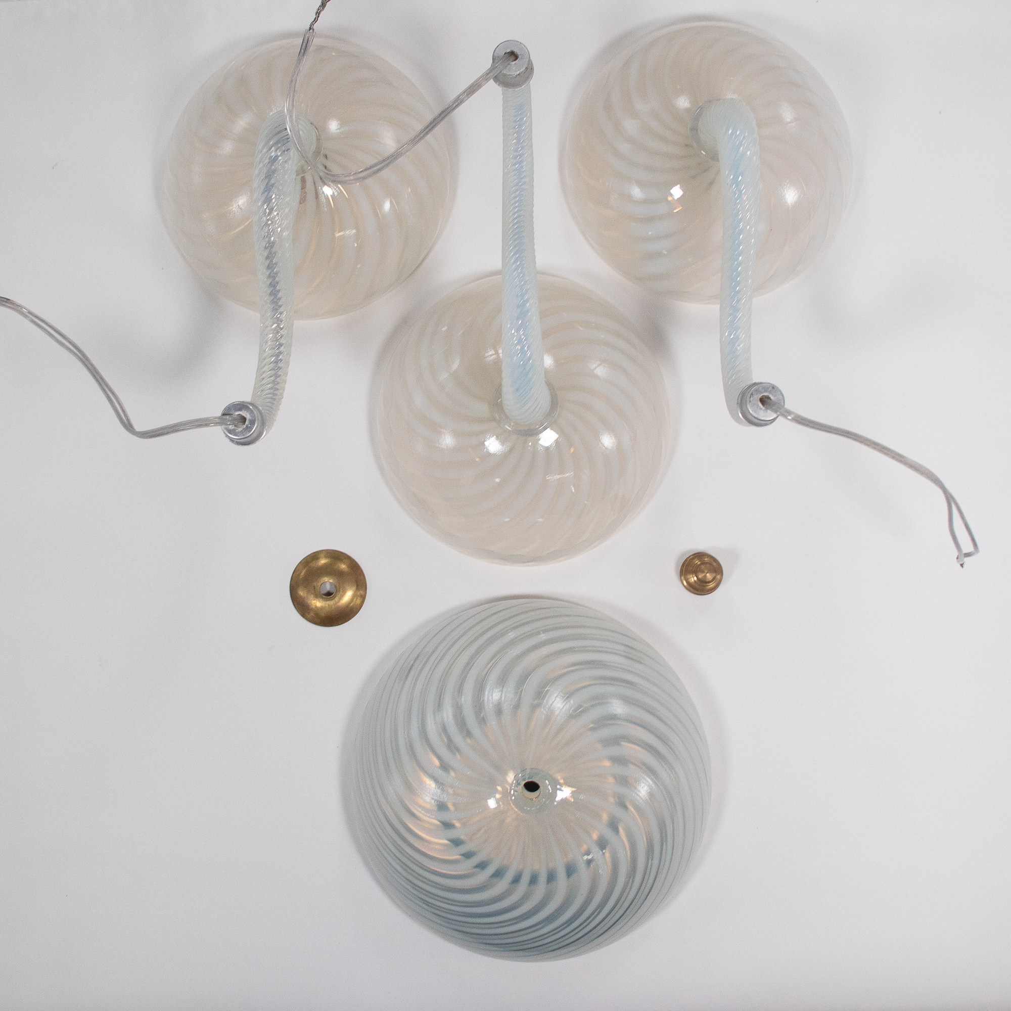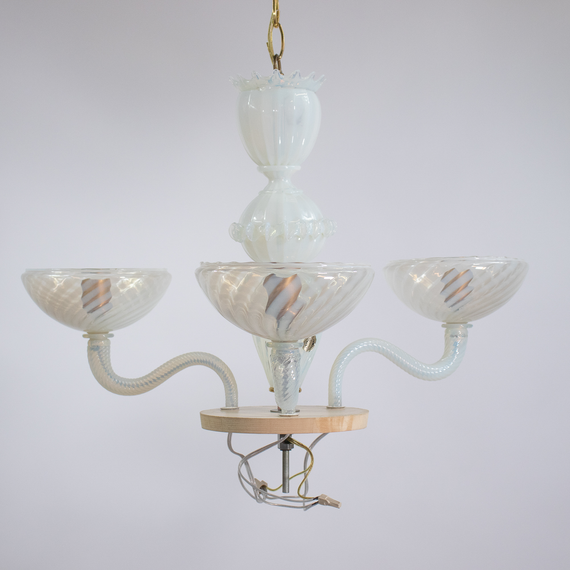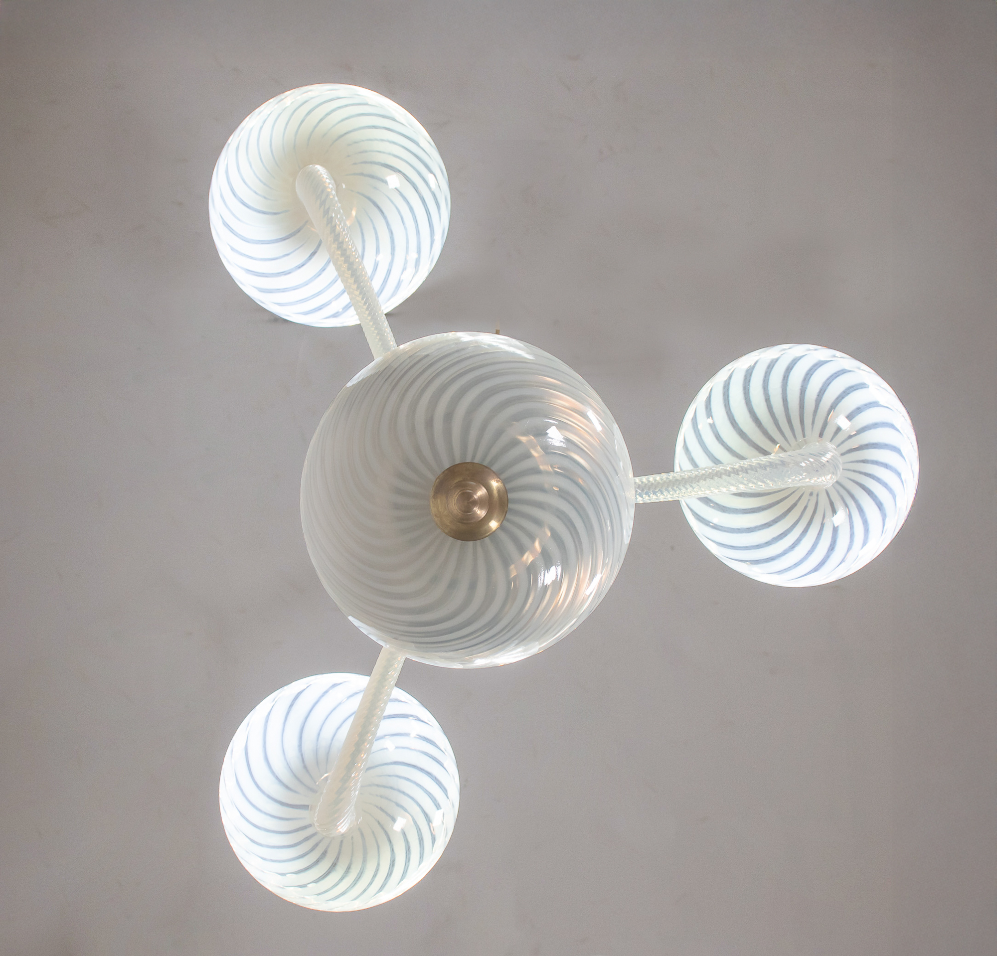 Three scrolling arms sweep outward with a supple, ribbed texture, each culminating in a shallow, fluted bobeche whose spiral pattern echoes the body. Brass accents, including the lower finial and sockets, introduce a mellow contrast to the cool opaline tones. Airy yet substantial, the piece captures the elegance of Venetian craftsmanship and brings an ethereal, diffused radiance reminiscent of clouds to entryways, dining spaces, or bedrooms.