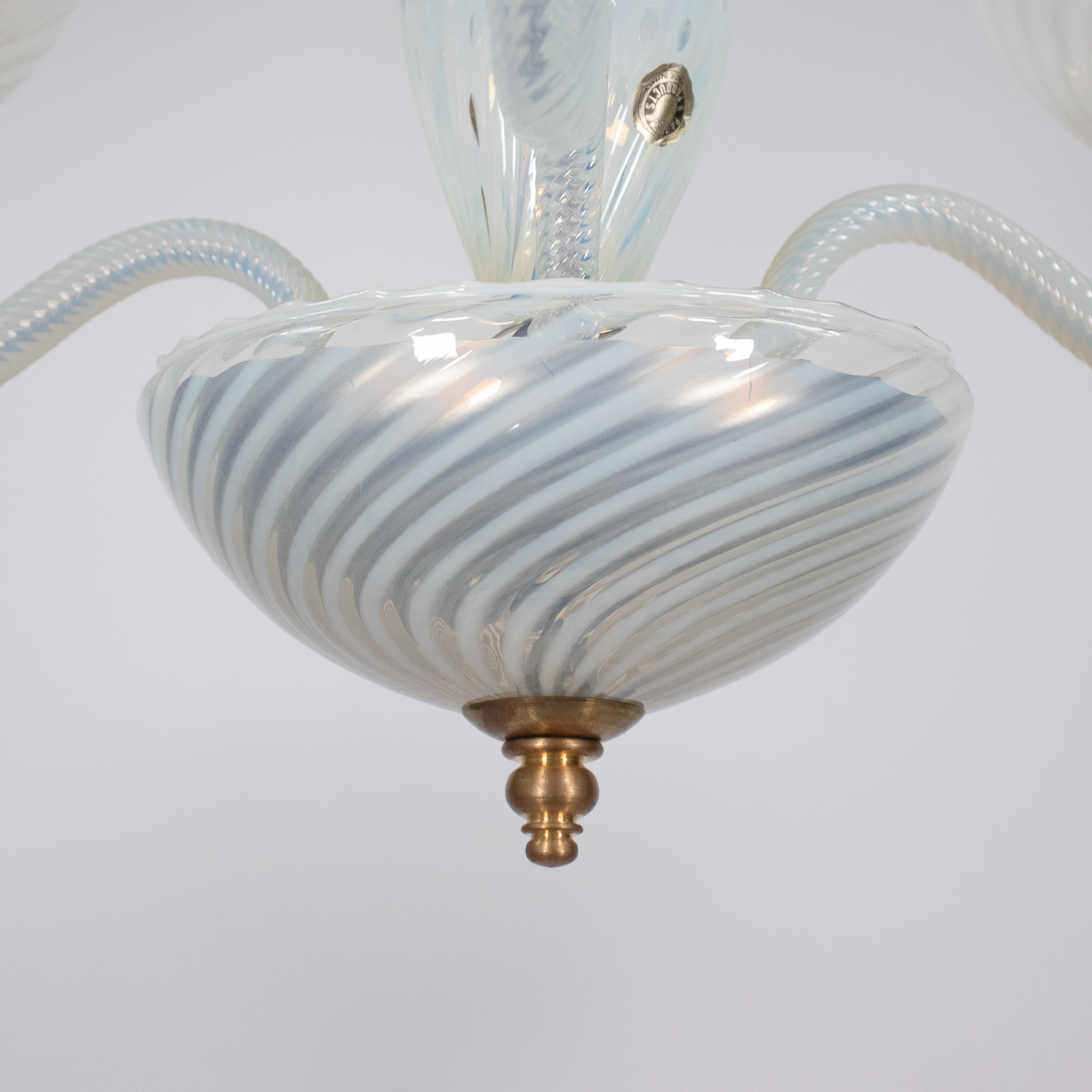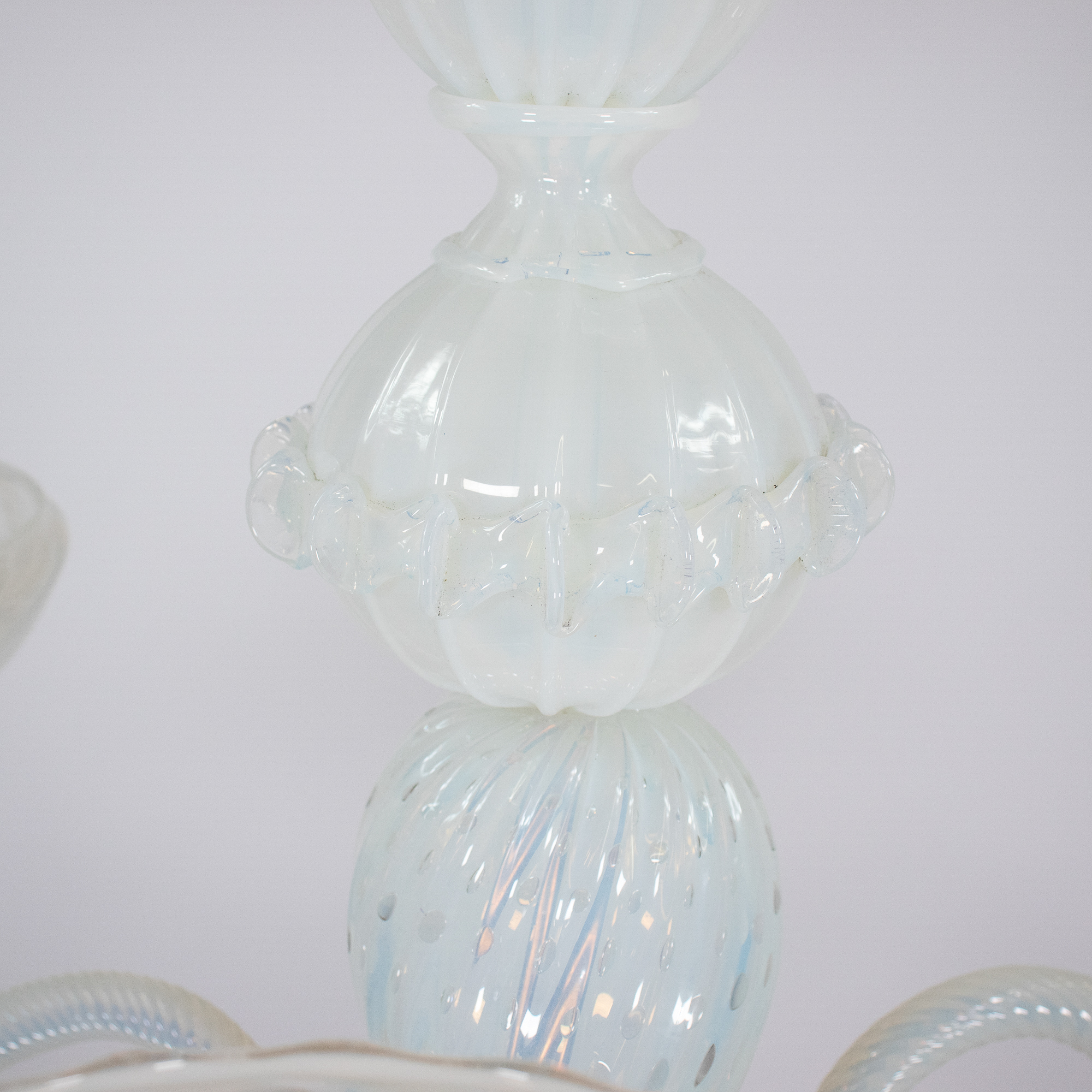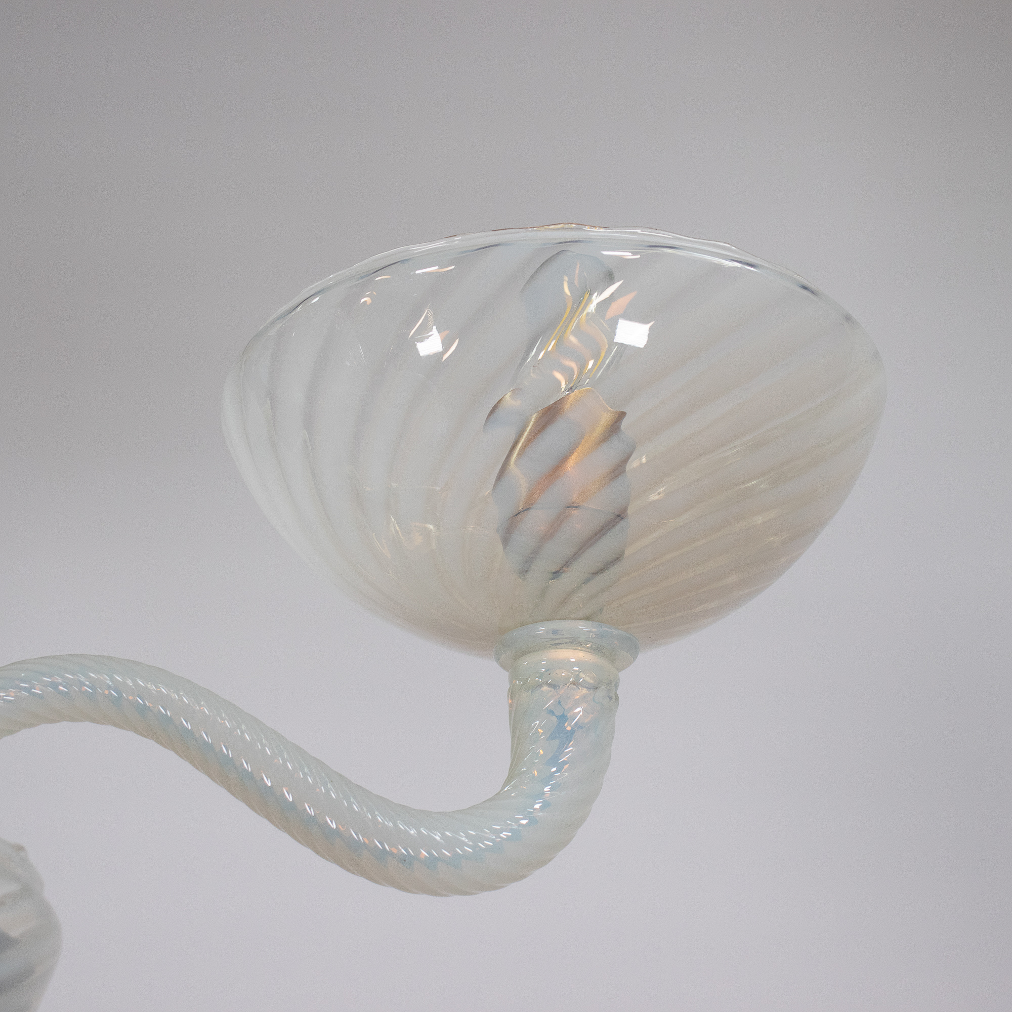 This hand‑blown Murano chandelier presents a refined opaline Filigrana palette, its milky translucence laced with soft spiral striping that glows warmly when lit. The union of opaline glass and filigrana is among the most intricate Murano techniques, requiring the control and expertise of master glassblowers to achieve the delicate balance of milky depth and crisp spiral clarity. The sculptural central column is composed of stacked, baluster‑like elements, rising to a scalloped corona and descending to a generous lower bowl. That lower section is distinguished by controlled bubbles and vertical ribbing, details that lend depth and a gentle shimmer across the surface.