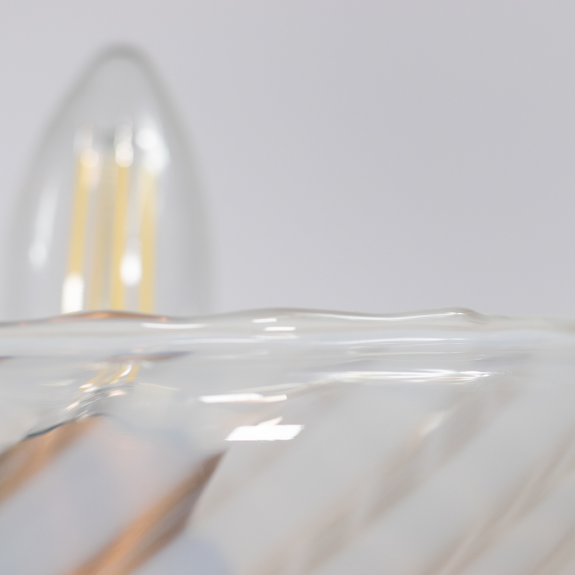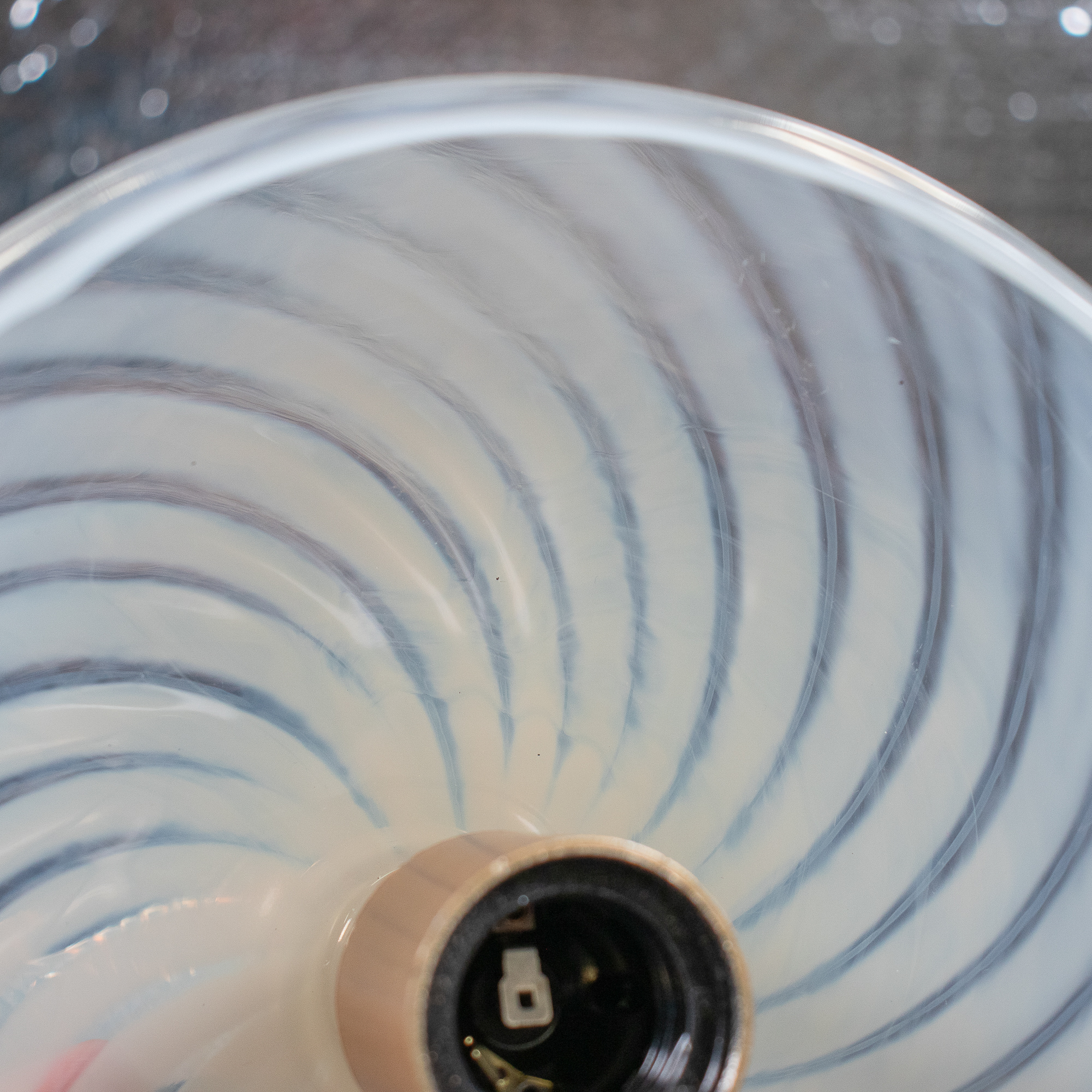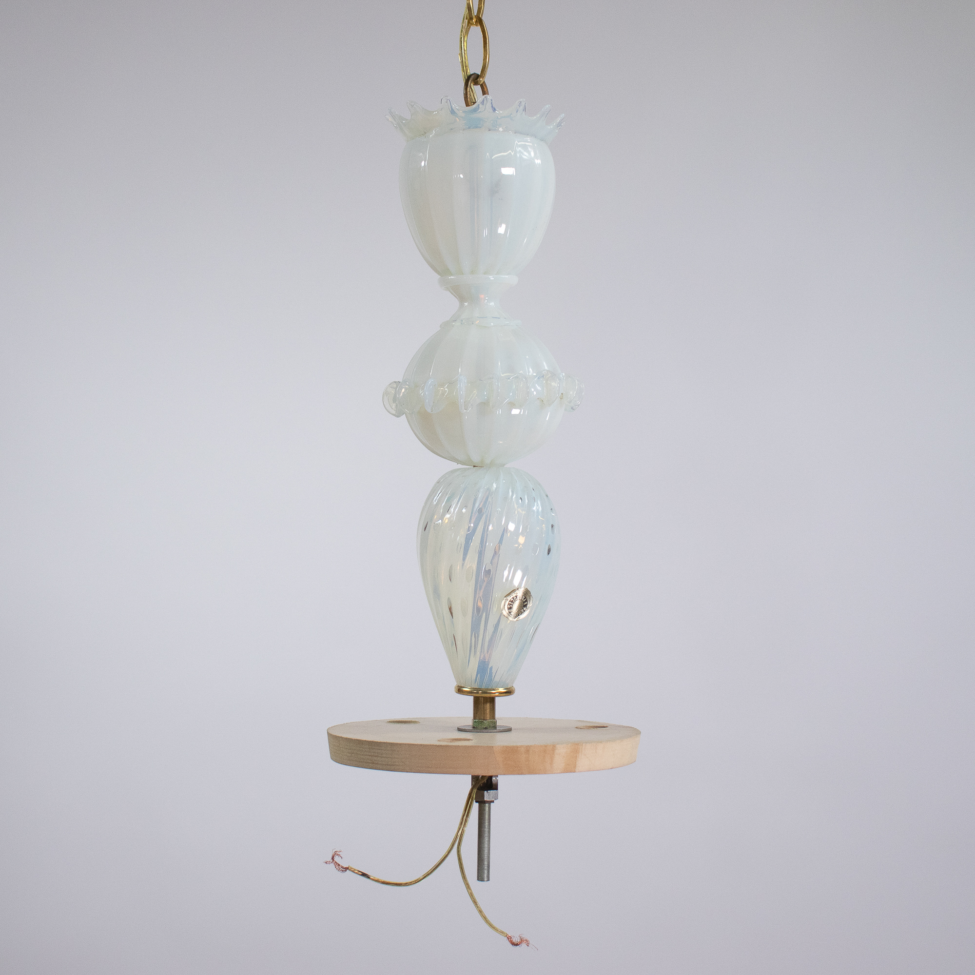 This hand‑blown Murano chandelier presents a refined opaline Filigrana palette, its milky translucence laced with soft spiral striping that glows warmly when lit. The union of opaline glass and filigrana is among the most intricate Murano techniques, requiring the control and expertise of master glassblowers to achieve the delicate balance of milky depth and crisp spiral clarity. The sculptural central column is composed of stacked, baluster‑like elements, rising to a scalloped corona and descending to a generous lower bowl. That lower section is distinguished by controlled bubbles and vertical ribbing, details that lend depth and a gentle shimmer across the surface.